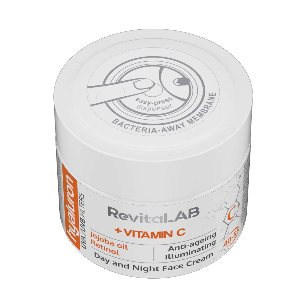 RevitaLAB Hyaluron Anti-Ageing Tages- und Nachtcreme, angereichert mit den Vitaminen C, Jojoba-Öl und UV-Filtern, für Alter zwischen 40 und 55, 50 ml