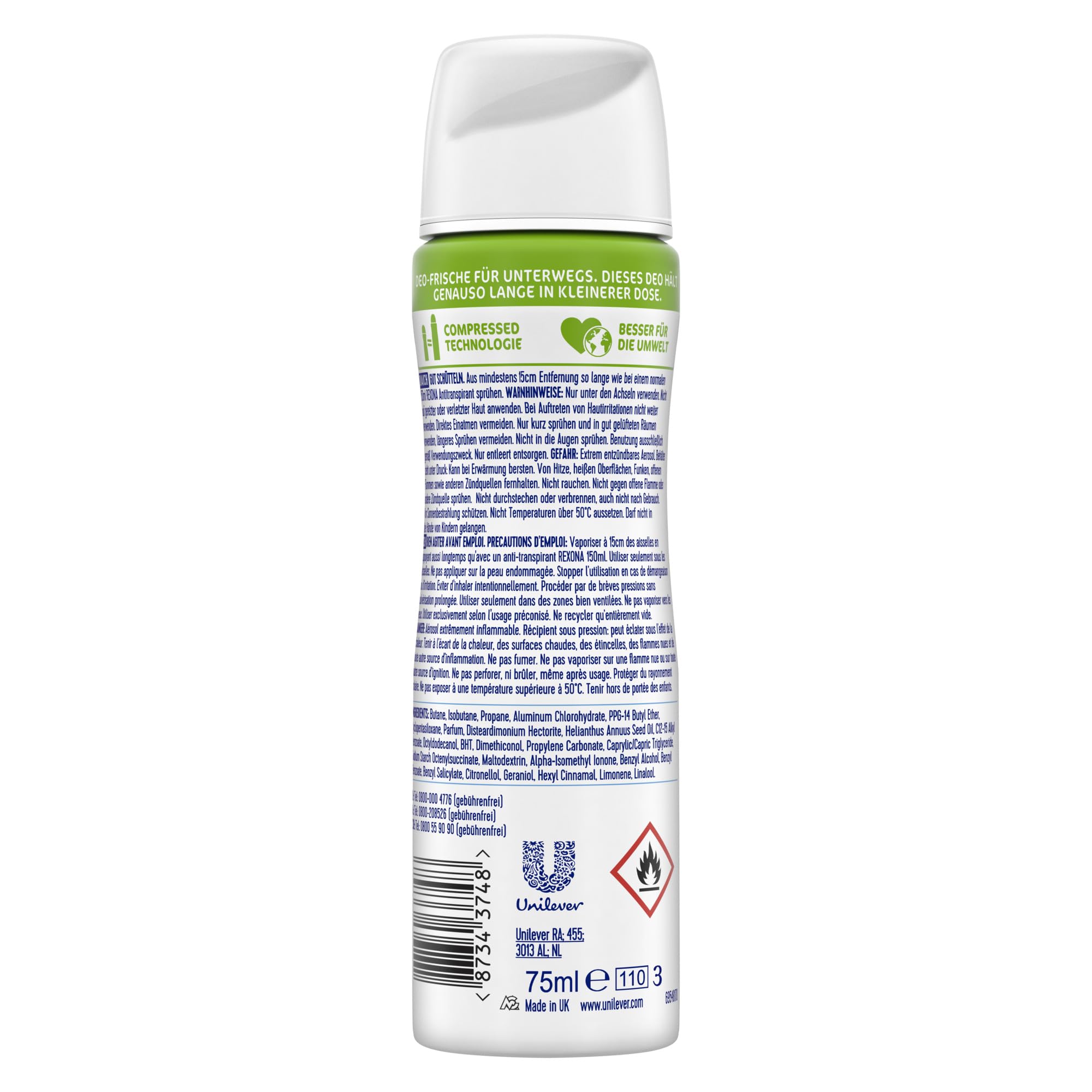 Rexona Cotton Dry Compressed ist ein Anti Transpirant Deospray in praktischer Reisegroesse, das bis zu 48 Stunden vor Schweiss und Koerpergeruch schuetzt. Der Duft ist klassisch-feminin und dezent und sorgt fuer ein sauberes, wohltuendes Frischegefuehl. Die MotionSense-Technologie ist auf Bewegung ausgelegt: Je mehr du dich bewegst, desto mehr Schutz und Frische werden freigesetzt (Herstellerprinzip). Nach dem Auftragen bleiben feine MotionSense-Mikrokapseln auf der Haut und geben bei Bewegung nach und nach zusaetzliche Frische ab.