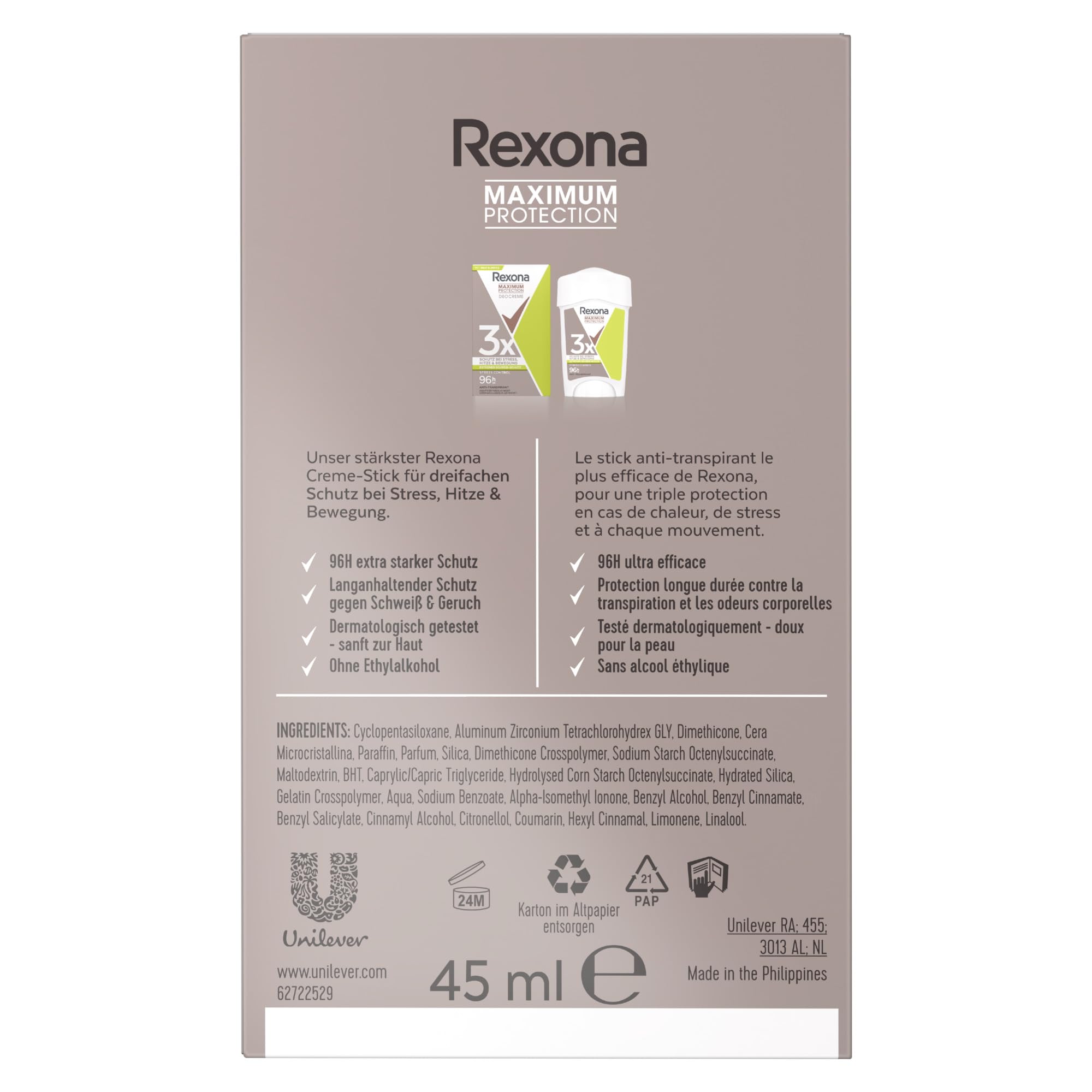 Rexona Women Maximum Protection Deo Creme Stress Control ist ein Anti Transpirant fuer starkes Schwitzen mit 3x Schutz bei Stress, Hitze und Bewegung. Es schuetzt bis zu 96 Stunden vor Schweiss und Koerpergeruch und ist fuer Situationen gedacht, in denen normaler Schutz nicht reicht. Die patentierte Technologie verteilt aktive Bestandteile auf der Hautoberflaeche, die sich mit koerpereigener Feuchtigkeit verbinden und eine Gel-Schicht ueber den Schweissdruessen bilden. Der Duft ist erfrischend zitrisch. Der Creme-Stick ist ohne Ethylalkohol, dermatologisch getestet und als sanft zur Haut beschrieben.