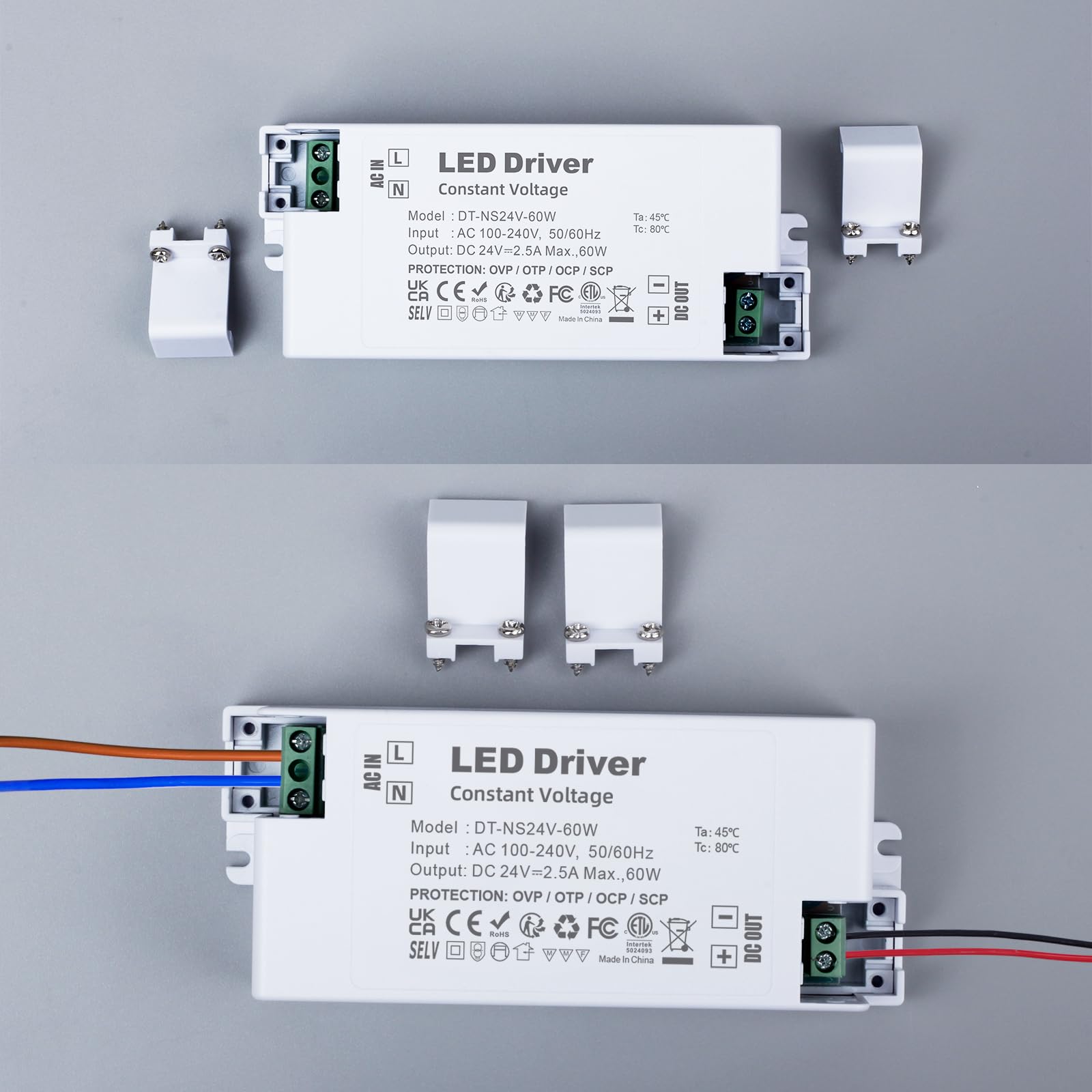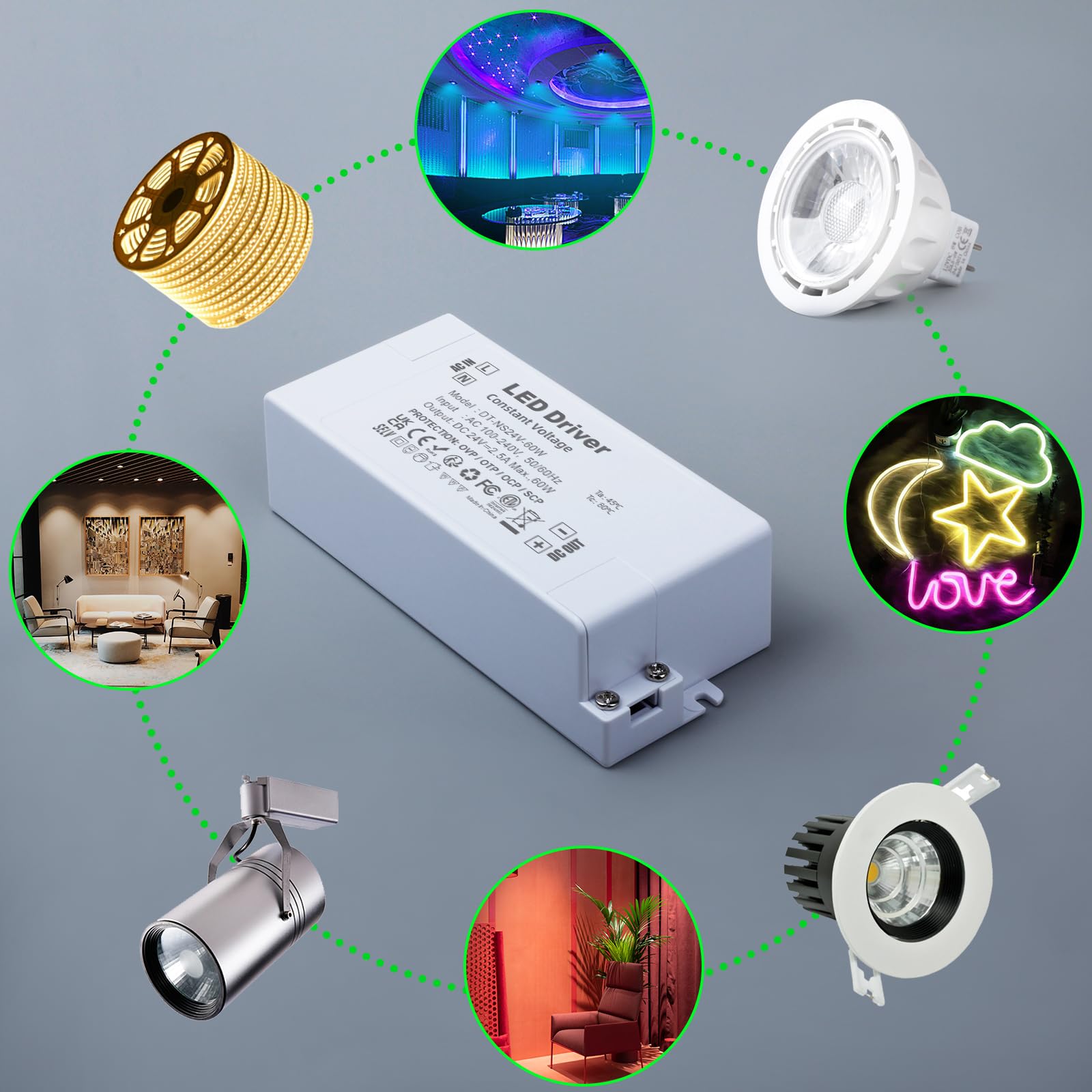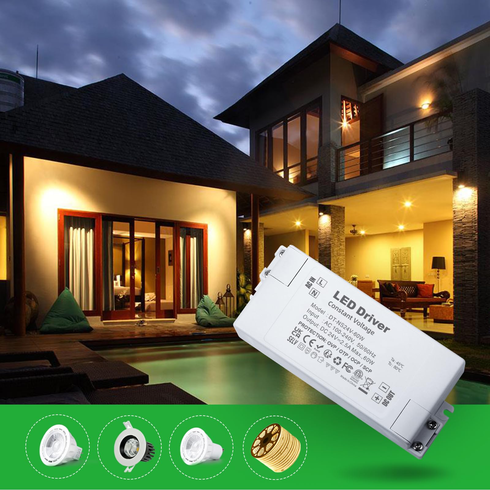 LED Trafo 24V 60W, Trafo 230V auf 24V LED Netzteil AC/DC Schaltnetzteil 2.5A, Konstantspannungs LED Transformator, LED Treiber 24V, LED Niedervolttrafo für MR16 GU5.3 MR11 G4 Glühbirne en LED Lichtstreifen Trafo für LED Eingangsspannung: AC 100-240V. 50/60Hz, Konstantspannungs Ausgang: DC24V, Ausgangsstrom: 2.5A. Maximale Belastbarkeit: 60 Watt. Klasse II kompakter led trafo, led driver für 24Vdc Niederspannungs LED Leuchten. Keine Mindestlast, Kein Transformatorrauschen, Kein LED-Flackern. LED netzteil 24v, kleine Bauweise, Sehr kompakt und leicht. 24v dc led trafo kann an einem trockenen oder feuchten Ort installiert werden, geeignet für LED Leuchtenanwendungen im Innenbereich. IP44 bewertet led treiber 24v. Gehäuse aus schwer entflammbarem ABS-Material und staubdicht. Zuverlässige interne Schaltkreise bieten Überspannungs-, Überhitzungs-, Überstrom- und Kurzschlussschutzfunktionen, Hochwertiges Netzteil für LED Beleuchtungsprojekte. Transformator 230v 24v led trafo für G4, GU5.3, MR11, MR16, LED-Lichtleisten und andere Geräte, 24v Stromversorgung benötigen.