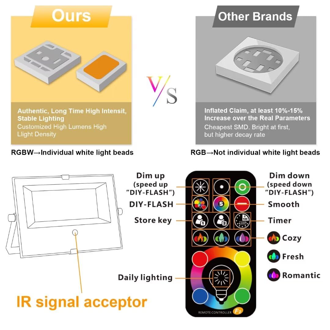 Fernbedienung1. Mehrere Farboptionen: Sie können Ihre Lieblingsfarbe wählen.2. 4 Modi einstellen: (glatt, romantisch, gemütlich, frisch)3. Helligkeitsanpassung4. DIY-FLASH→Geschwindigkeitsanpassung5. Kaufen Sie mehr als eine Leuchte. Alle Leuchten funktionieren mit einer Fernbedienung.SpeicherfunktionUnser RGB Flood Light mit Speicherfunktion. Die Farbe und der Modus bleiben beim Aus- und Einschalten auf der vorherigen Einstellung.24Hours TimerDer Scheinwerfer kann das Timing einstellen (24Hours) um Energie zu sparen.. Das Licht wird jeden Tag nach dem Einstellen ein- und ausgeschaltet. Sie müssen es nicht immer wieder einstellen.Hohe Helligkeit50-W-LED-Flutlicht kann zur täglichen Beleuchtung und zur Beleuchtung von Sportplätzen, Wohngebieten, Villen, Gärten, Gebäuden, Theaterbühnen, der Aussenseite von Gebäuden und der Festivaldekoration usw. Verwendet werdenSicherheit und Langlebigkeit1. Panel und gehärtetes Glas aufrüstenNeues aktualisiertes reflektierendes Panel, das zur Verbesserung des Lichtreflexionsvermögens beiträgt.2. Kühlkörperrippen aufrüstenEntziehen Sie effizient mehr Wärme und verlängern Sie die Lebensdauer Ihres LED-Scheinwerfers. RGB LED Strahler kann für halloween deko indoor, halloween deko outdoor, herbstdeko outdoor, halloween deko garten, deko halloween, halloween dekoration, helloween dekoartikel, halloween party deko