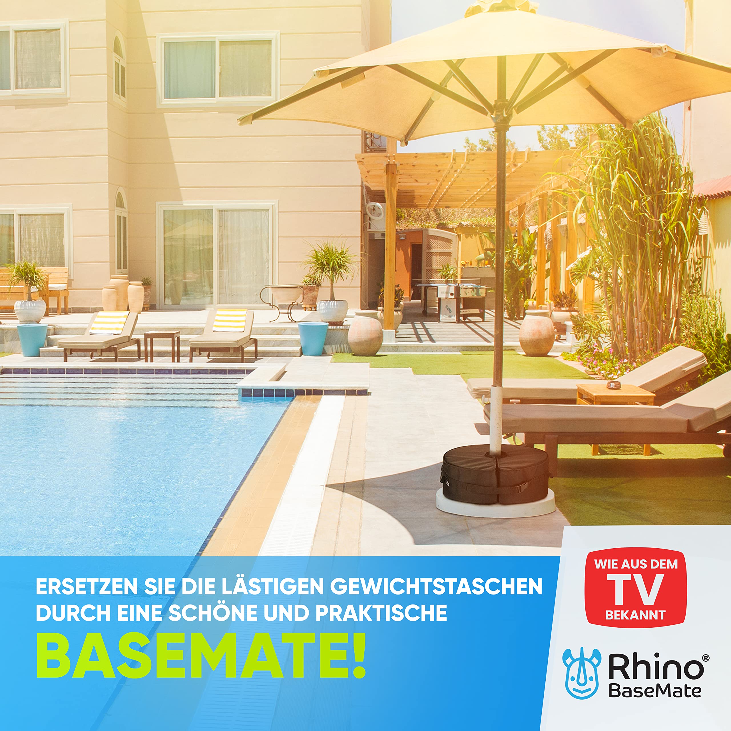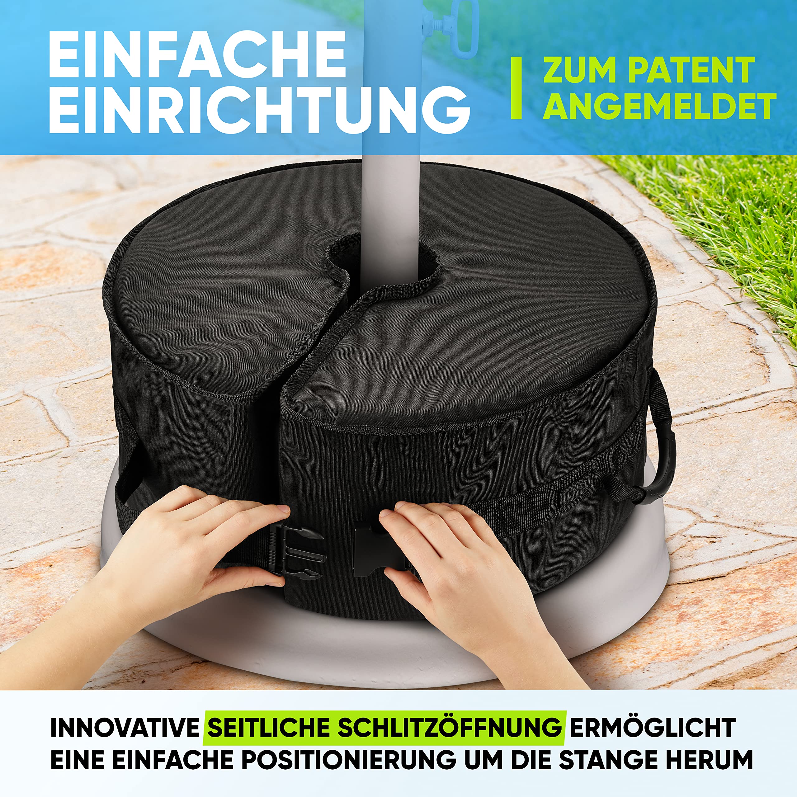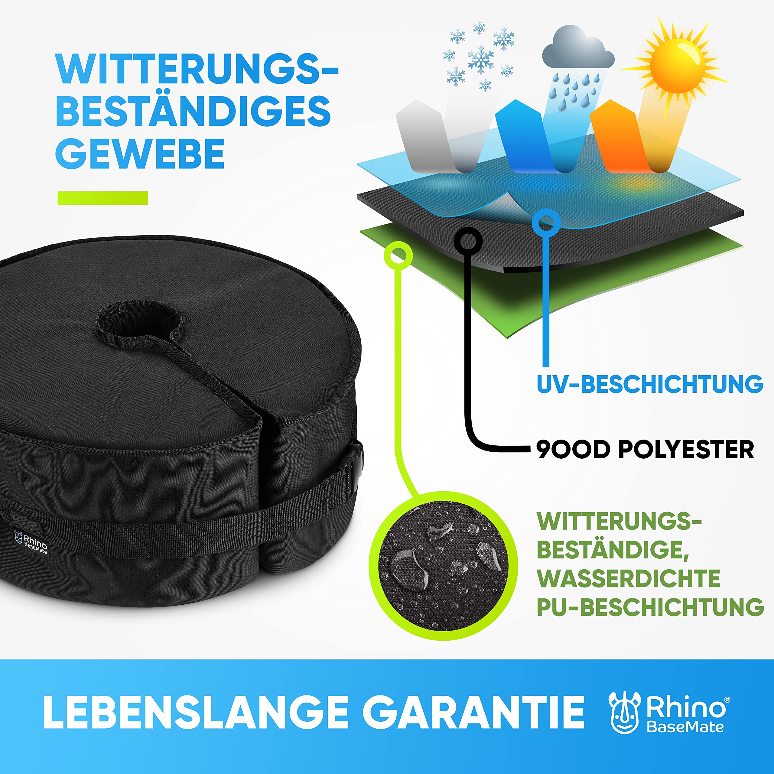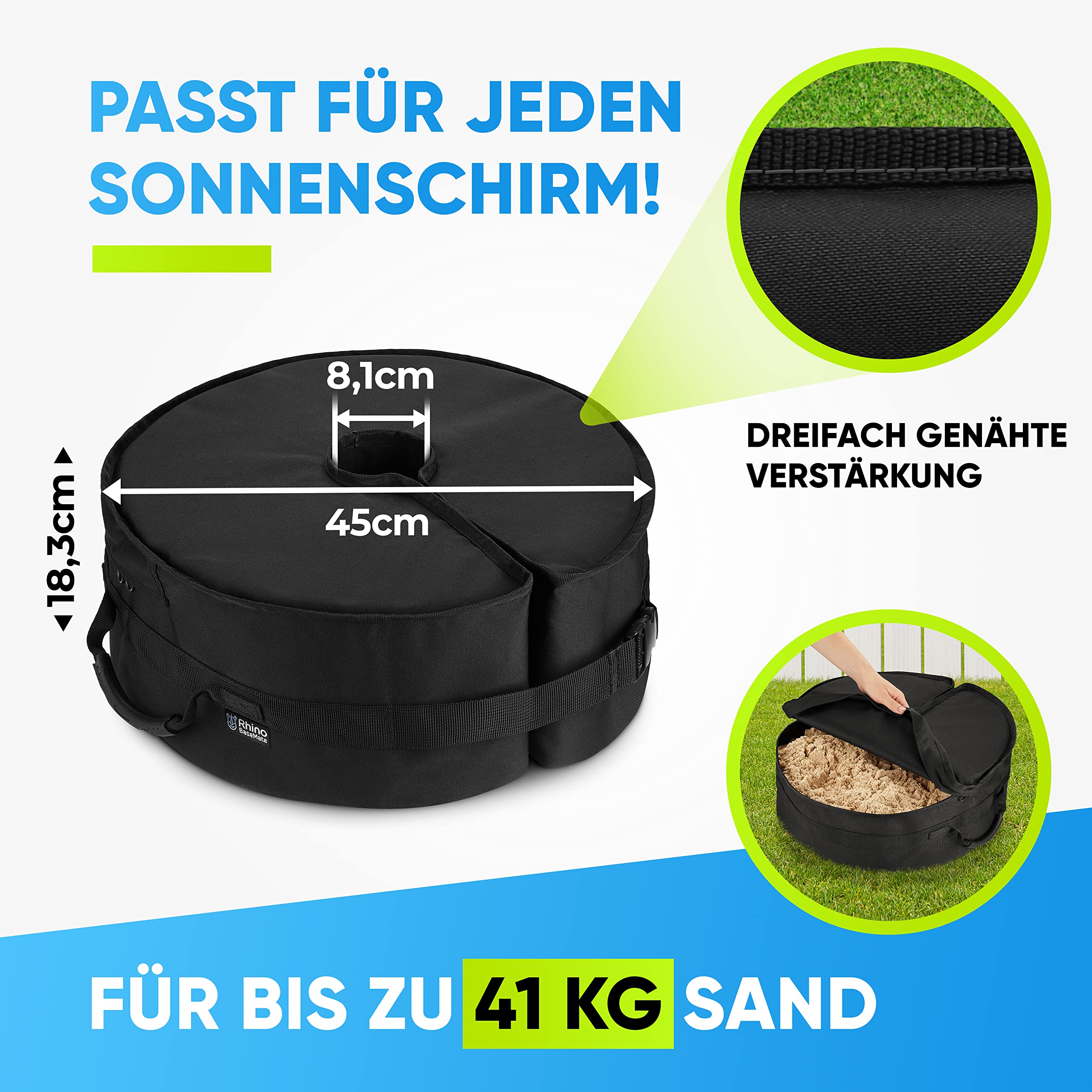 Windige Tage? Mit diesem stabilen, ergonomisch geformten Schirmständer sind sie kein Problem mehr. Schützen Sie Ihre teuren Gartenmöbel, verhindern Sie Verletzungen und geniessen Sie eine unbeschwerte Entspannung im Freien. Wenn Sie jemals Ihren Terrassentisch oder freitragenden Regenschirm von einer böigen Brise überwältigt haben, brauchen Sie die Rhino BaseMate Gewichtstasche. Es ist eine intelligentere Variante traditioneller Basen, die nicht nur schwer zu installieren sind, sondern auch nach einigen Monaten reissen, verformen und verblassen. Während die meisten Gewichtssäcke über eine kleine Öffnung verfügen, die es fast unmöglich macht, sie mit Sand zu füllen, hat Ihr neues Basisgewicht eine grosse Öffnung, die Unordnung und Frustration beseitigt. Ausserdem muss die Tasche nicht angehoben werden, sobald sie gefüllt ist. Der seitliche Schlitz ermöglicht ein einfaches Einschieben um die Schirmstange. Anschliessend die Clips verriegeln und fertig. Hält die Schirmstange auch bei starkem Wind stabil.