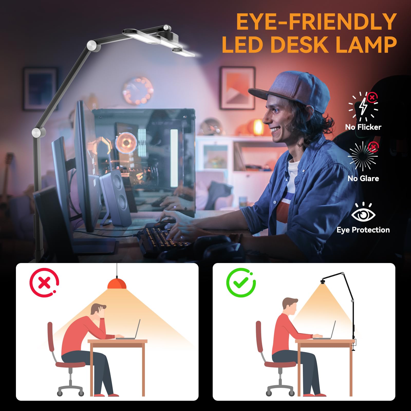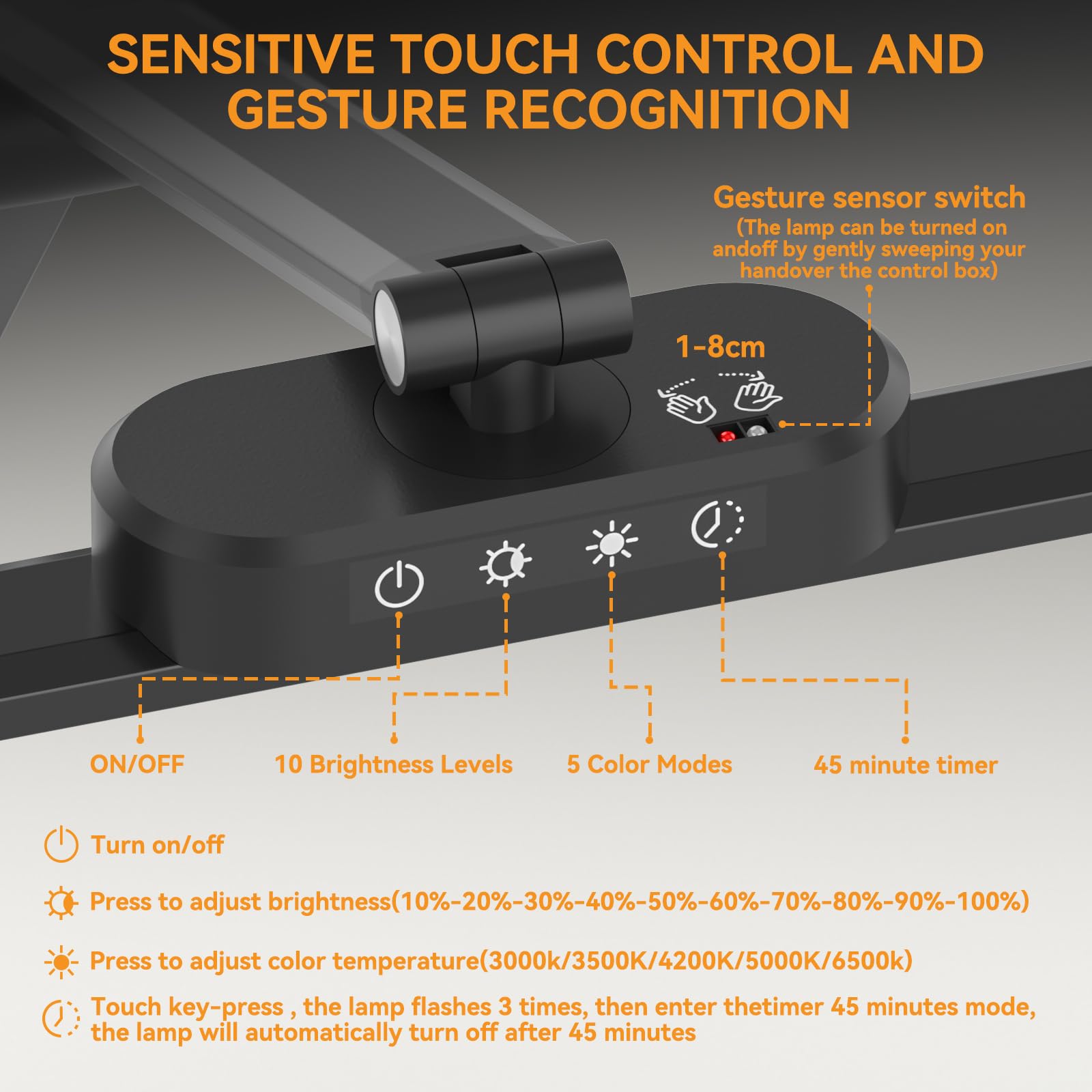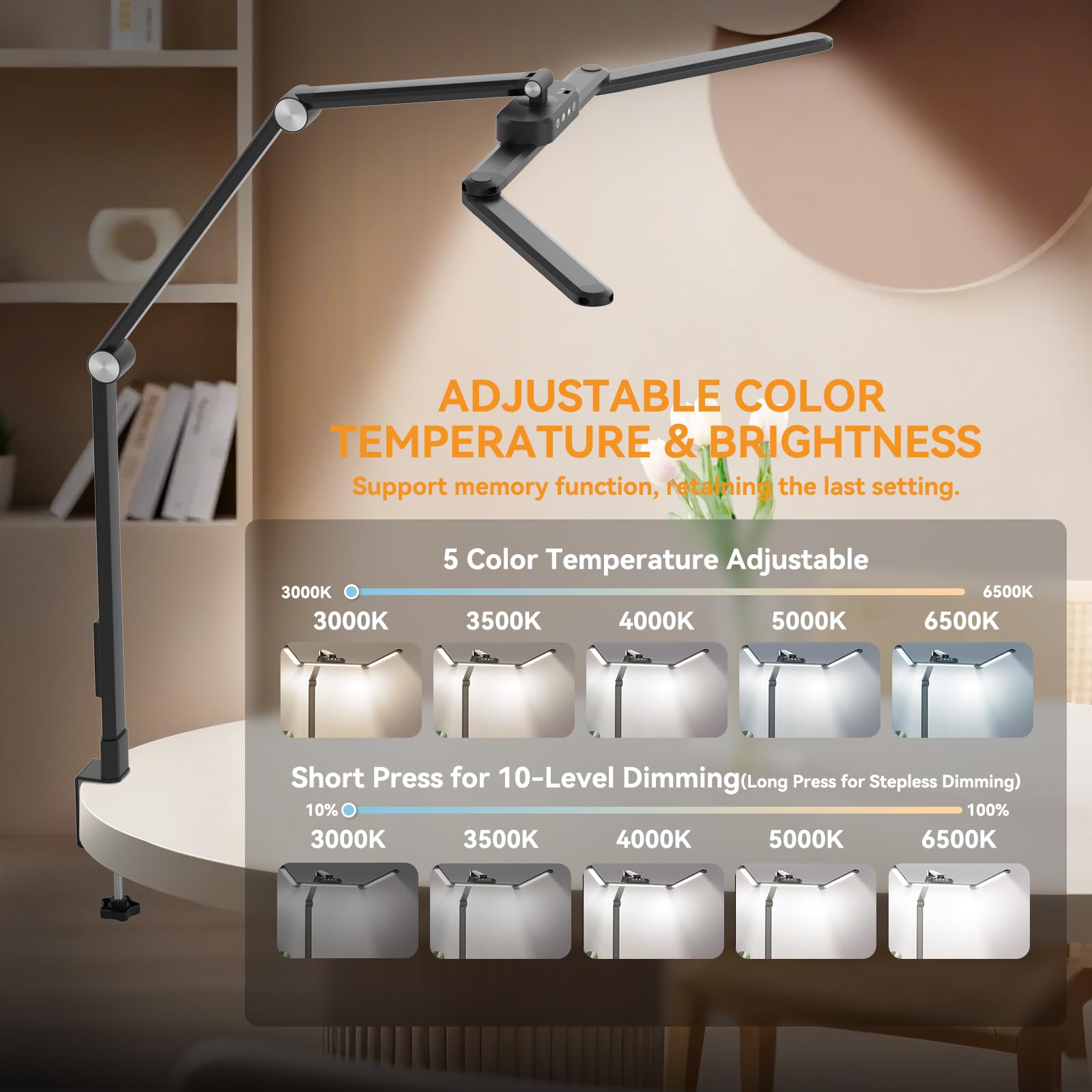 rigors 80cm Schreibtischlampe Klemmbar, Architekten-Tageslichtlampe für das Heimbüro, 24W ultrahelle Schreibtischlampen Gesten-Sensor-Schalter mit 5 Farb 10 Helligkeit,Speicherfunktion für Werkbank