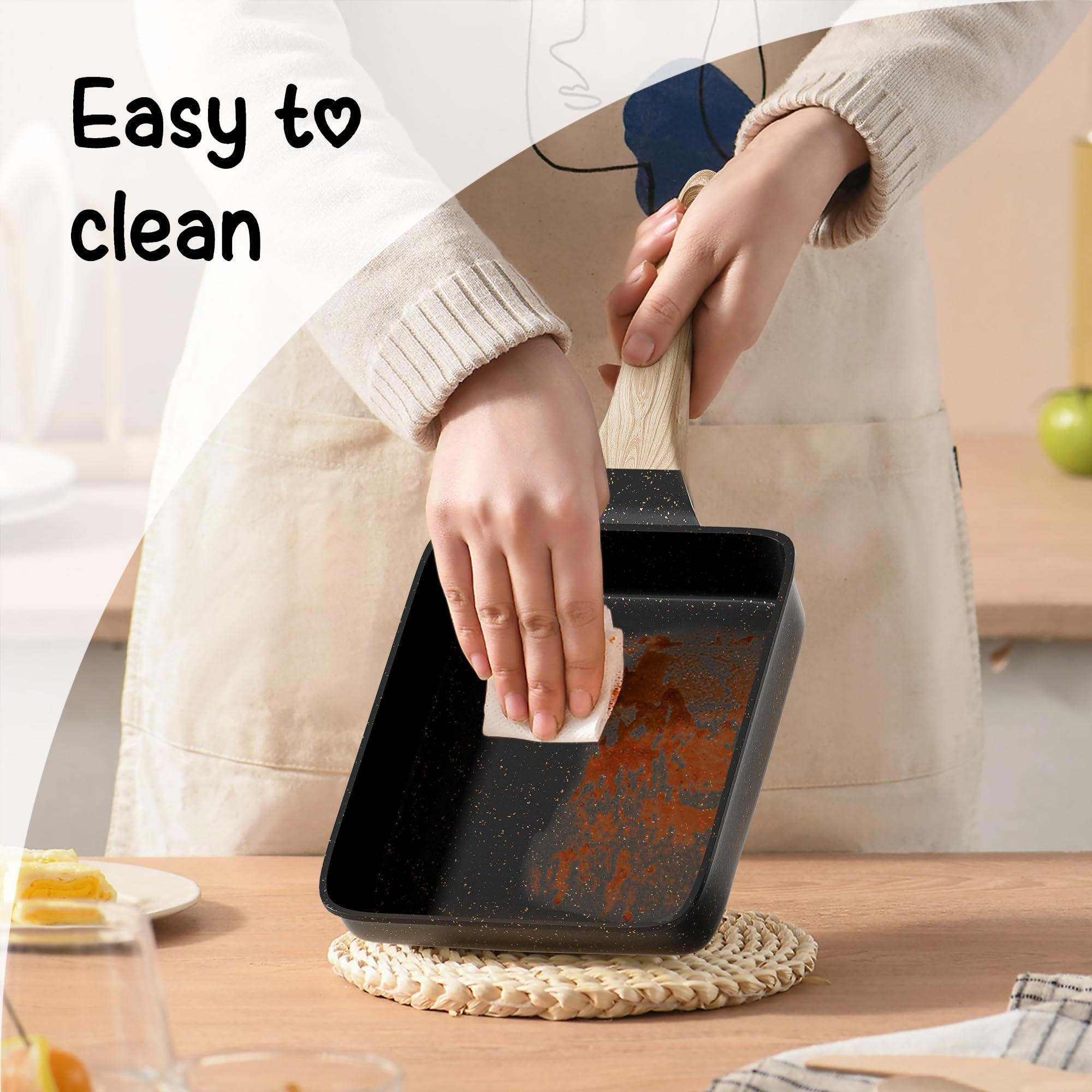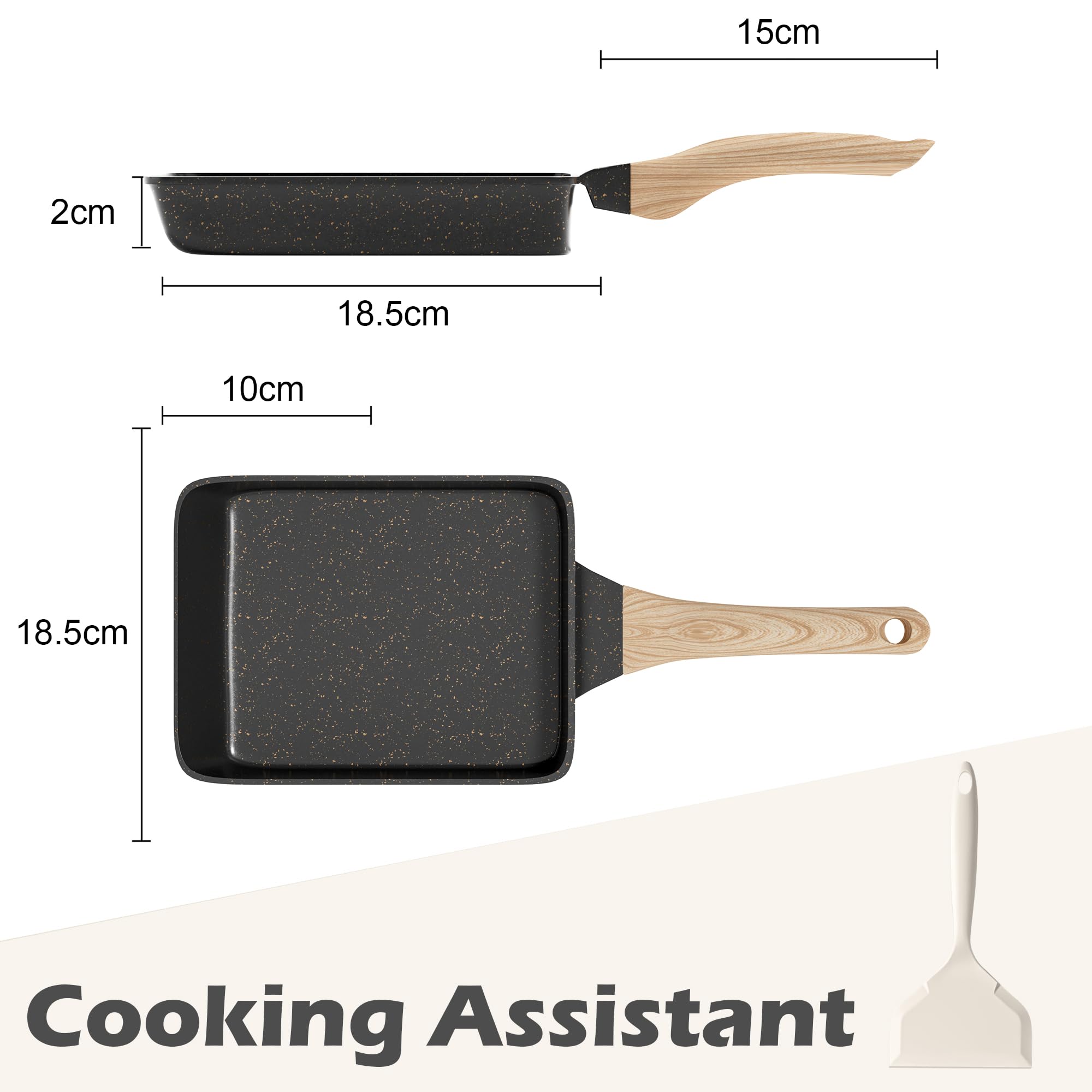 【Design】Wood grain insulated handles with granite non-stick coating combine beauty and practicality. 【Fast】High-quality aluminium alloy body ensures even heating, and a tamago-yaki omelette can be ready in three minutes. 【Easy】Using the complimentary silicone spatula, all you need are eggs and seasoning to finish cooking. 【Convenient】Granite non-stick coating makes it easy to clean and the small size and light weight make it portable. 【Service】As a professional cookware manufacturer, we focus on providing satisfactory products and service to every customer.