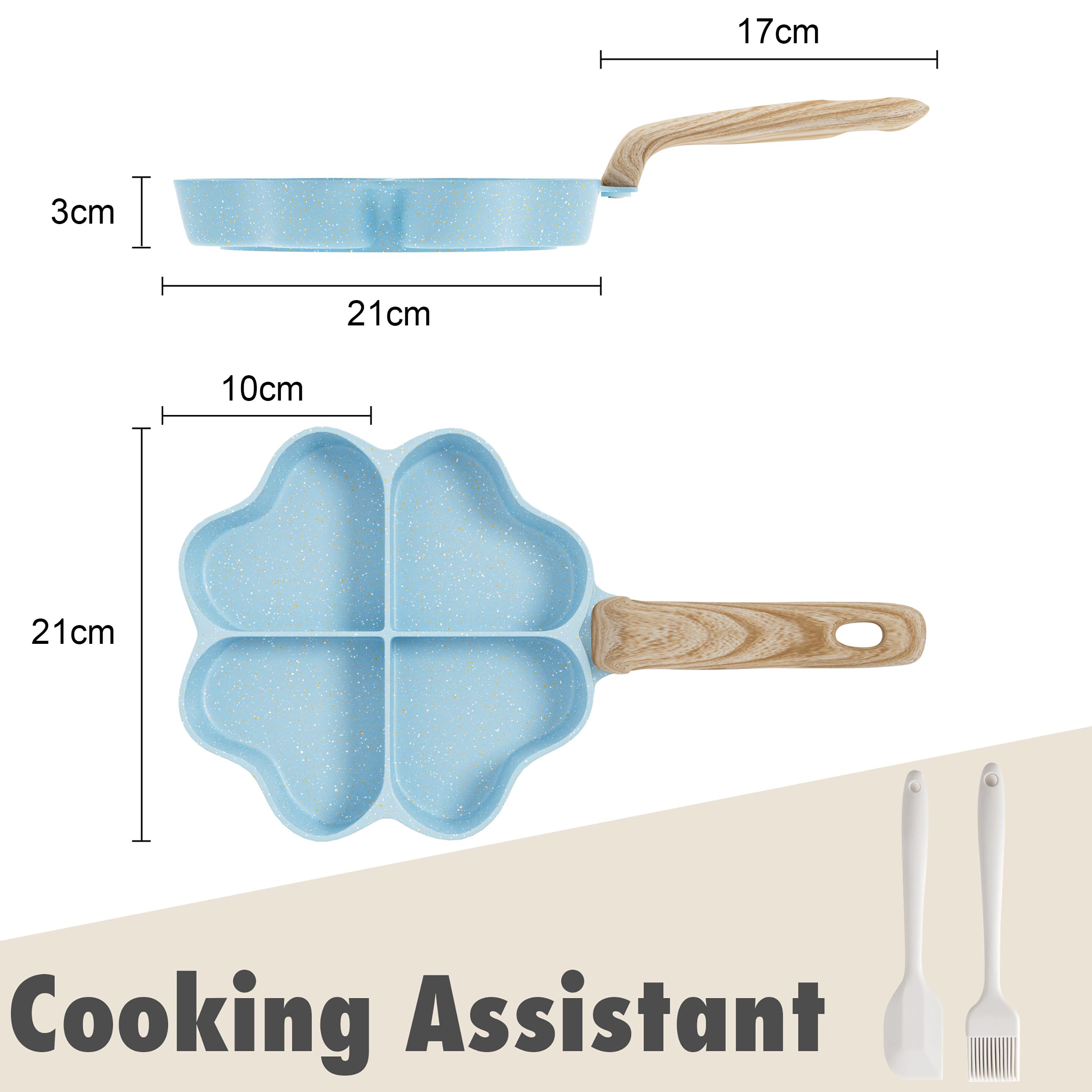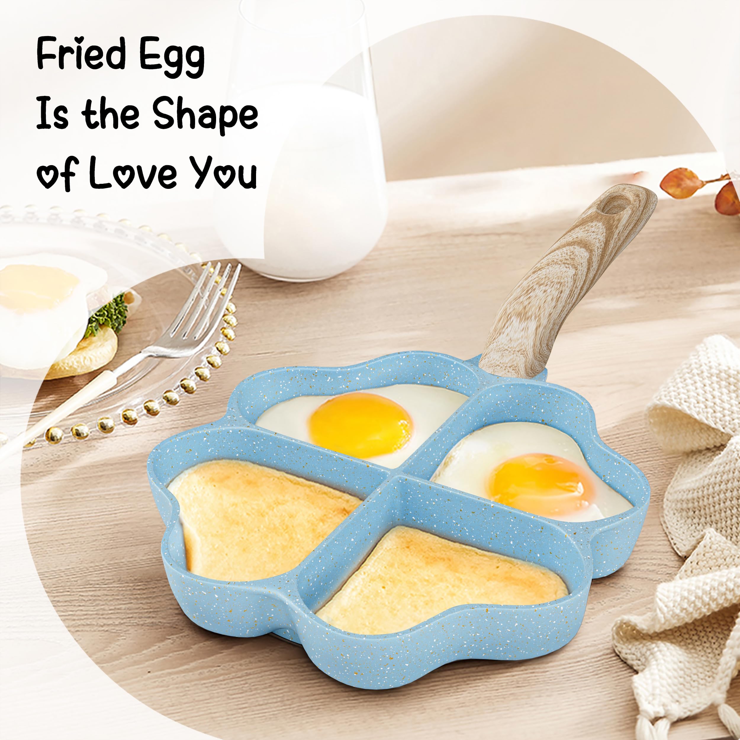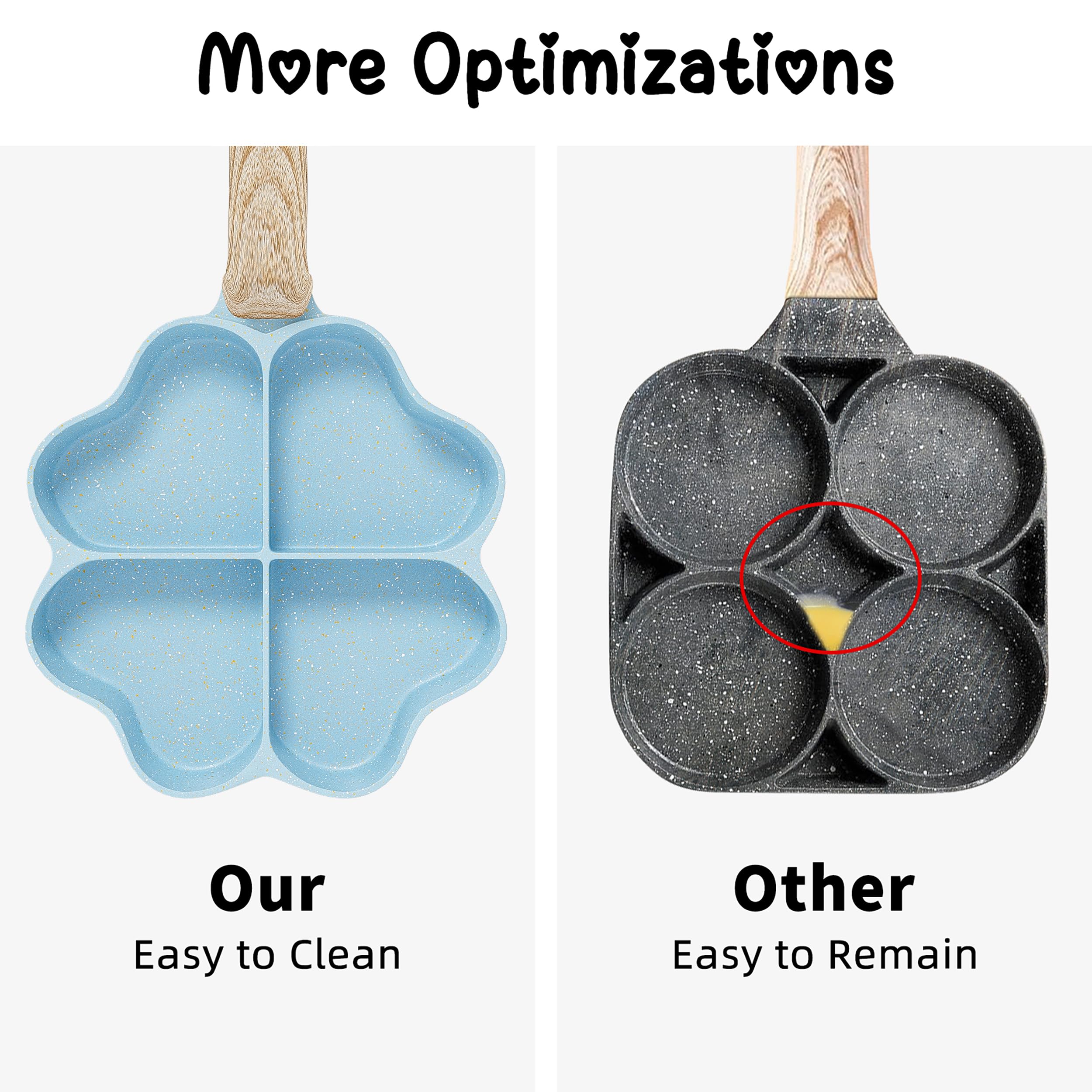 【Unique Heart-shaped Omelet Pan】A true love meal, this will get your baby to love breakfast! Just heat the ingredients in the mold and a breakfast that can pass on love is done. 【4-Cup Design】Unlike ordinary frying pans, our omelet pan features a 4-cup design that allows you to fry four eggs or four different foods at the same time, meeting the daily breakfast needs of the ordinary family. 【Non-stick& Easy to Clean】100% PFOA free. Non-stick cookware is not only good for cleaning, but requires only a small amount of oil or butter for excellent food release, saving you money and calories. 【Heats Quickly& Evenly】The burrito pan is made of high quality aluminum alloy with a thick bottom and thin walls, which heats up faster than traditional burrito pans, greatly reducing cooking time and making it less likely to burn food. 【Induction Compatible】The bottom is equipped with an induction piece and is suitable for all cookware except ovens, Bakelite handles are not suitable for ovens.