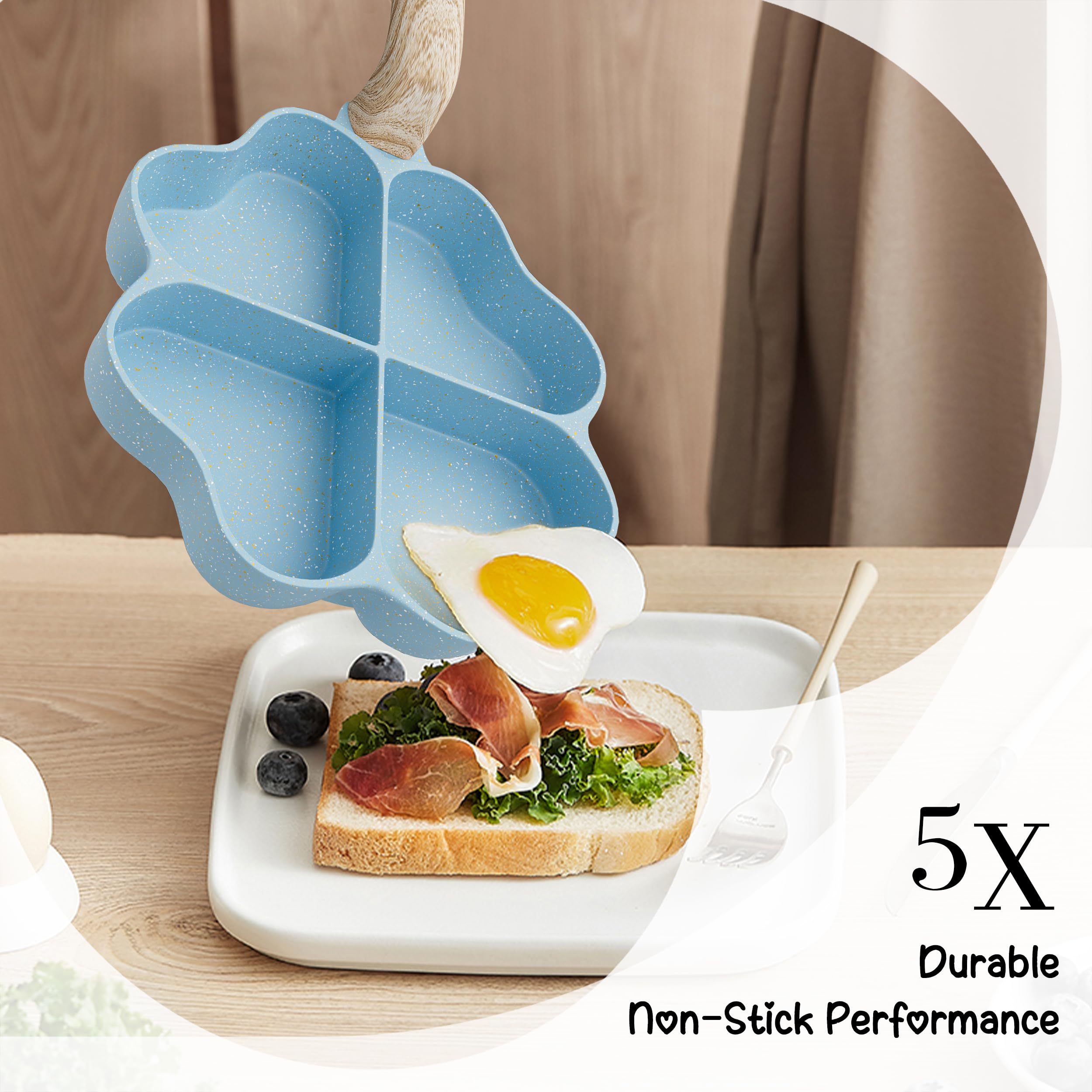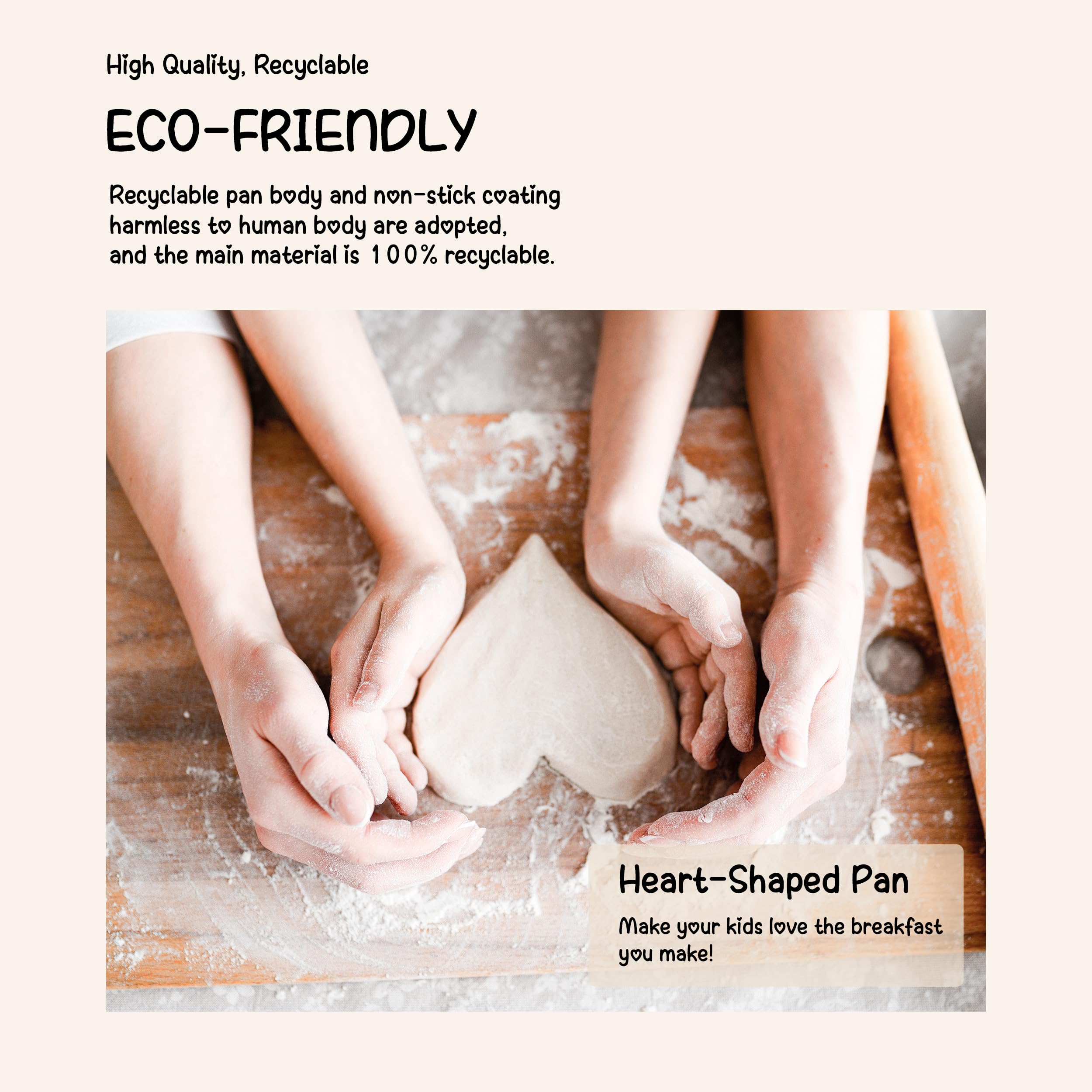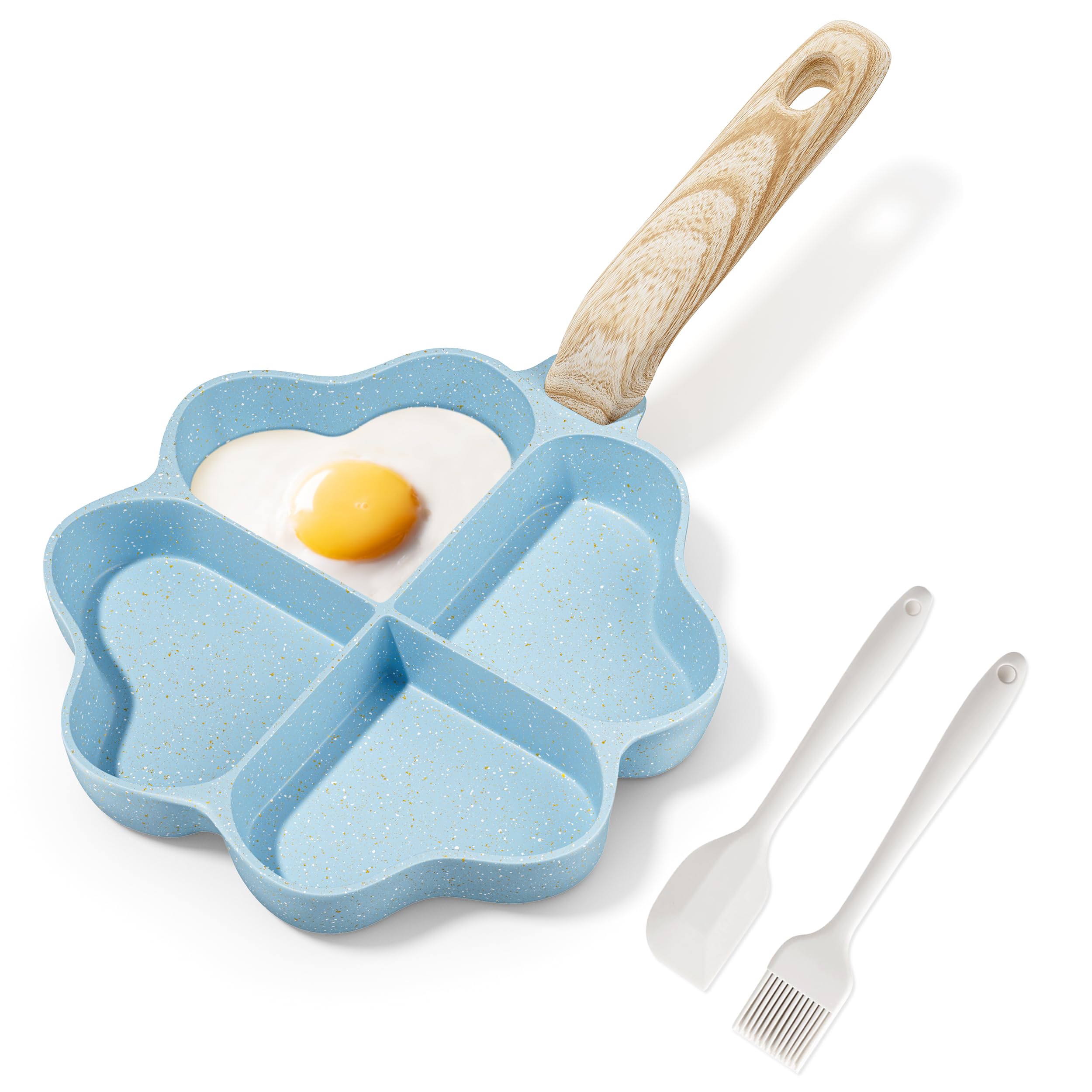 【Unique Heart-shaped Omelet Pan】A true love meal, this will get your baby to love breakfast! Just heat the ingredients in the mold and a breakfast that can pass on love is done. 【4-Cup Design】Unlike ordinary frying pans, our omelet pan features a 4-cup design that allows you to fry four eggs or four different foods at the same time, meeting the daily breakfast needs of the ordinary family. 【Non-stick& Easy to Clean】100% PFOA free. Non-stick cookware is not only good for cleaning, but requires only a small amount of oil or butter for excellent food release, saving you money and calories. 【Heats Quickly& Evenly】The burrito pan is made of high quality aluminum alloy with a thick bottom and thin walls, which heats up faster than traditional burrito pans, greatly reducing cooking time and making it less likely to burn food. 【Induction Compatible】The bottom is equipped with an induction piece and is suitable for all cookware except ovens, Bakelite handles are not suitable for ovens.