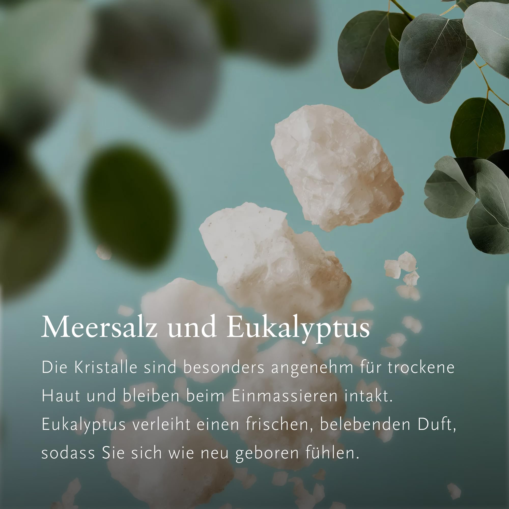 Salzkristalle: Die Salzkristalle bleiben unversehrt und massieren sich in die Haut ein, wodurch sie sanft gereinigt und geglättet wird.