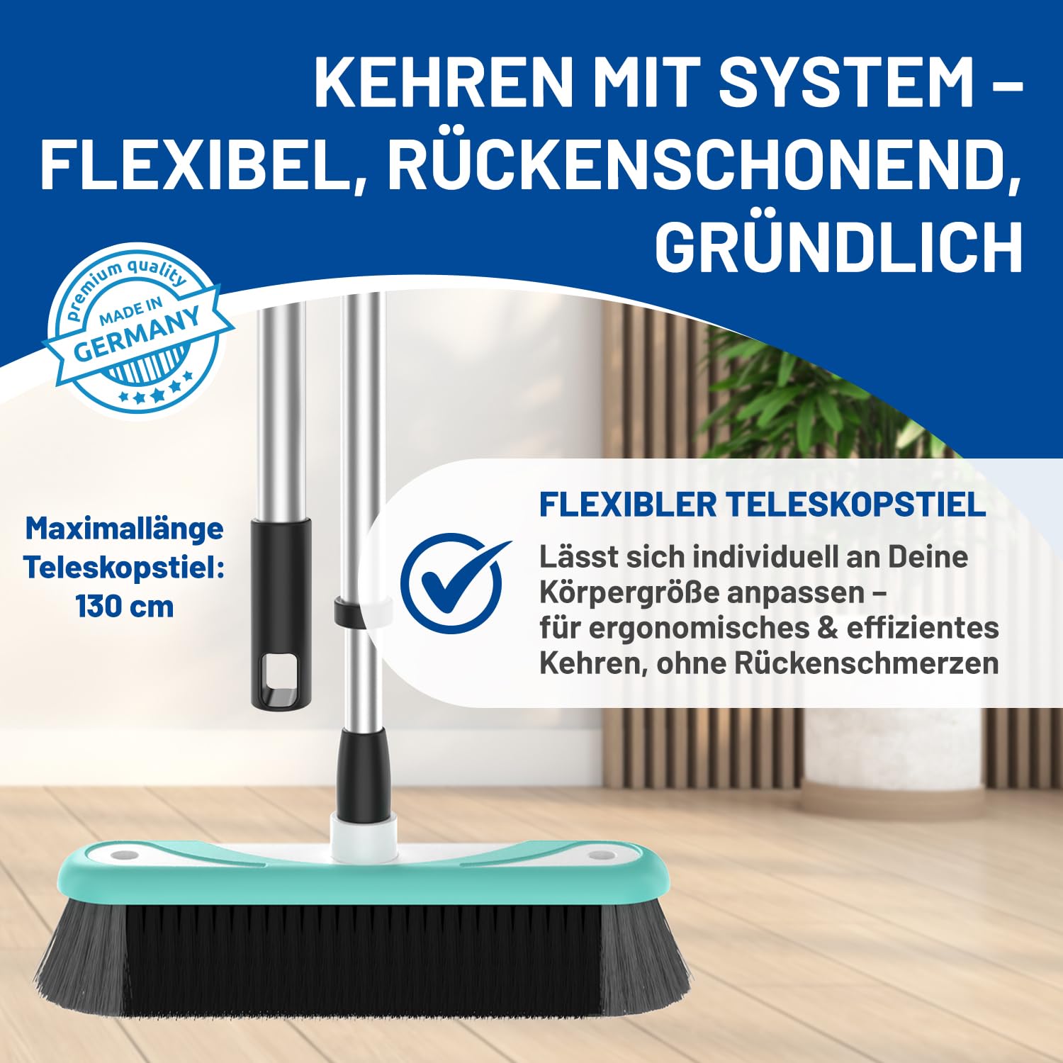 - FLEXIBEL DANK TELESKOPSTIEL: Der Besen wird mit einem Teleskopstiel geliefert. Dieser lässt sich individuell an Ihre Körpergrösse anpassen – für ergonomisches Kehren ohne Rückenschmerzen. Der ideale Besen für Haus, Garten oder Werkstatt.