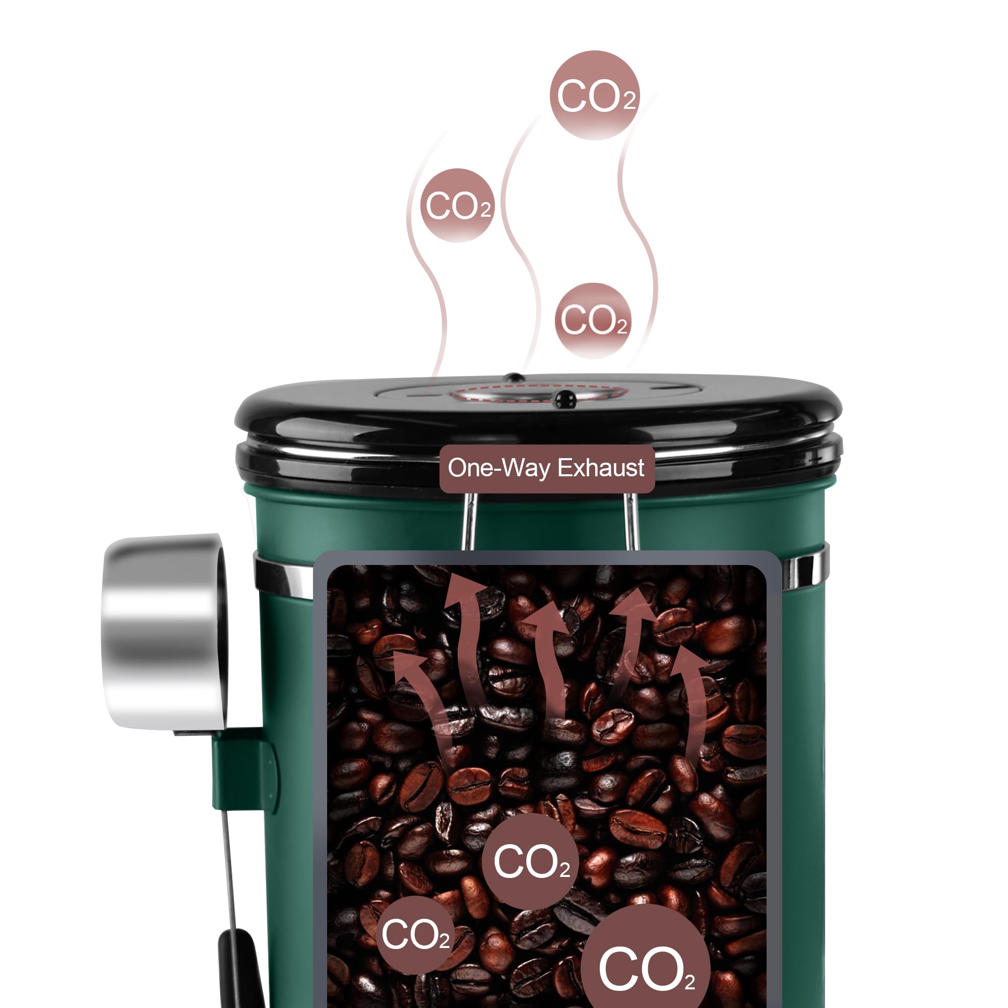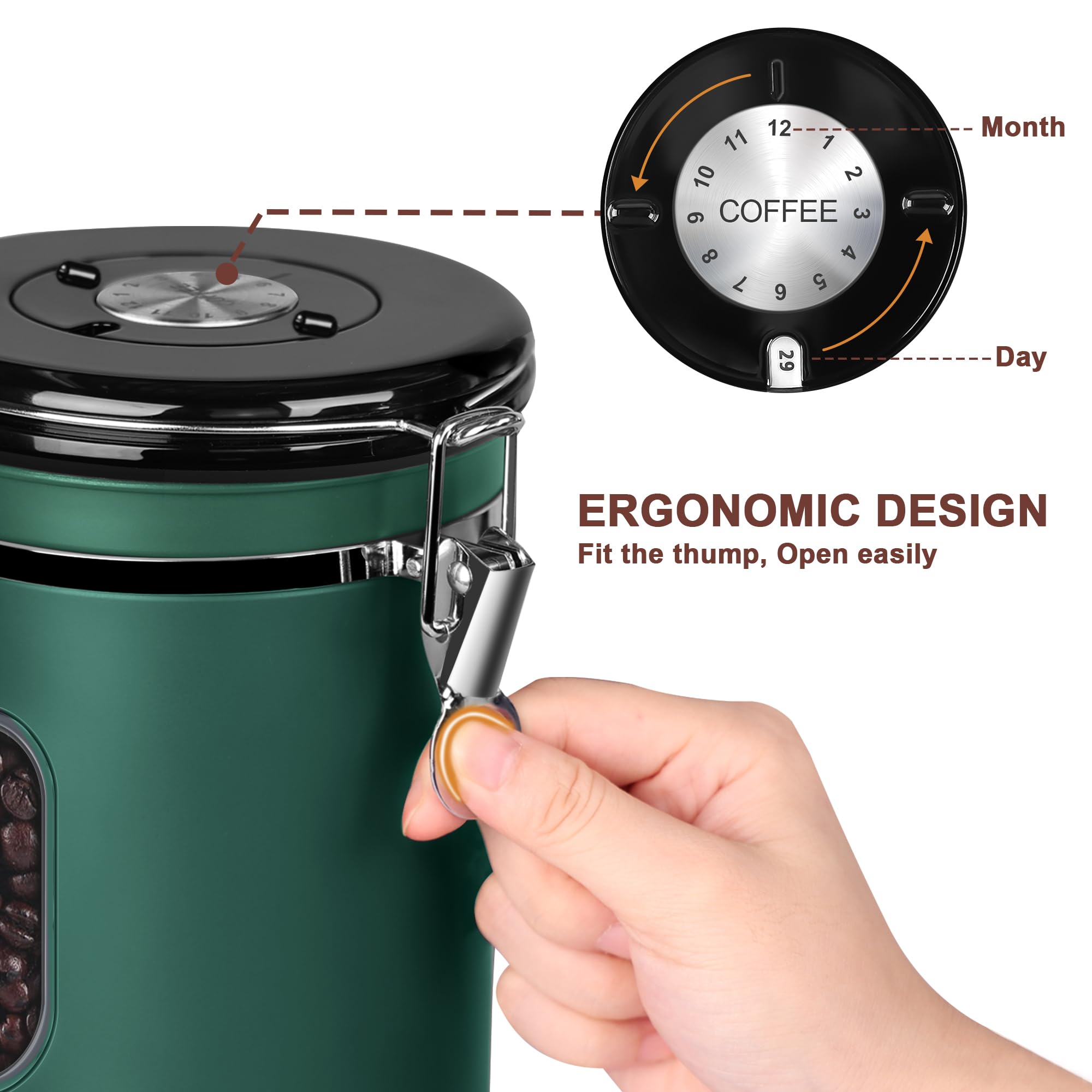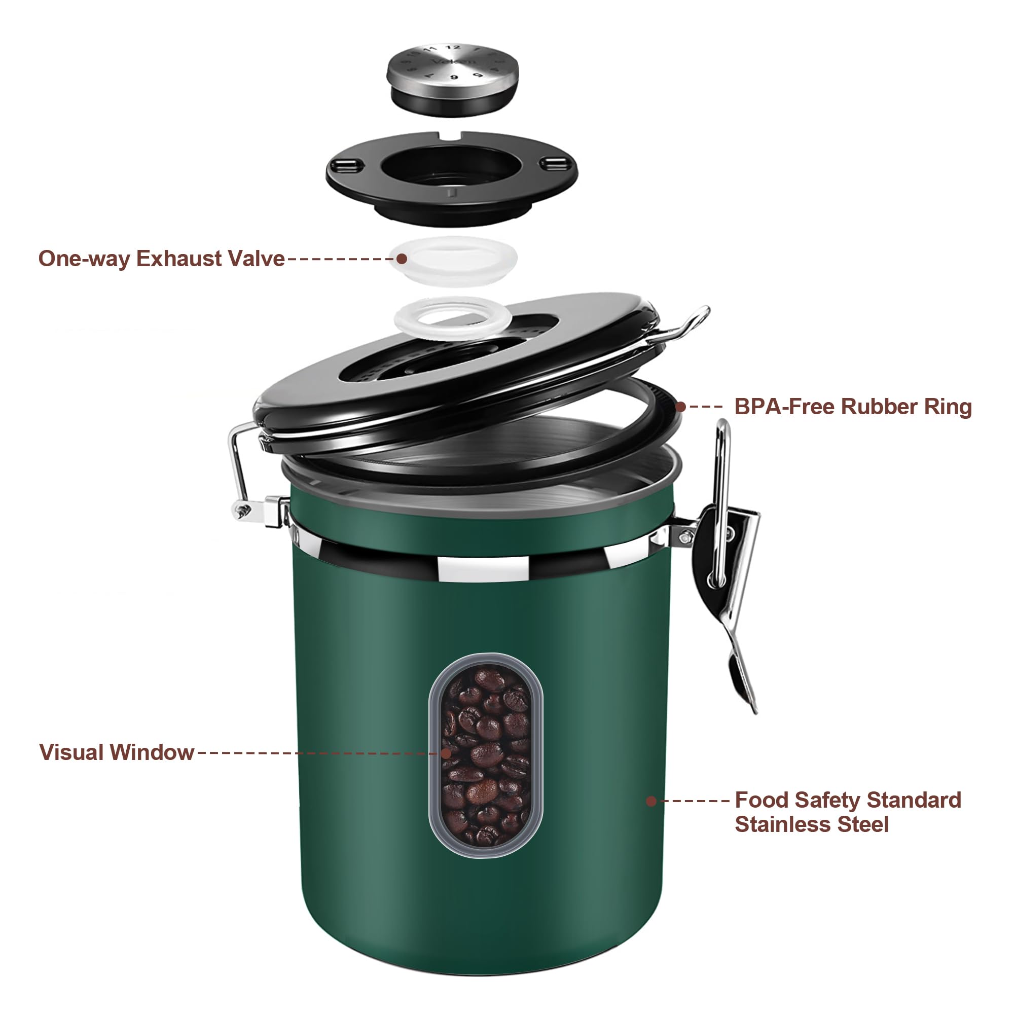 ROCKY&CHAO Kaffeedose Luftdicht aus Edelstahl 1,8L Kaffeebhnen Behälter mit Sichtfenster an der Seite Vorratsdose für 600g Tee Nüsse Kakao Länger und Frisch Bleiben (Grün)
