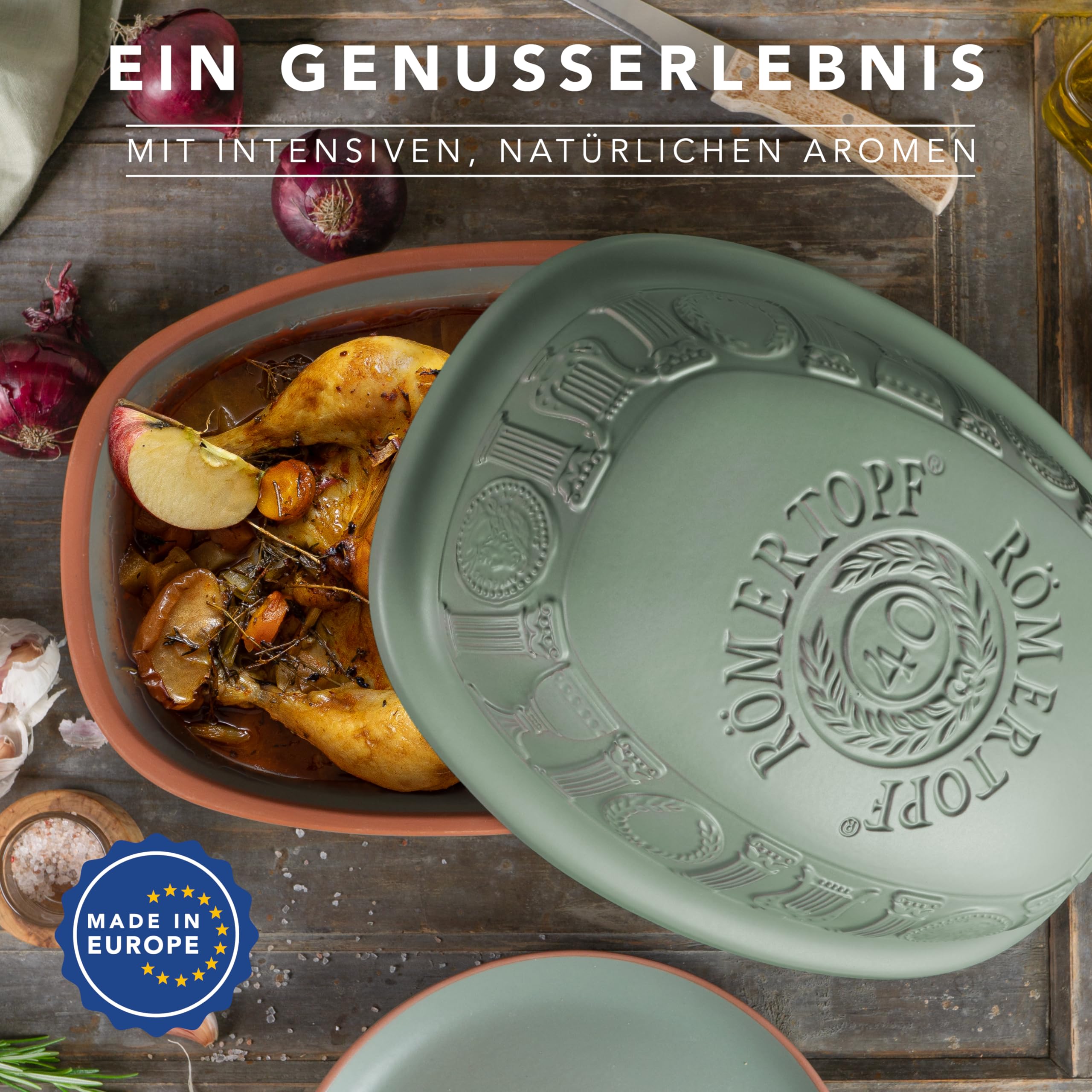 Der Römertopf 40 Jahre JUBILÄUM - ein vielseitiges Talent in Grün Braten, Schmoren, Dampfgaren: Der Terrakottae Römertopf 40 Jahre JUBILÄUM zeigt seine vielfältigen Einsatzmöglichkeiten in der Küche. Seit 1967 ist der Römertopf ein bewährter Helfer, der von Generation zu Generation geschätzt wird. Die 40 Jahre JUBILÄUM-Serie besticht durch ihre optimierten Proportionen und exzellente Handhabung - eine gelungene Verbindung von Tradition und Moderne. Schonendes Garen für zarte Köstlichkeiten Komplexe Rezepte gelingen mühelos: Der zuvor gewässerte Römertopf setzt in der Hitze des Ofens während des Bratens, Schmorens und Dünstens Wasserdampf frei, was ein gleichmässiges Garen verschiedener Zutaten ermöglicht. Fleisch, Fisch und Gemüse werden dabei besonders zart und saftig. Gesund und geschmackvoll Mit dem 40 Jahre JUBILÄUM Bräter lassen sich Speisen auf schmackhafte und schonende Weise zubereiten. Auch diätetische Gerichte und Schonkost gelingen einfach und aromatisch. Durch den sanften Garvorgang im eigenen Saft bleiben sowohl Aromen als auch die natürliche Textur und Farbe der Zutaten weitgehend erhalten. Funktion trifft auf Design Der 50 Jahre JUBILÄUM Schmorbräter überzeugt nicht nur als Kochgeschirr, sondern auch als stilvolles Serviergeschirr. Dank seines kompakten Formats passt er perfekt in den Backofen, und der elegant geschwungene Deckel sorgt für besondere Handlichkeit. Auf der gedeckten Tafel beeindruckt er ebenso und hält die Speisen bei geschlossenem Deckel lange warm. Perfekt für festliche Anlässe Der 50 Jahre JUBILÄUM ist die ideale Wahl für besondere Feste wie Weihnachten oder Thanksgiving. Er ermöglicht es, beeindruckende Gerichte mühelos zuzubereiten, die auf der Festtagstafel glänzen und den Gästen unvergessliche kulinarische Erlebnisse bieten.