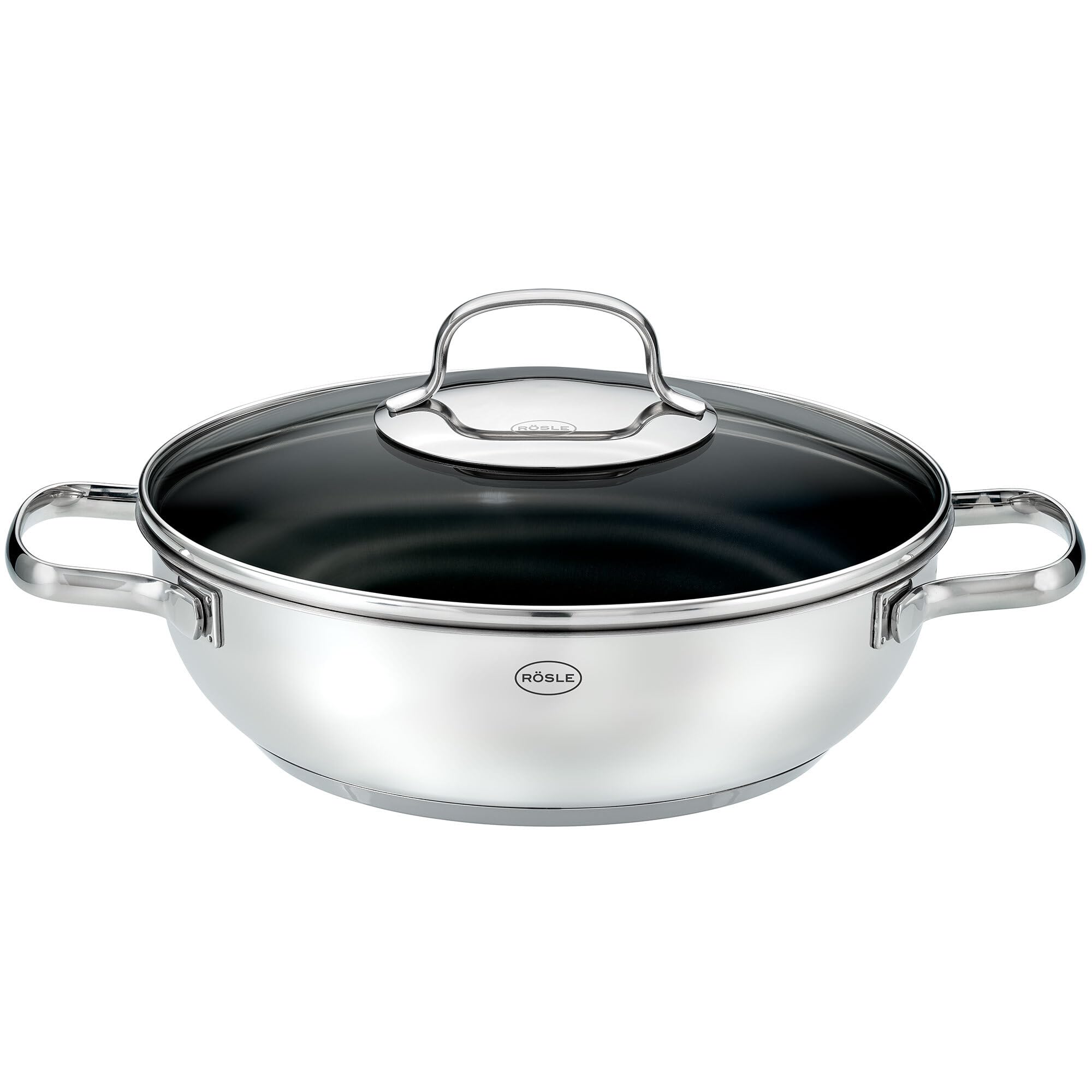 RÖSLE ELEGANCE ProCera Servierpfanne, Antihaft, Stilvoll & Effizient - Ø 28 cm, Hitzebeständig bis 260 °C, Keramikversiegelung, Silberfarben/Schwarz, Edelstahl 18/10, Silbern