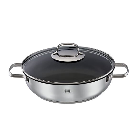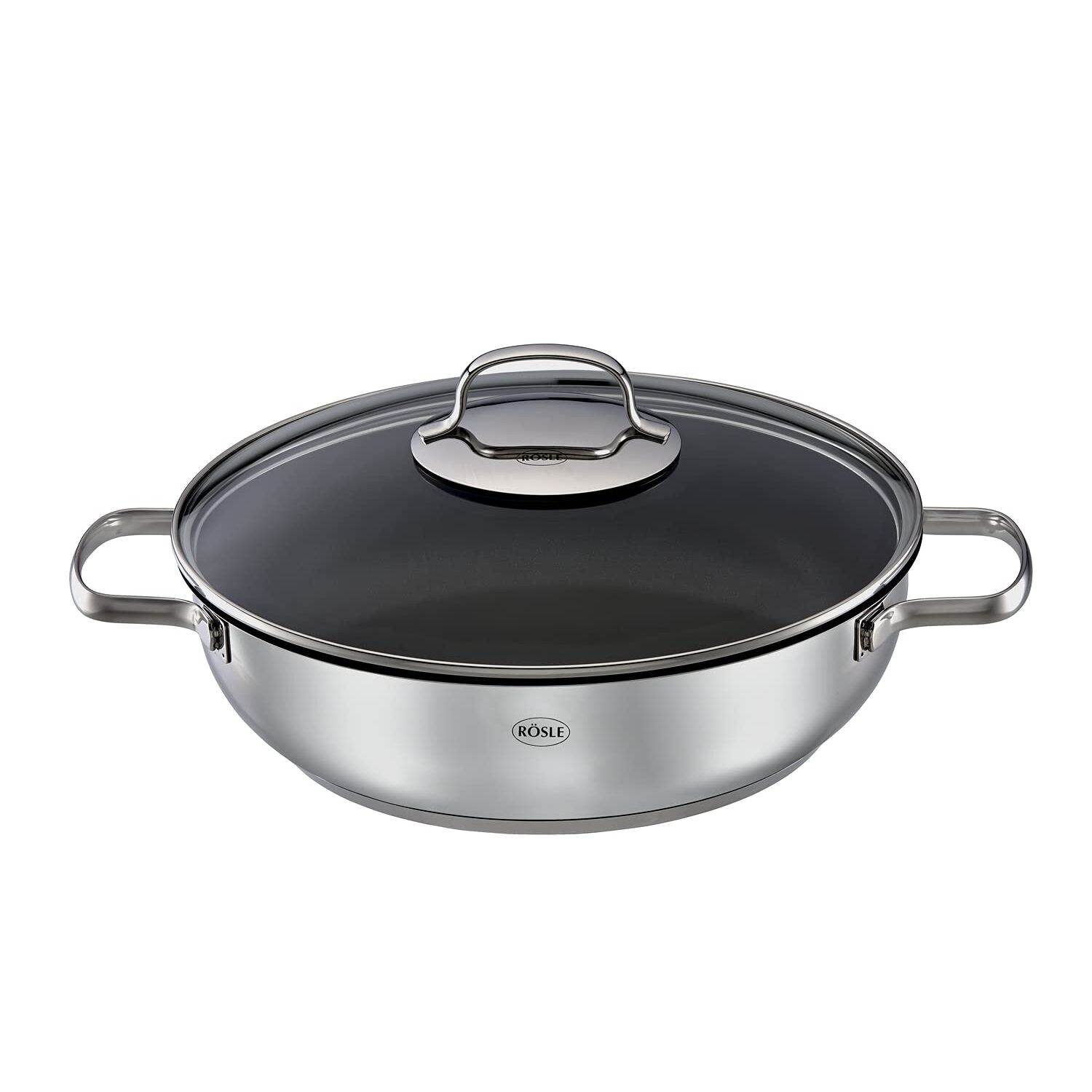 RÖSLE ELEGANCE ServierpfanneEine gute Bratpfanne gehört zur Grundausstattung einer jeden Küche. Ob saftiges Steak oder zartes Lachsfilet - stets ist die Qualität der Pfanne ausschlaggebend. RÖSLE bietet mit der Universalservierpfanne - ELEGANCE - eine Edelstahlpfanne, die auch höchsten Ansprüchen gerecht wird. Die Antihaftversiegelung ProPlex kümmert sich hervorragend um Ihr Bratgut, egal ob Fischfilet, Geflügel oder Mehlspeisen. Ein hoher Pfannenrand sorgt für ausreichend Platz und verringert Fettspritzer am Herd. Der ergonomisch geformten Griffe aus Edelstahl 18/10 bieten eine einfache Handhabung beim Braten, Schwenken und Servieren. Mit gekapseltem Boden mit Aluminiumkern - so ist eine gleichmässige Wärmeleitung und -speicherung gegeben. Das spart Zeit und Energie.