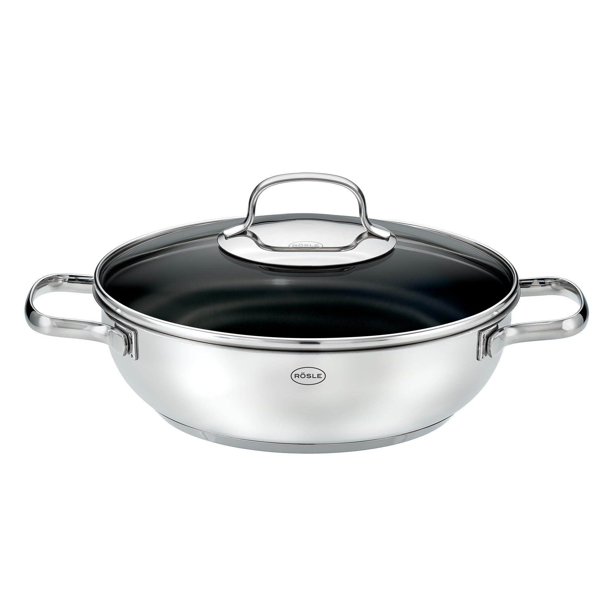 RÖSLE ELEGANCE Servierpfanne: Ihre hochwertige Universalpfanne mit robuster Antihaftbeschichtung ProPlex - ein Allrounder für den täglichen Gebrauch! Die Antihaftversiegelung ProPlex garantiert ein Braten ohne Anbrennen, sei es Fischfilet, Geflügel oder Mehlspeisen. Mit einem hohen Pfannenrand für ausreichend Platz und zur Verringerung von Fettspritzern am Herd. Die ergonomisch geformten Griffe aus Edelstahl 1810 sorgen für eine einfache Handhabung beim Braten, Schwenken und Servieren. Die Pfanne verfügt über einen gekapselten Boden mit Aluminiumkern für gleichmässige Wärmeleitung und -speicherung. Geeignet für alle Herdarten: Keramik, Elektro, Gas, Induktion und Backofen. Entdecken Sie mit RÖSLE ELEGANCE Qualität und Vielseitigkeit in Ihrer Küche!