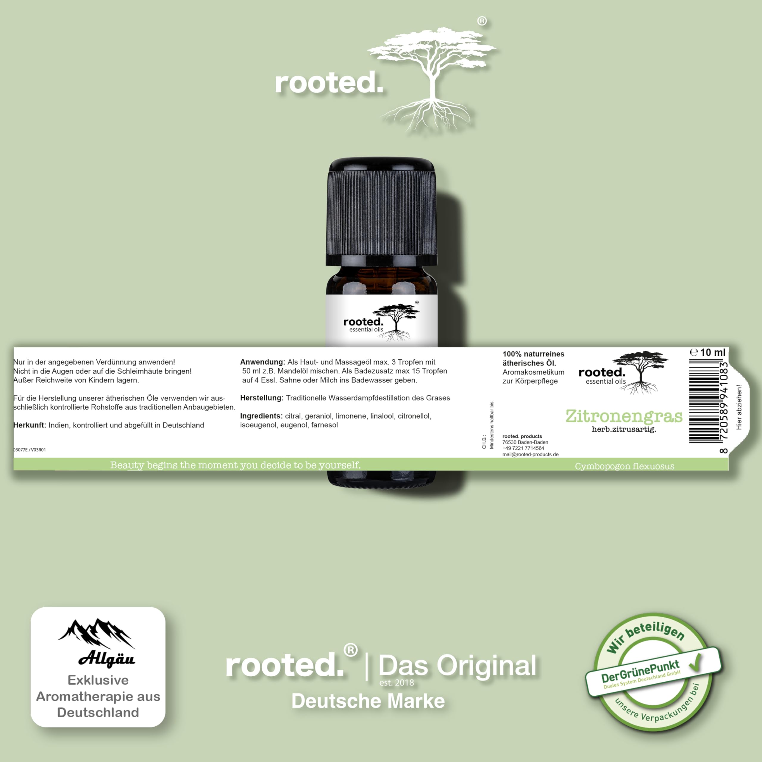 rooted.® BIO Zitronengrasöl 10ml [100% NATURREIN] - Echtes Lemongras - Ätherisches Öl für Aromatherapie, Duftlampe, Diffusoren, Raumduft, Duftkerzen und -Seifen