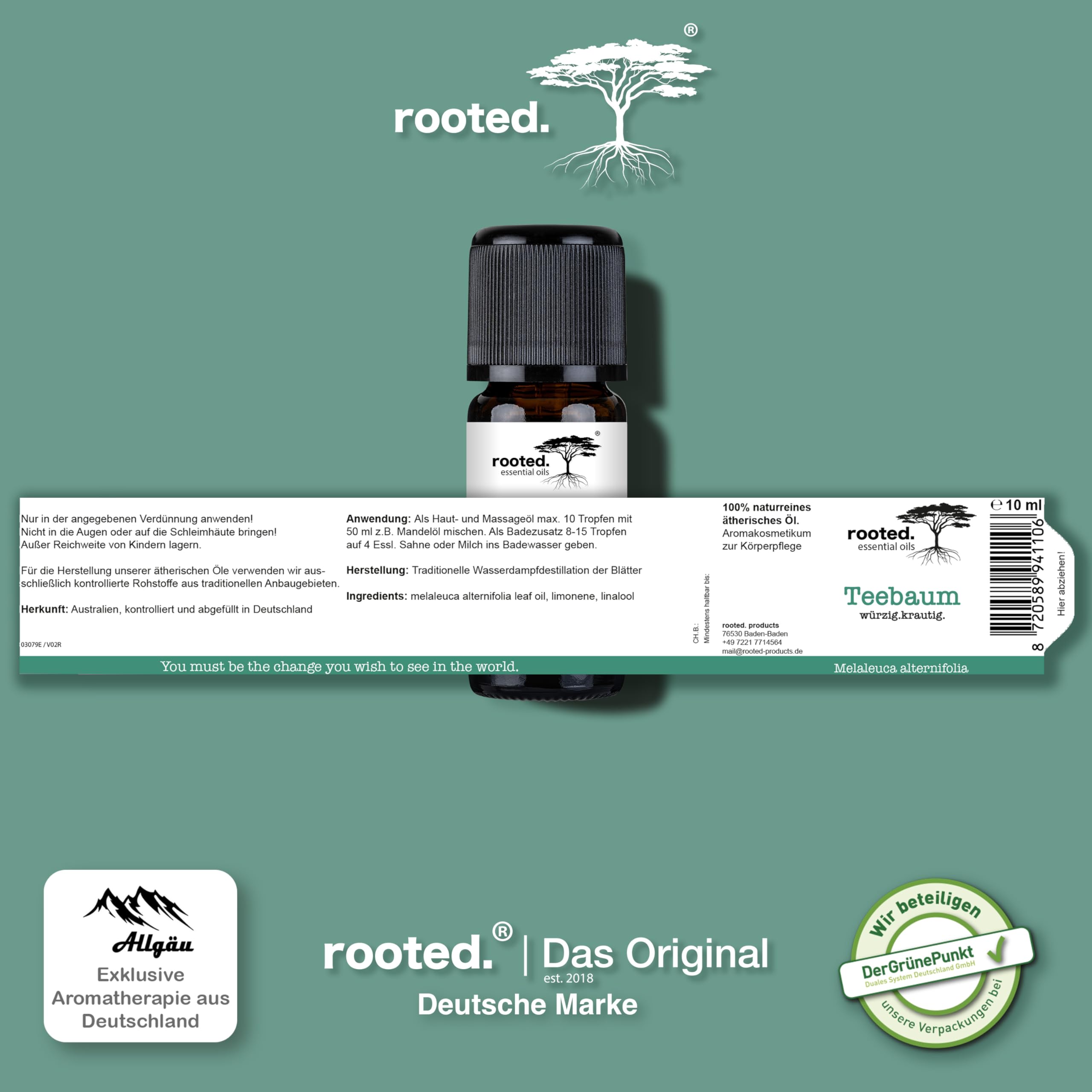 rooted.® BIO Teebaumöl [100% NATURREIN] – Ätherisches Öl für Hautpflege, Naturkosmetik & Duftlampen – Tea Tree Oil zur Aromatherapie, gegen Pickel & unreine Haut