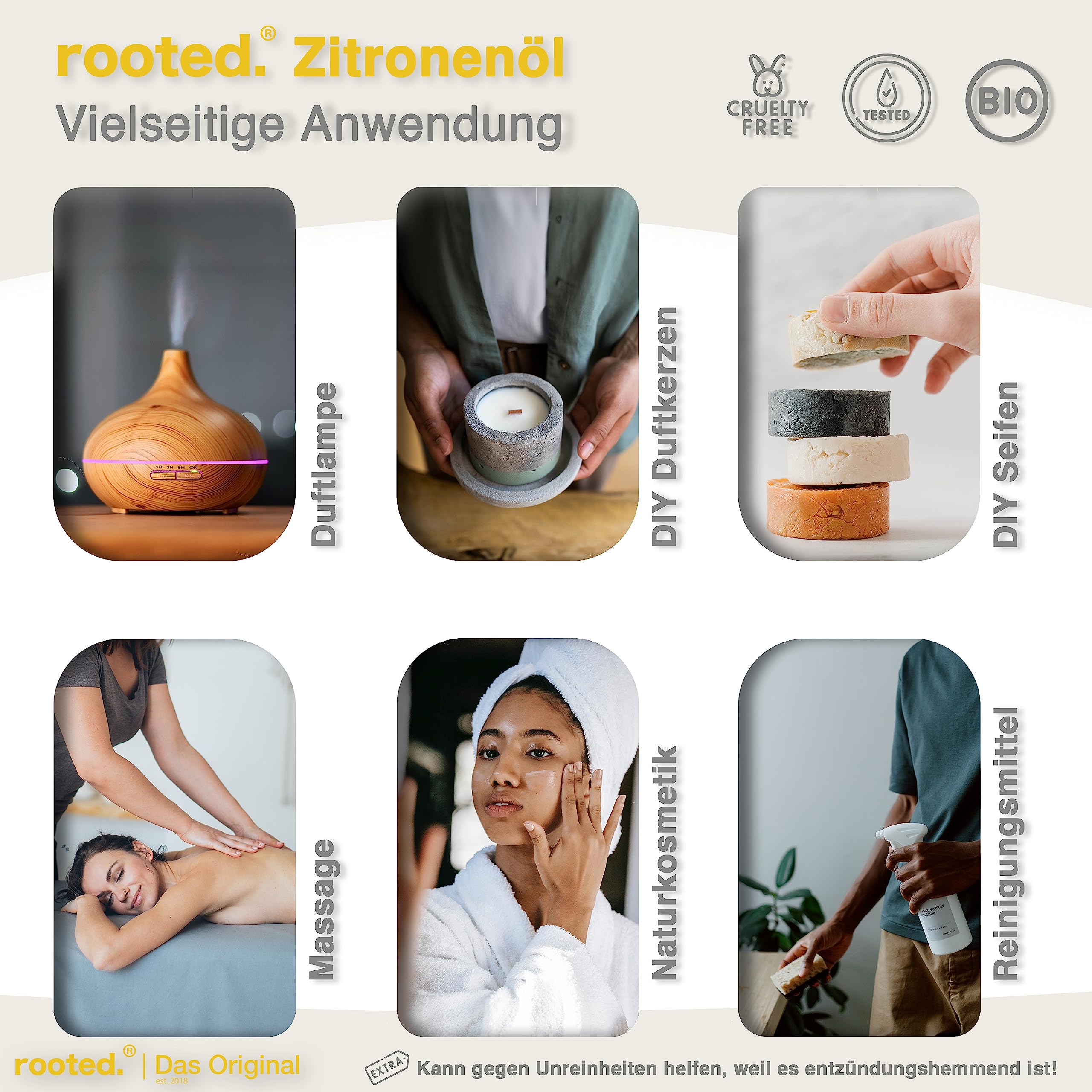 rooted.® BIO Zitronenöl 10ml [100% NATURREIN] - Echte Zitrone - Citrus limon - Ätherisches Öl für Aromatherapie, Duftlampe, Diffusoren, Raumduft, Duftkerzen und -Seifen
