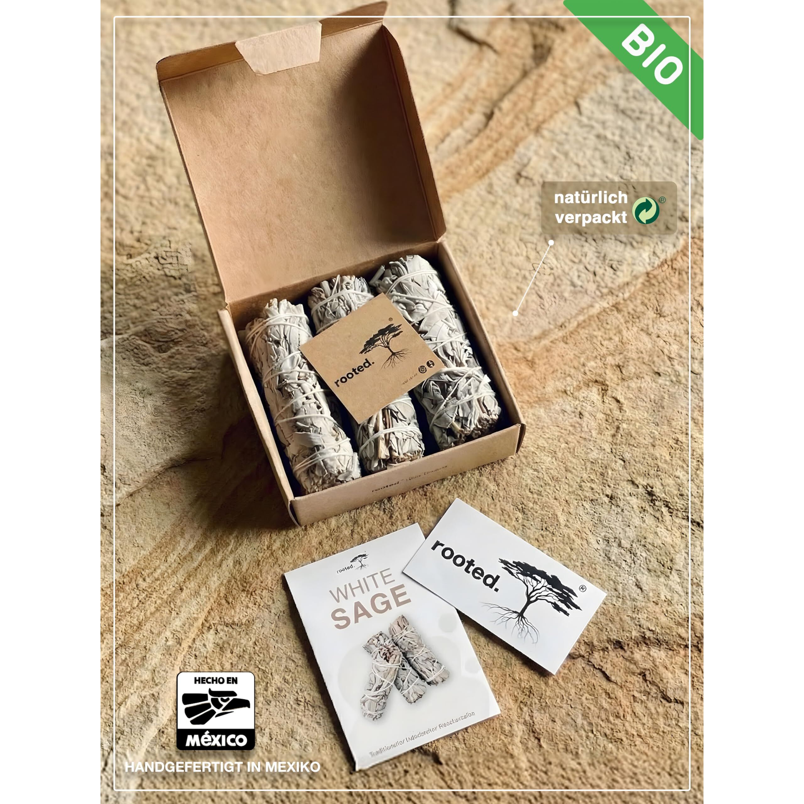 rooted.® | Das Original | Weisser Salbei | 3 Bündel kallifonirscher Salbei | Premium Smudge Sticks | Indianischer Räuchersalbei | 100% kontrollierte und nachhaltige Ernte