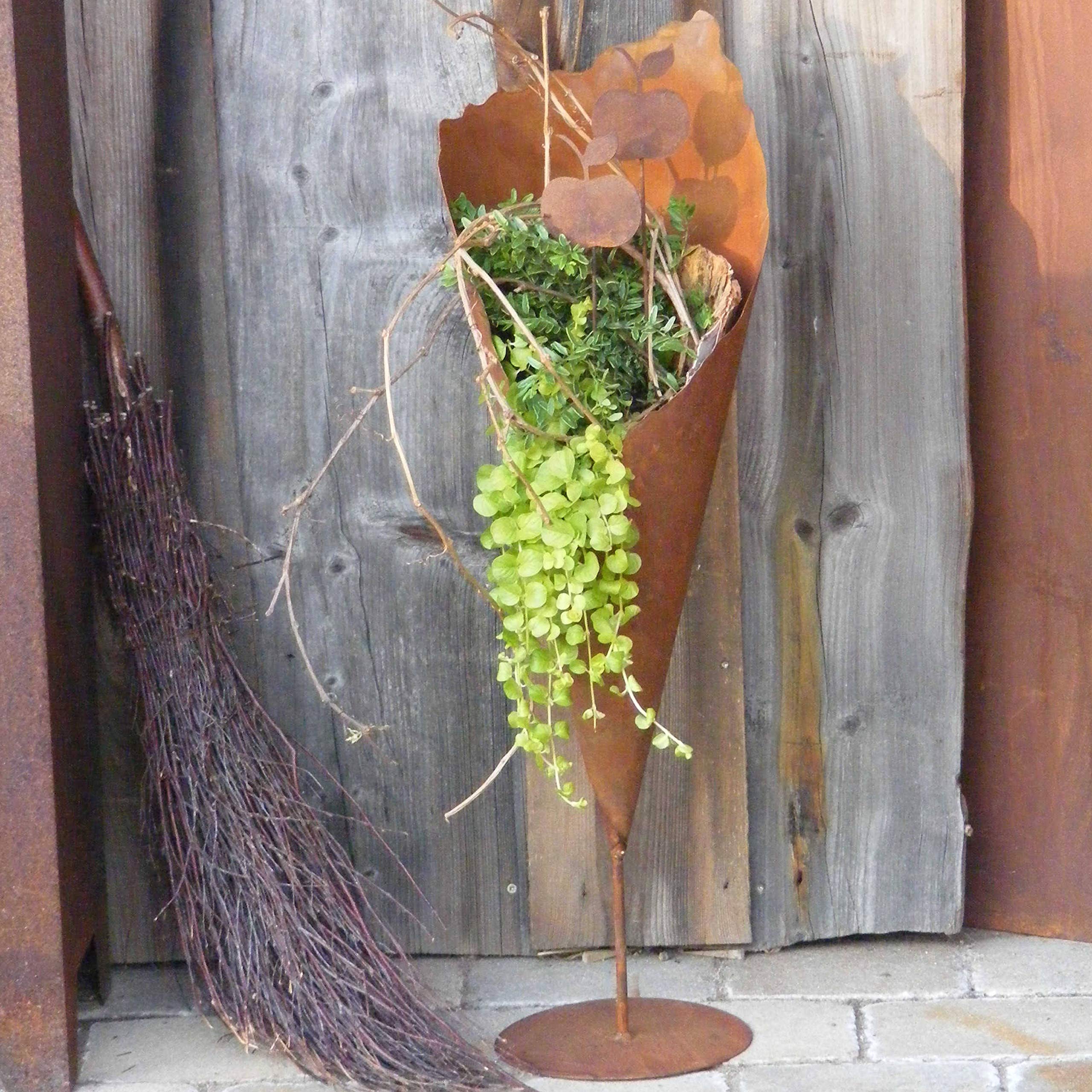Der Hingucker für Ihren Garten• Blumen vs. Feuer - Ob Trockengesteck oder Weihnachtsdeko, schön arrangiert wird dieses Dekoelement zum Blickfang in Ihrem Garten. Oder entzünden Sie ein kleines Feuer in der Rosttüte und sorgen für eine angenehme Atmosphäre bei der nächsten Gartenparty.• Masse - Die einzigartige Pflanztüte mit Stab steht auf einer Bodenplatte mit einem Durchmesser von 20 cm. Sie hat eine Gesamthöhe von 69 cm.• Material - Die aus Metall gefertigte Dekotüte erhält ein spezielles Rostfinish. So erhält sie ihren besonderen Charakter in den schönsten Brauntönen.• Geschenkidee - Lassen Sie z. B. das Dekoherz des Jubilars beim Gartenbauverein höherschlagen und schenken diese trendige Pflanztüte. Tipp: Die Pflanztüte ist auch in weiteren Grössen bei uns erhältlich. Wie wäre es vielleicht mit einem Set?• Handmade - delrost-Pflanztüte aus Metall – dekorative Gartendeko für Garten, Terrasse und Balkon Diese dekorative Pflanztüte aus Metall ist ein stilvoller Blickfang für Garten, Terrasse oder Balkon. Die Edelrost-Optik verleiht der Pflanztüte einen natürlichen Charakter und macht sie zu einer beliebten rostigen Gartendeko zum Bepflanzen mit Blumen, Gräsern oder dekorativen Pflanzen. Die Metall-Pflanztüte steht freistehend auf einer stabilen runden Bodenplatte mit einem Durchmesser von ca. 20 cm. Die Gesamthöhe beträgt ca. 69 cm. Durch die schlanke, vertikale Form eignet sich die Pflanztüte ideal als dekoratives Pflanzgefäss für Beete, Wege, Terrassen oder Balkone. Gefertigt aus robustem Metall entwickelt die Oberfläche durch ein spezielles Rost-Finish eine charakteristische Edelrost-Patina in warmen Brauntönen. Der Farbton verändert sich im Laufe der Zeit auf natürliche Weise, wodurch jede Pflanztüte ihren individuellen Vintage- oder rustikalen Look erhält. Die Edelrost-Pflanztüte eignet sich als Metall-Deko für den Garten und den Aussenbereich, kann aber auch in geschützten Innenbereichen dekorativ eingesetzt werden. Sie lässt sich flexibel bepflanzen und harmonisch in verschiedene Garten- und Dekokonzepte integrieren. Hergestellt wird die Pflanztüte in der bayerischen Manufaktur von Rostikal. Sorgfältige Handarbeit, langlebiges Material und eine saubere Verarbeitung sorgen für eine hochwertige und dauerhafte Garten- und Balkondekoration.