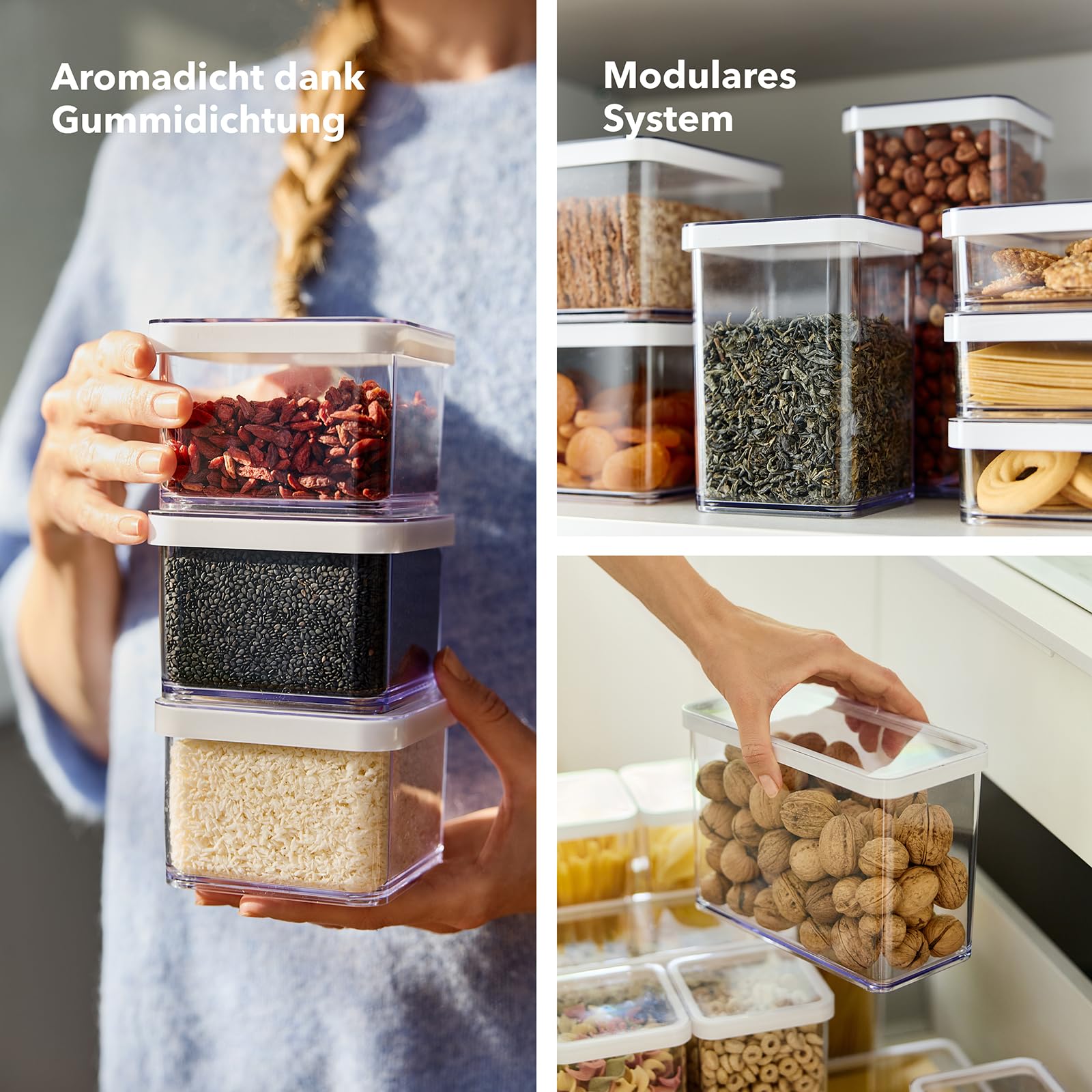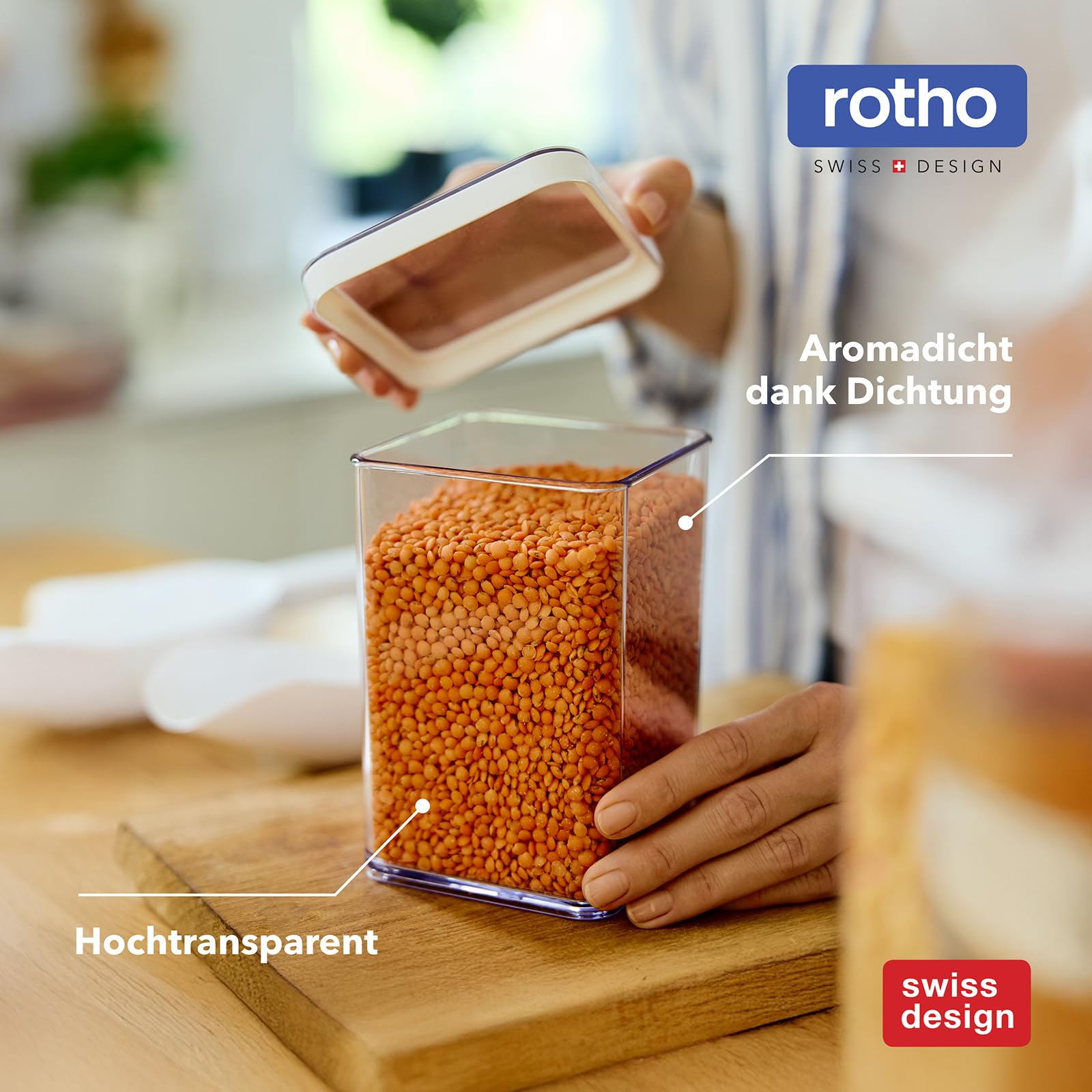 Vorratsdose "Loft" von Rotho Bewahren Sie Ihre Lebensmittel ab sofort bequem und übersichtlich in den Rotho Vorratsdosen auf! Ob Mehl, Zucker, Müsli oder Nudeln - alles findet durch die verschiedenen Boxengrössen seinen Platz, wird durch die Isolierung frisch gehalten und verliert keine Aromastoffe. Durch das transparente Design sind die Inhalte direkt ersichtlich und dabei auch noch ein echter Hingucker in der Küche. Unsere Vorratsdosen aus der Reihe Loft sind in verschiedenen Grössen und Formen erhältlich und für diverse Lebensmittel geeignet. Produktinformationen: - Vorratsdose mit Deckel für Trocken-Lebensmittel - Durch transparente Farbe bleibt Inhalt klar ersichtlich - Hochwertiger, BPA-freier Kunststoff (SAN) - Stabiles Material, kein Zerkratzen beim Reinigen - Kein Verziehen des Materials nach einem Spülgang - Spülmaschinen- und tiefkühlgeeignet - Luft- und geruchsdichter Verschluss durch TPE-Dichtungsring im Deckel - Hergestellt in der Schweiz