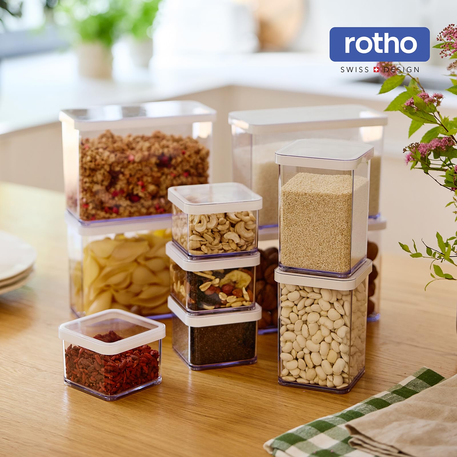 Rotho Loft 5er-Set Vorratsdosen mit Deckel verschiedene Grössen, lebensmittelechter Kunststoff (PP) BPA-frei, transparent/weiss, (21.4 x 21.4 x 23.5 cm)