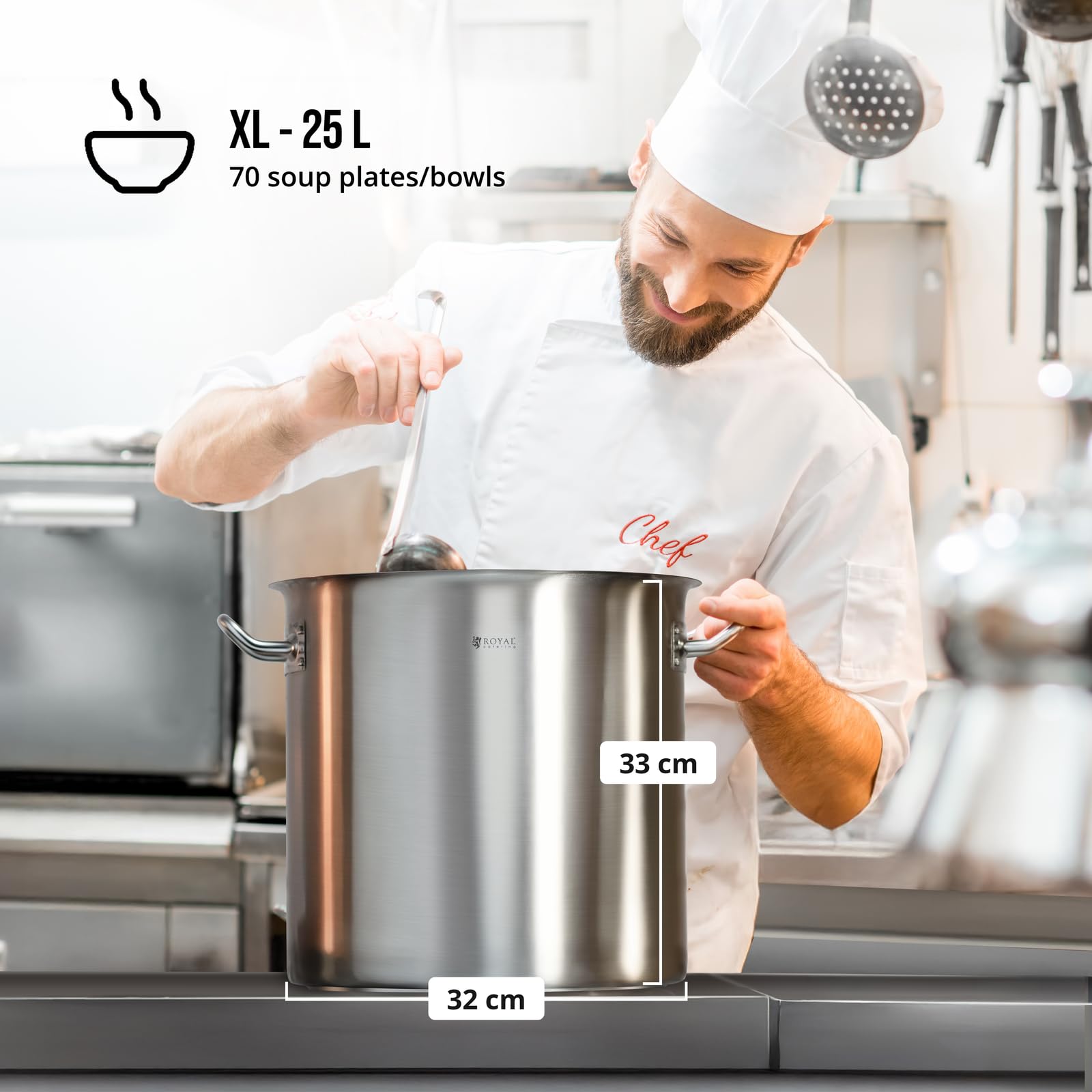 Kochtopf Induktion - 25 L - Ø 32 cm - Royal CateringDer Kochtopf Induktion RCST-25E3 mit grossem Fassungsvermögen von 25 Litern und Wärmeisolierung ist ein hochwertiges Küchenutensil. Sowohl für Grossküchen als auch im mobilen Einsatz für Outdoor-Events bietet dieser Topf die Möglichkeit Mahlzeiten in grossen Mengen problemlos herzustellen. Der dazugehörige Deckel hält Ihre Speisen warm und frisch. Geeignet ist der Kochtopf für Elektro- und Gasherde sowie Ceranfelder, Halogenplatten und Induktionskochfelder. Ob für den professionellen Einsatz in Restaurants, Bars, Kantinen oder für den Hobbykoch zu Hause, bei Royal Catering finden Sie erstklassige Kochtöpfe für Ihren Gastronomiebedarf.