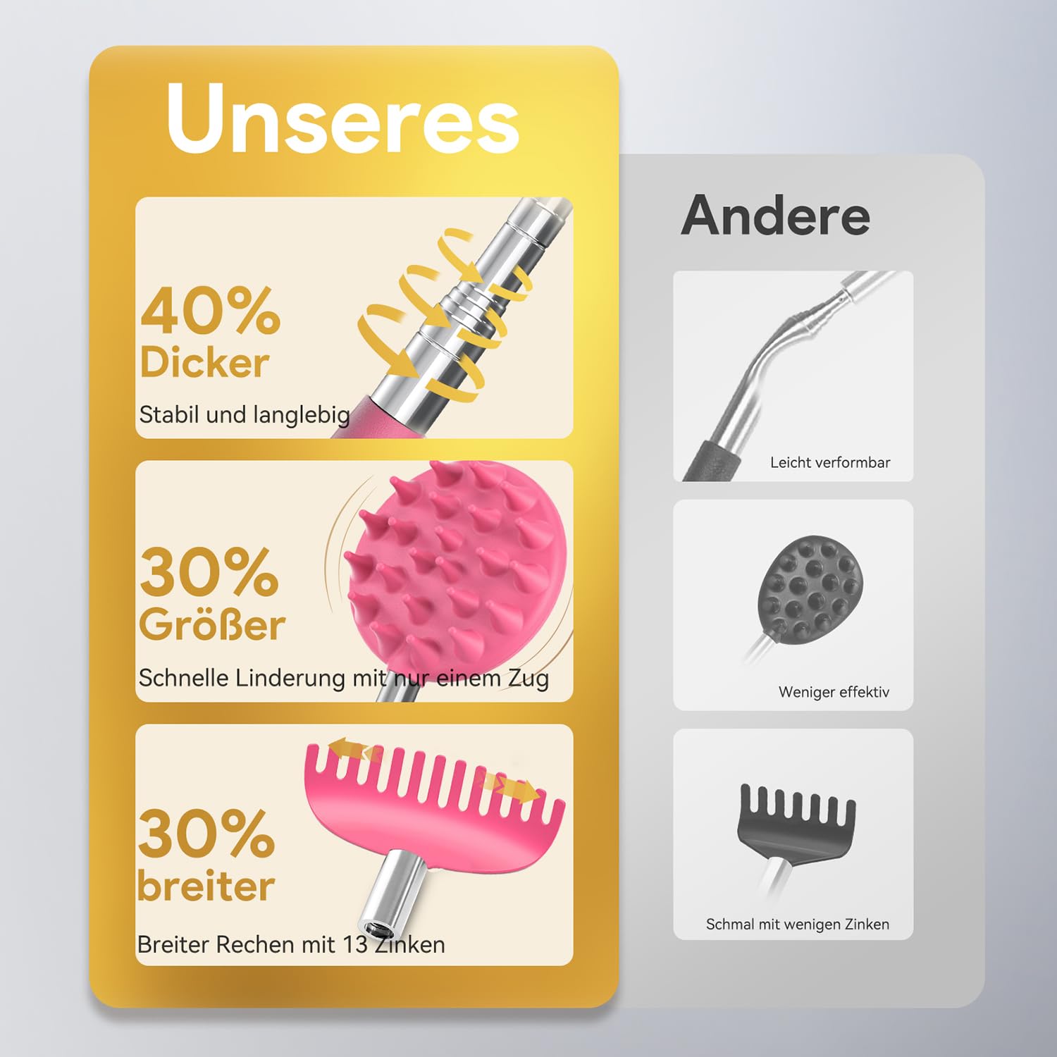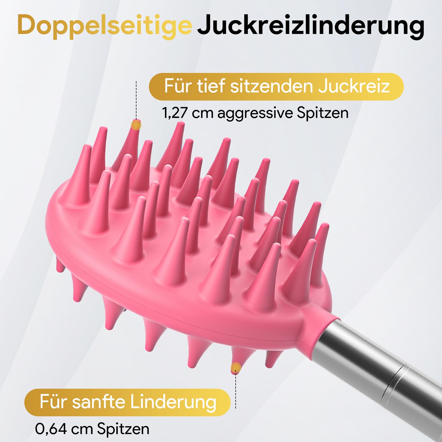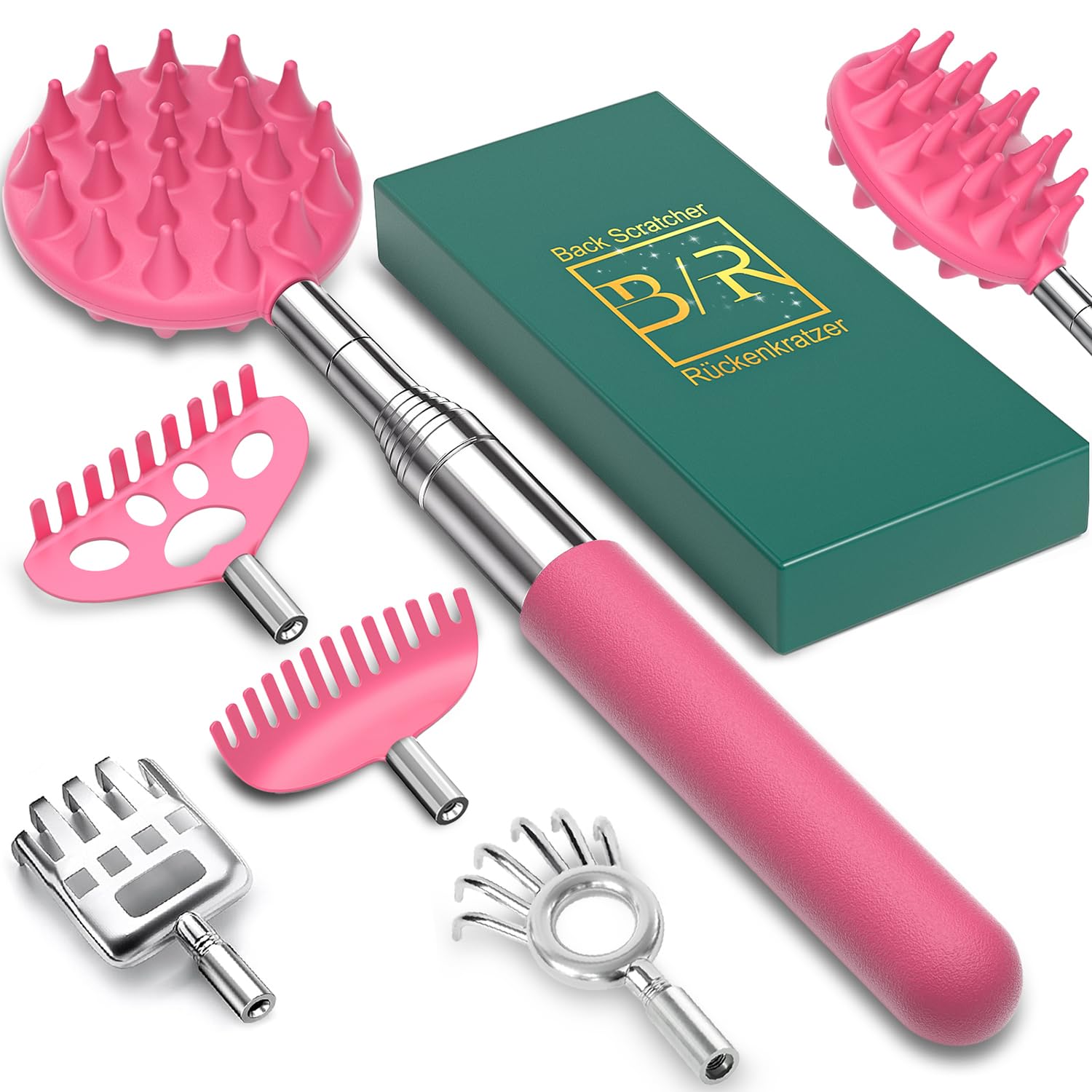Ausziehbarer Rückenkratzer mit 5 Abnehmbaren Kratzköpfen – Edelstahlgriff im Geschenkset – Für Männer und Frauen, Rosa