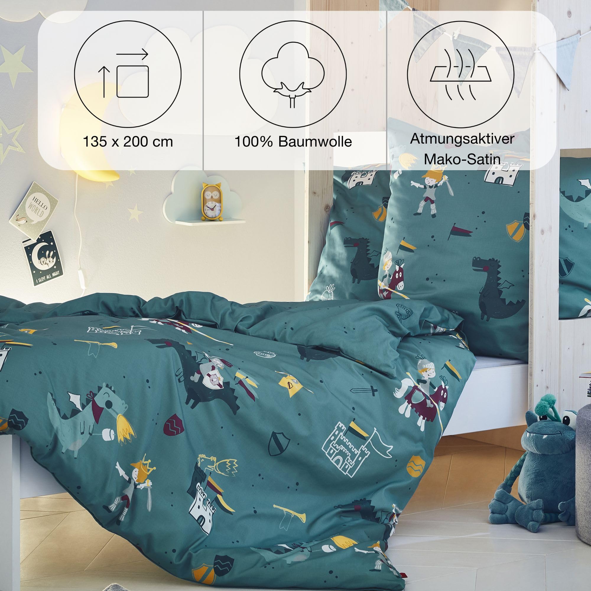 s.Oliver Kinderbettwäsche Ritter 135x200 cm - 100% Baumwolle, praktischer Reissverschluss & maschinenwaschbar, Bettwäsche für Kinder Drache & Ritterburg 2tlg. Petrol
