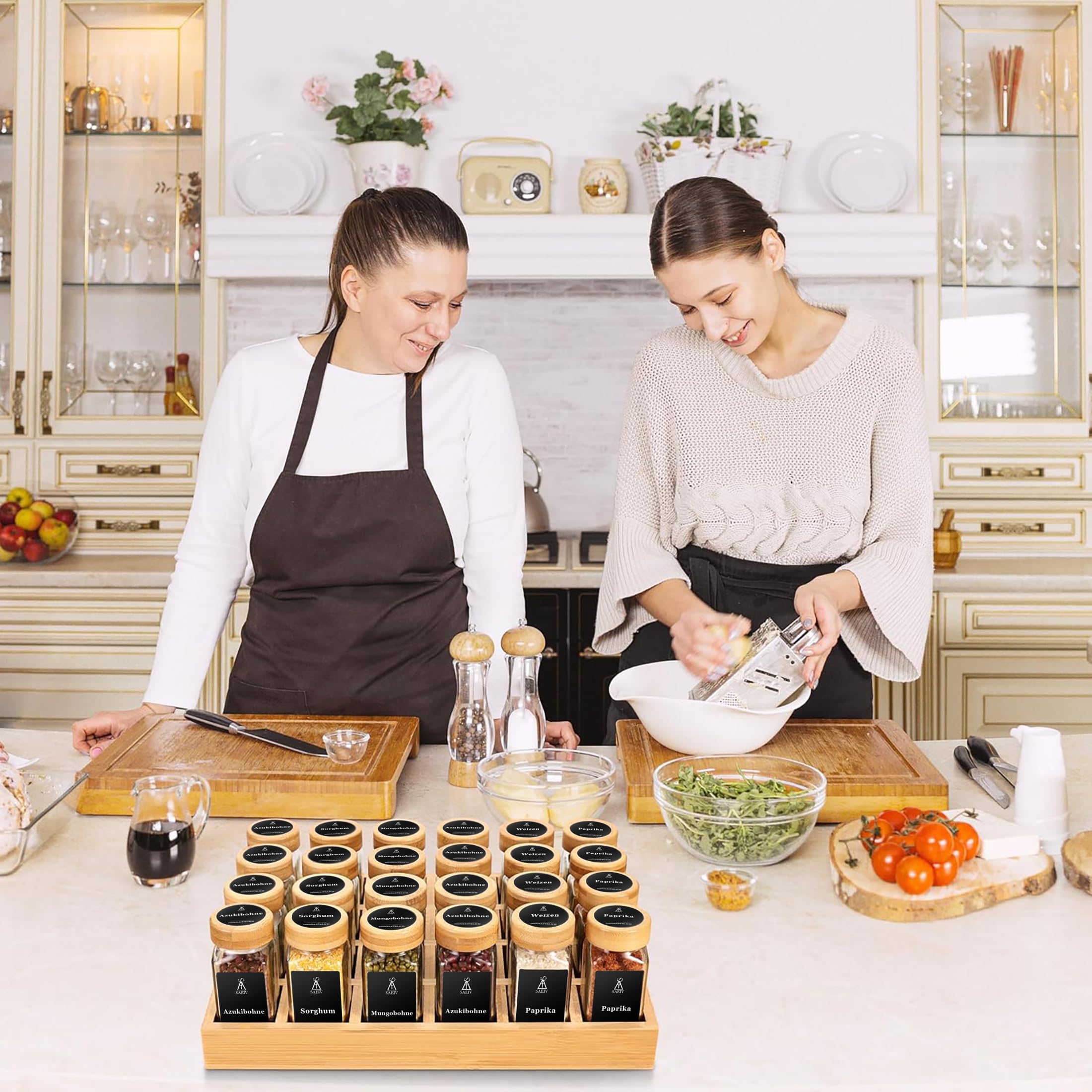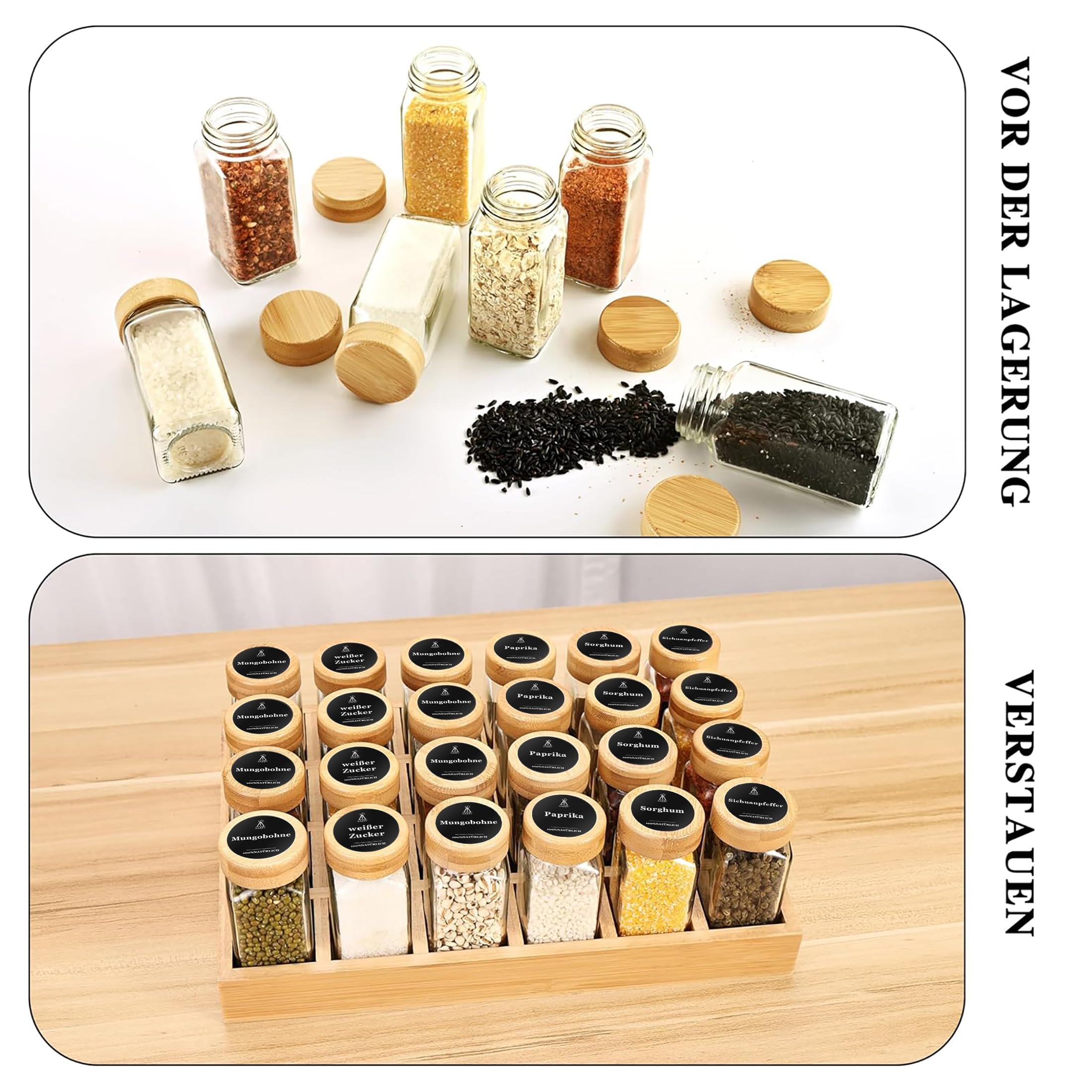 SAEIV Natürlicher Bambus Gewürzregal mit Gläsern, Gewürzregale Schrank Set mit 24 Gewürzgläser Eckig, Spice Rack Bambus für Eine Aufgeräumte und Organisierte Küche Geeignet