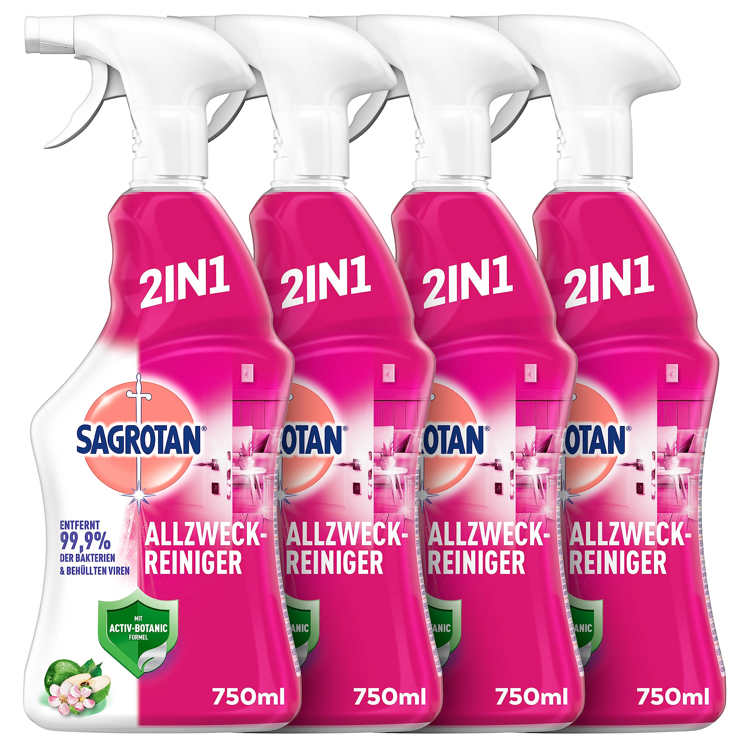 Sagrotan Allzweck-Reiniger Blütenfrische & Grüner Apfel – 2in1 Desinfektionsreiniger für die zuverlässige Reinigung von Oberflächen – 4 x 750 ml Sprühflasche