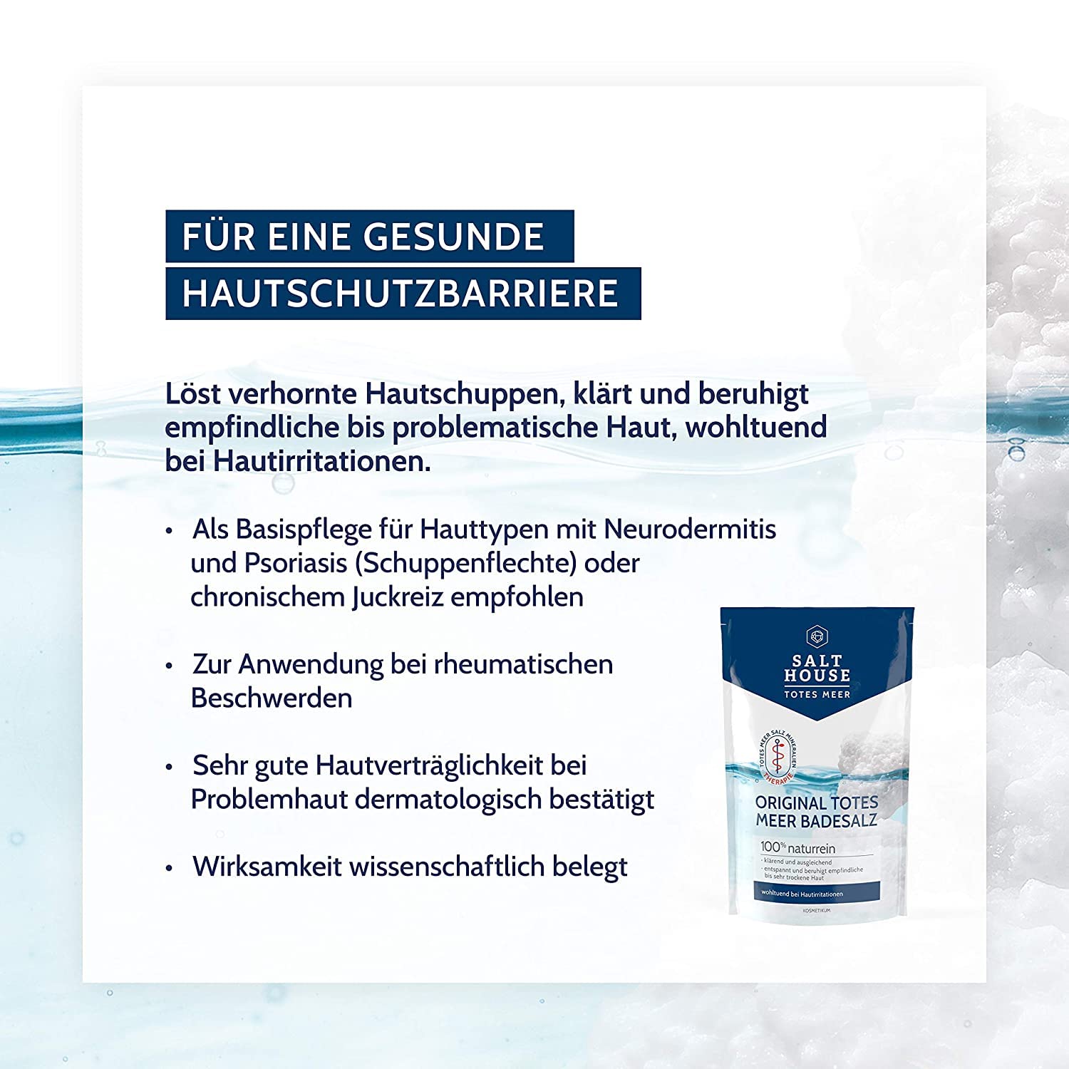 • ???? DERMATOLOGISCH BESTÄTIGT: Das Totes Meer Badesalz hat eine sehr gute Hautverträglichkeit bei Problemhaut und ist für Hauttypen mit Neurodermitis und Psoriasis (Schuppenflechte) geeignet.