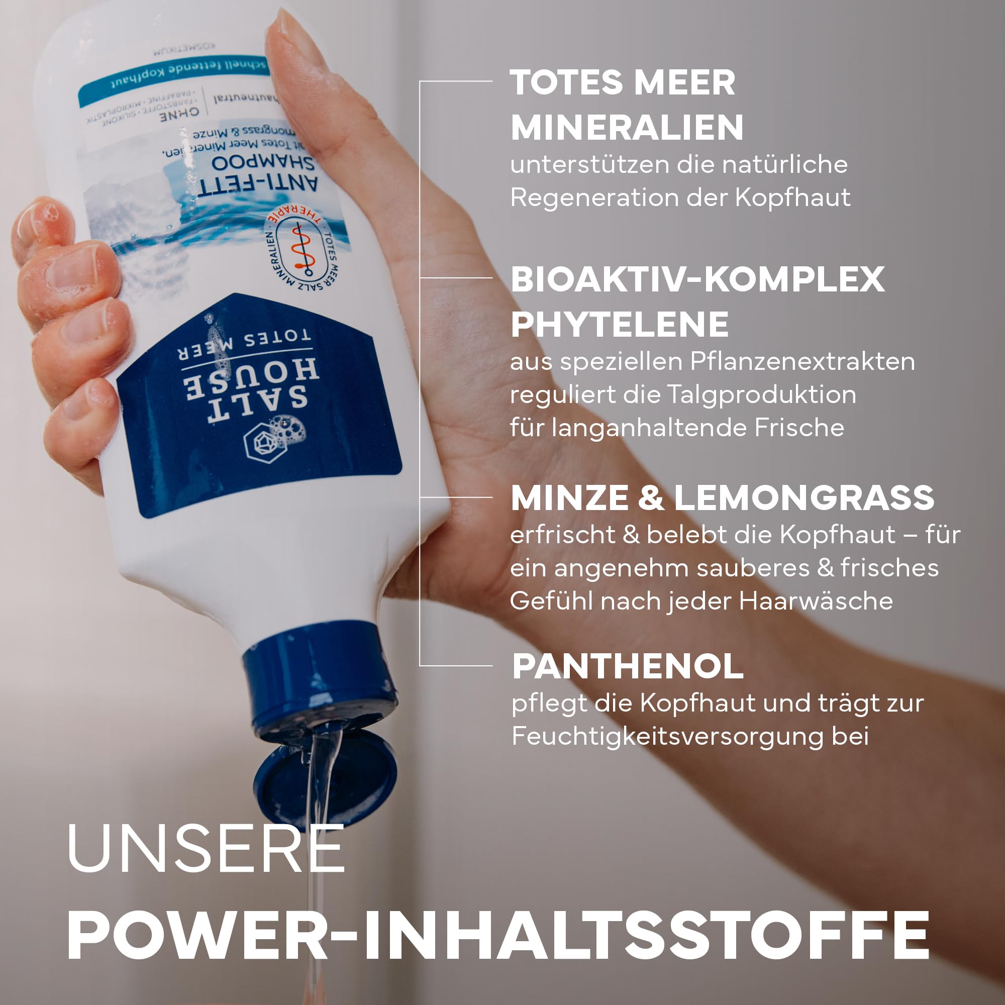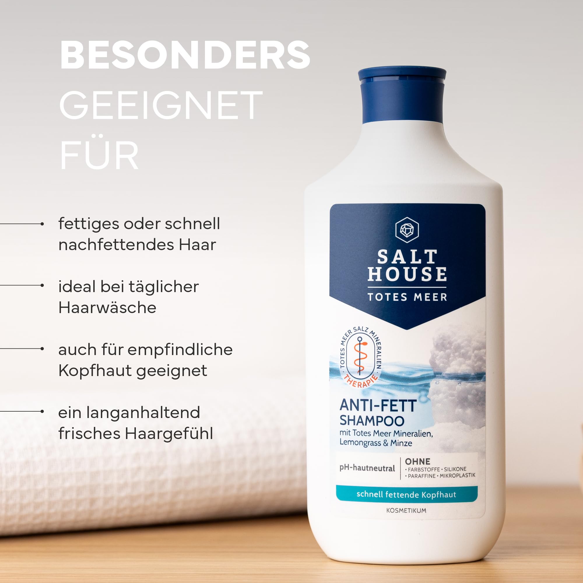 • ???? KLÄRENDE PFLEGE GEGEN FETTIGE KOPFHAUT: Das erfrischende SALTHOUSE Totes Meer Therapie Anti-Fett Shampoo mit naturreinen Totes Meer Mineralien und dem innovativen Bioaktiv-Komplex Phytelene aus speziellen Pflanzenextrakten reinigt gründlich und entfernt überschüssiges Fett von Kopfhaut und Haar. Für ein leichtes, frisches Haargefühl.