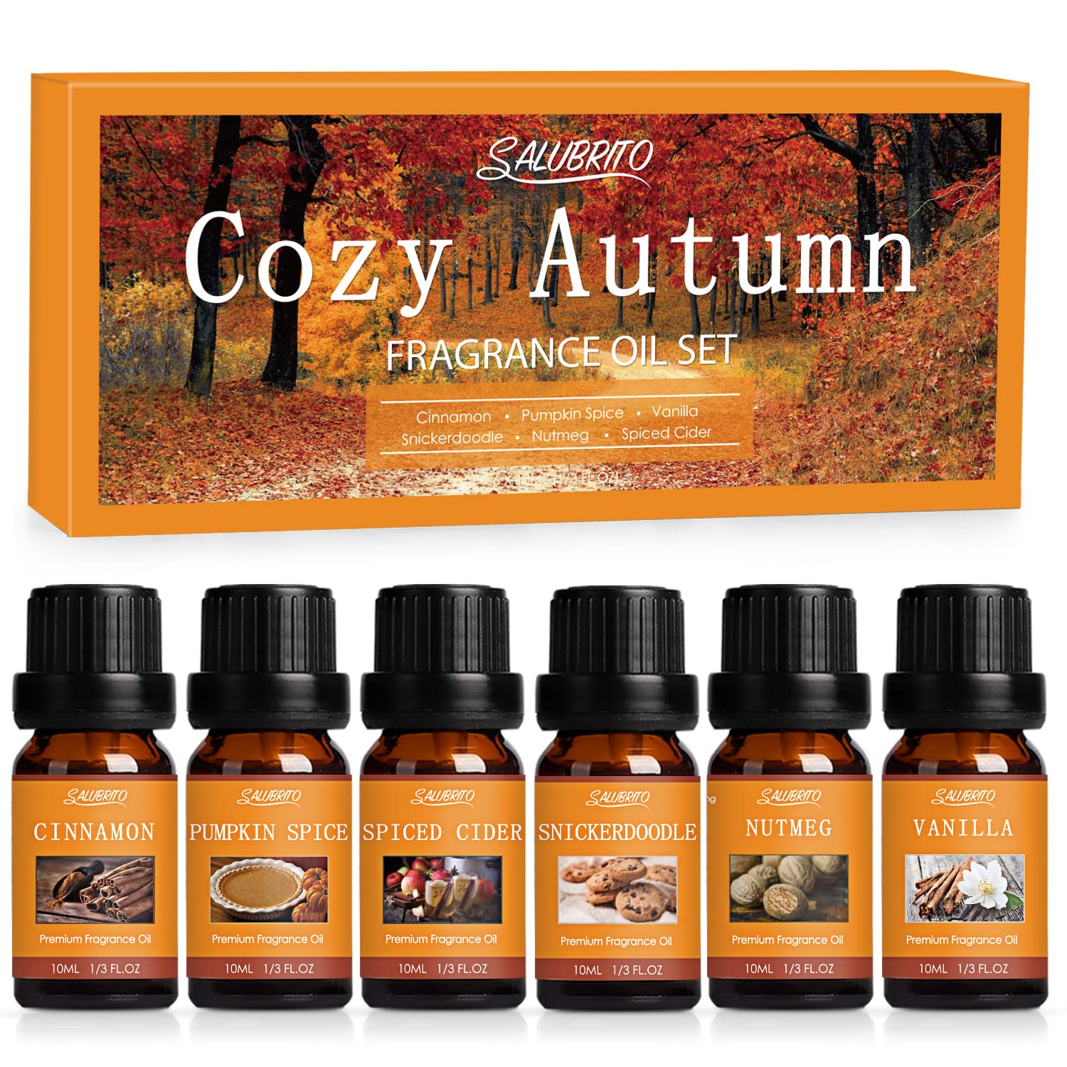 • ???? SALUBRITO Herbst Ätherische Öle Set 6 x 10 ml verschiedene schöne Düfte für die gemütliche Herbstsaison: Zimt, Kürbisgewürz, gewürzter Apfelwein, Snickerdoodle, Vanille, Muskatnuss. Diese Düfte sind eine perfekte Möglichkeit, diesen wunderbaren Herbstduft einzufangen.