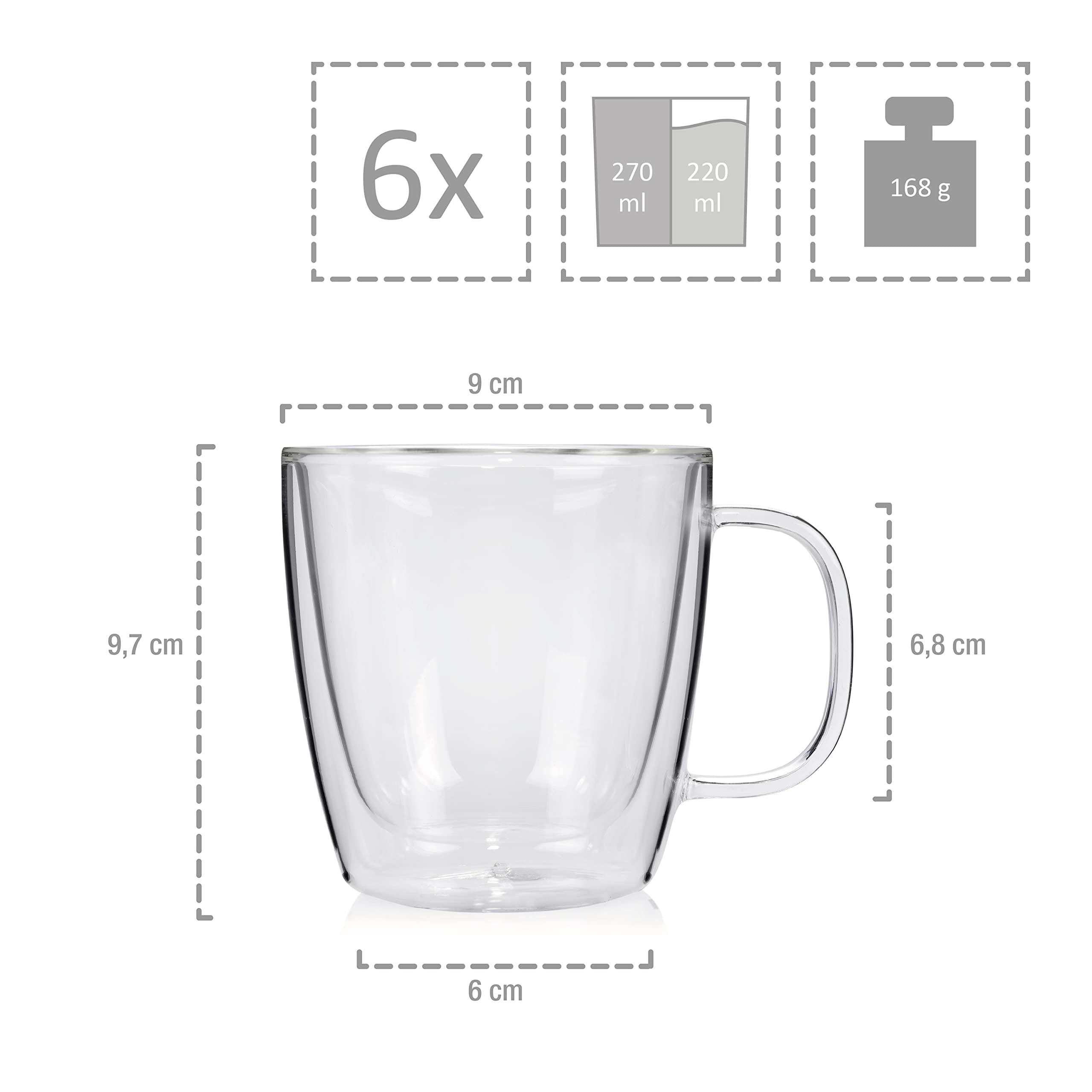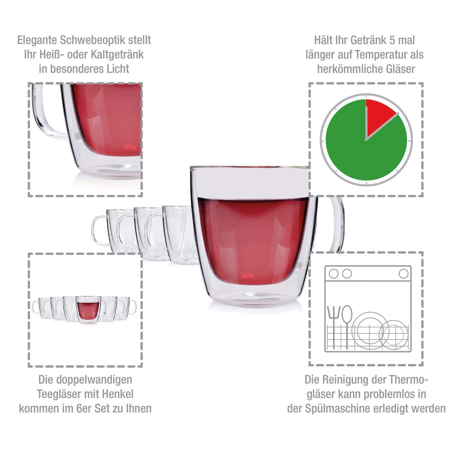 Sänger | Doppelwandige Gläser mit Henkel, 6-teiliges Gläser-Set, Thermo-Gläser, Kaffee Gläser doppelwandig | Füllmenge 220 ml