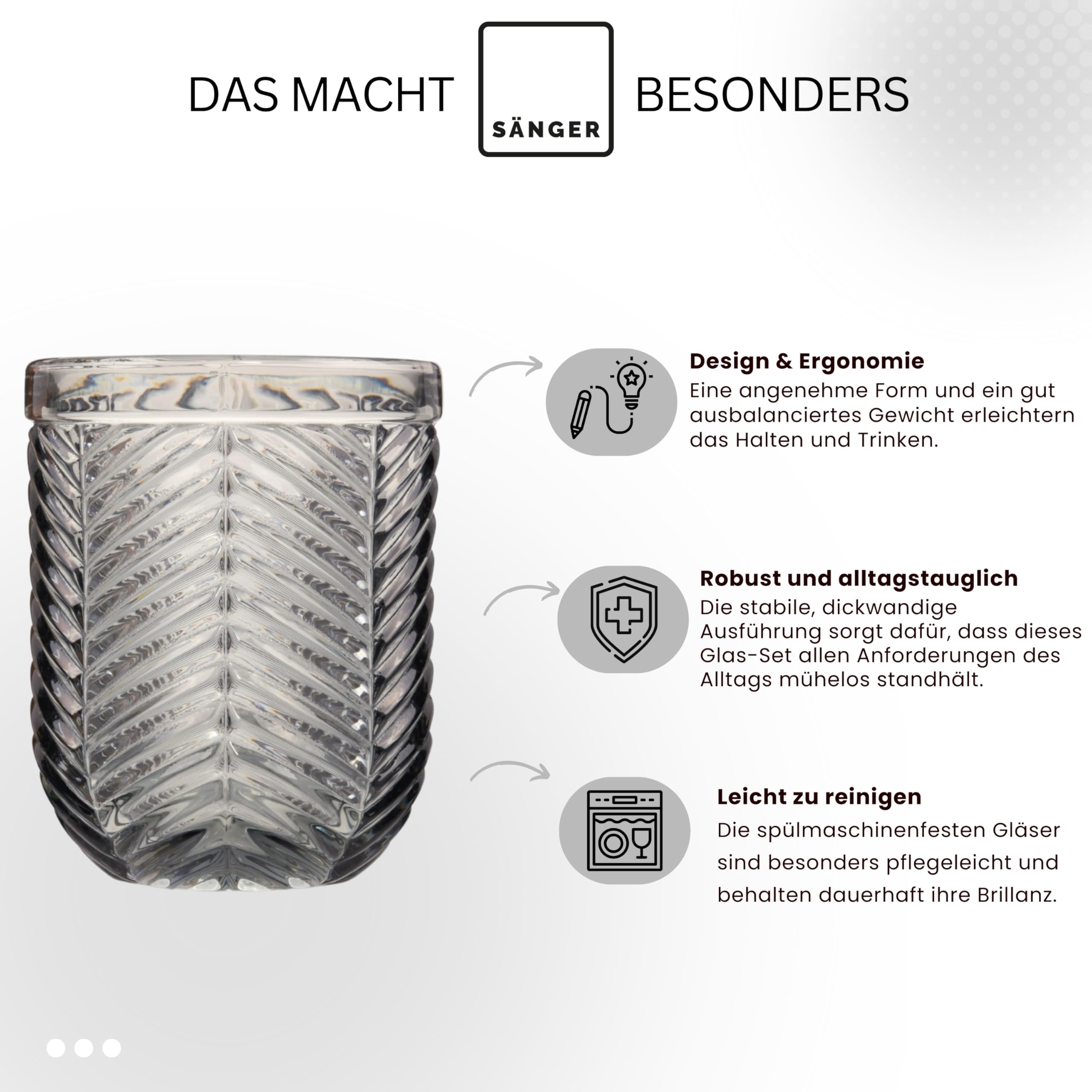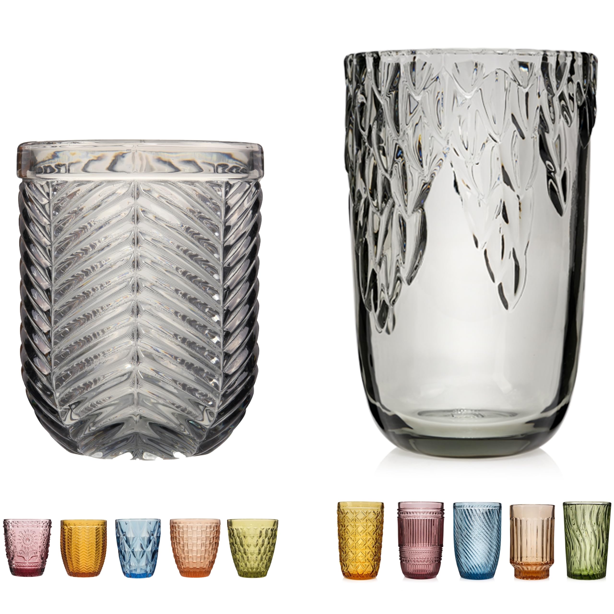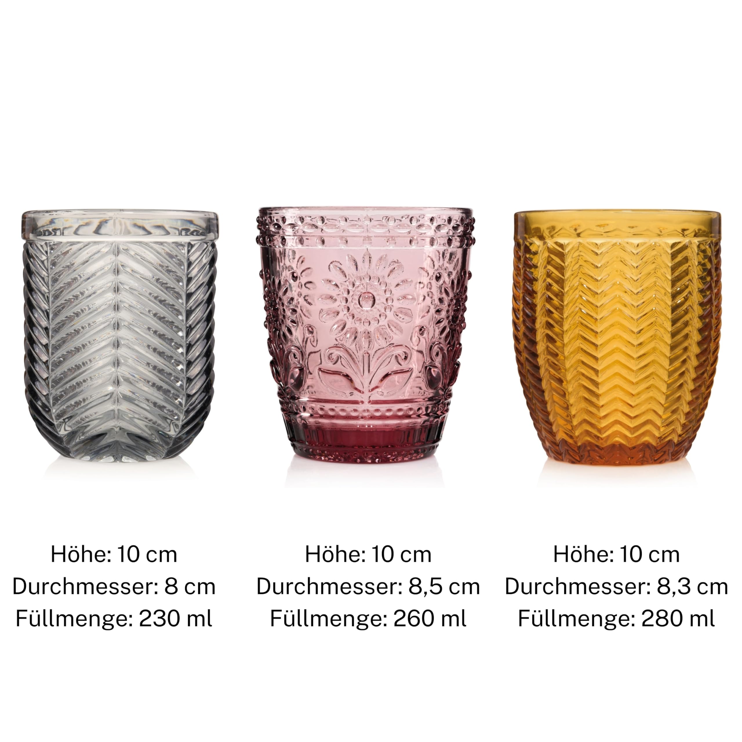 Sänger Trinkgläser aus Glas Set 220ml - 370ml 12 teiliges Gläser Set für 12 Personen aus Glas, Saftgläser, Trinkbecher mit Muster, Wassergläser, Mehrfarbig, Longdrinkgläser, Cocktailgläser