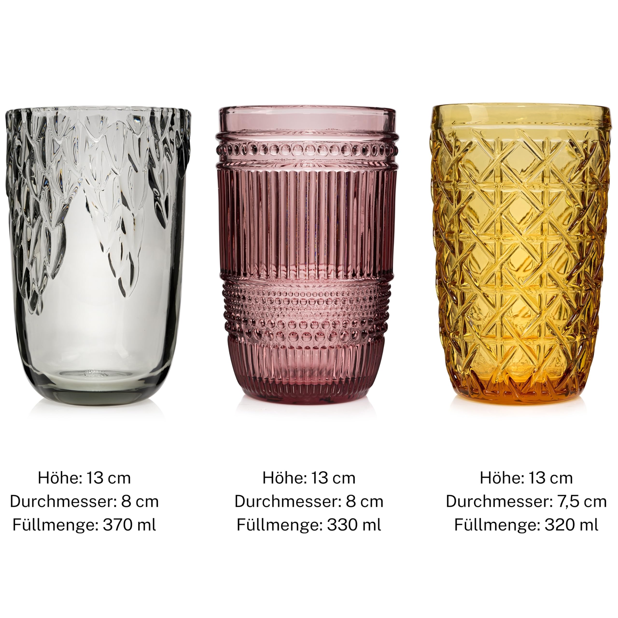 MEHRFARBIGES GLÄSERSET Moderne, bunte Trinkgläser, die aus einer anderen Zeit zu sein scheinen, in sechs, sorgfältig aufeinander abgestimmten Farben: Grün, Bernstein, Blau, Grau, Orange und Lila werden Ihren gedeckten Tisch perfekt ergänzen. Dieses spülmaschinenfeste Wassergläser-Set sieht nicht nur toll aus, es ist äusserst funktional, langlebig und robust. MULTIFUNKTIONALES DESIGN Die Longdrinkgläser zeichnen sich zum einen durch Ihre unterschiedlichen Farben und zum anderen durch Ihre wunderschönen Formen aus. Die Formen sind zueinander sehr unterschiedlich und passen dennoch perfekt zueinander. Bei Lichteinfall ist durch die unterschiedlichen Muster eine einzigartige Spieglung zu sehen, weshalb diese Gläser sich auch perfekt als Windlichter eignen. LIEFERUMFANG 1x Glas Faro Grün | 8 cm Durchmesser x 13 cm Höhe | Füllvolumen: 330 ml 1x Glas Faro Bernstein | 7,5 cm Durchmesser x 13 cm Höhe | Füllvolumen: 320 ml 1x Glas Faro Blau | 8 cm Durchmesser x 13 cm Höhe | Füllvolumen: 370 ml 1x Glas Faro Orange | 7,5 cm Durchmesser x 13 cm Höhe | Füllvolumen: 310 ml 1x Glas Faro Grau | 8 cm Durchmesser x 13 cm Höhe | Füllvolumen: 370 ml 1x Glas Faro Lila | 8 cm Durchmesser x 13 cm Höhe | Füllvolumen: 330 ml HOCHWERTIGE QUALITÄT Das aus 6 Einzelteilen bestehende Gläser Set überzeugt nicht nur durch die Optik, sondern vor allem durch die Qualität. Das Set von SÄNGER ist spülmaschinenfest, langlebig und robust. Dekorationsartikel gehören nicht zum Leistungsumfang. Bitte entnehmen Sie alle dazugehörigen Teile dem Feld "LIEFERUMFANG".
