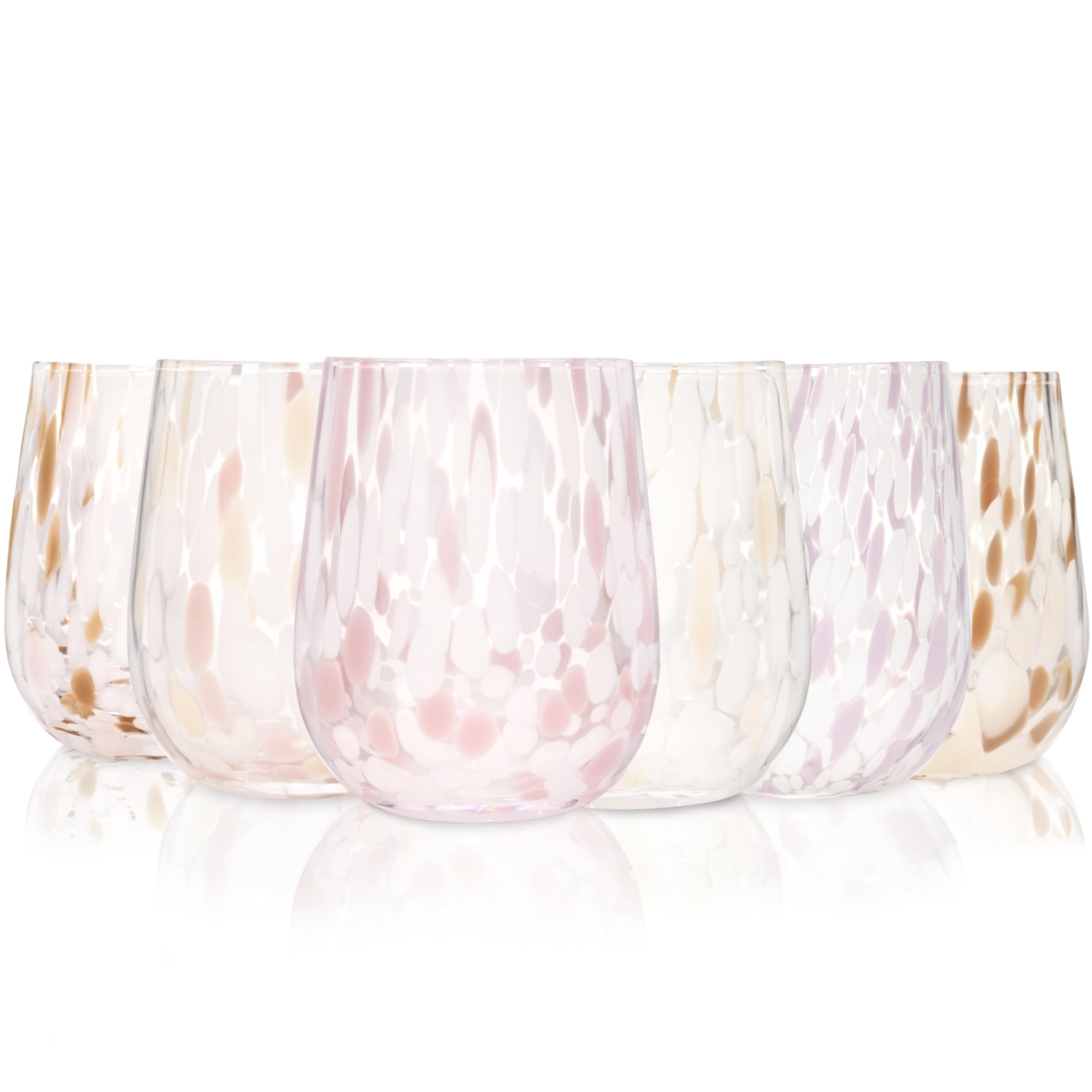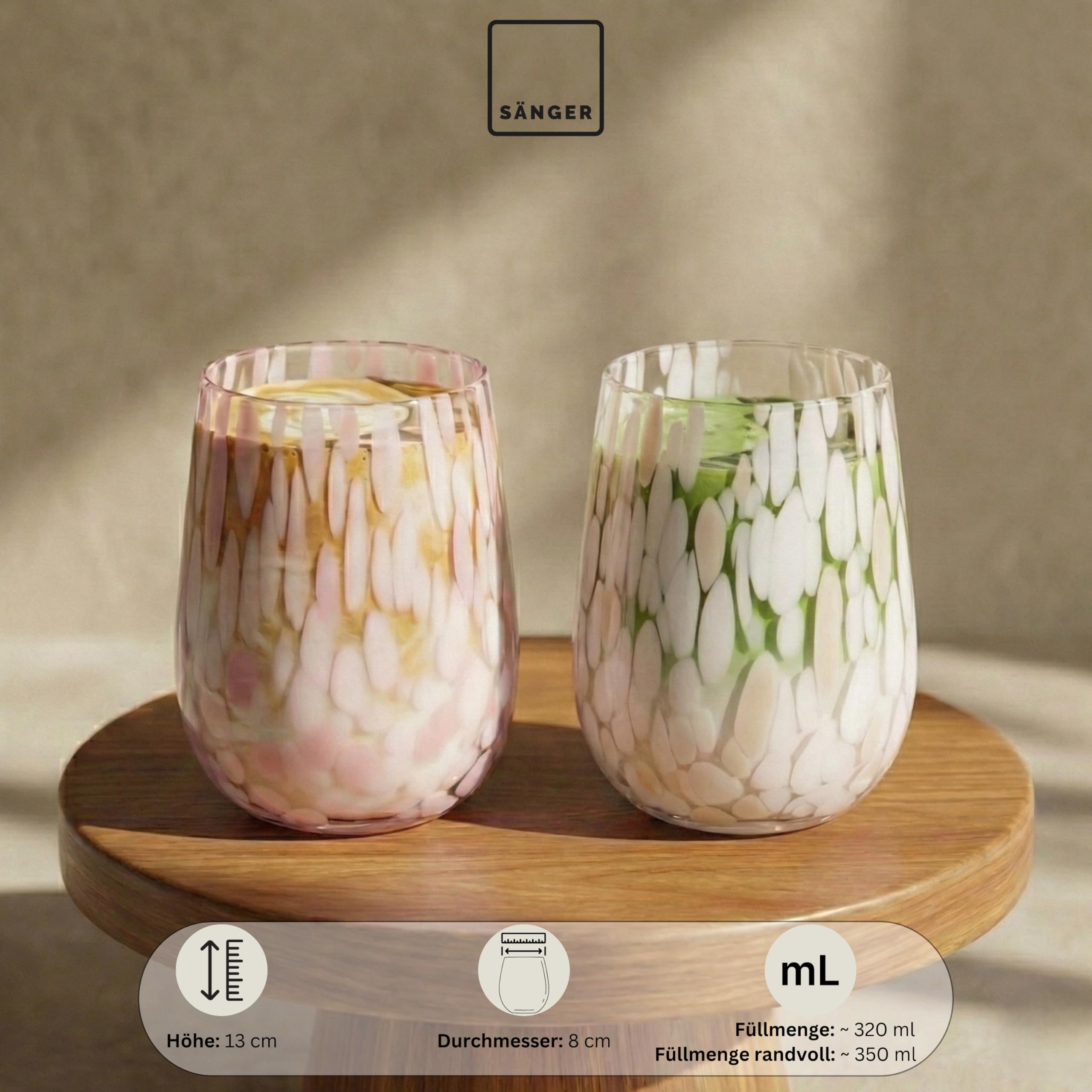 MEHRFARBIGES GLÄSERSET Das Curacao Trinkgläser-Set bringt mit seinen zarten, mehrfarbigen Mustern Leben und Eleganz auf jeden Tisch. In sanften Tönen von Rosa, Beige, Braun und Lila gestalten die Gläser ein harmonisches Gesamtbild – perfekt für gesellige Runden oder den täglichen Gebrauch. Dieses spülmaschinenfeste Wassergläser-Set sieht nicht nur toll aus, es ist äusserst funktional, langlebig und robust. DESIGN & FUNKTIONALITÄT Die Gläser überzeugen nicht nur durch ihr modernes, handgefertigtes Design, sondern auch durch ihre Alltagstauglichkeit. Dank der leicht bauchigen Form liegen sie angenehm in der Hand und sind vielseitig einsetzbar – als Wasserglas, Saftglas oder dekoratives Element. LIEFERUMFANG 6x Glas Curacao, jeweils mit individuellem Punktmuster: Transparent mit weissen & rosa Akzenten Transparent mit weissen & beigen Akzenten Transparent mit weissen, beigen & braunen Akzenten Transparent mit zarten Lila Akzenten Transparent mit beigen Akzenten Transparent mit weissen, beigen & rosa Akzenten Masse je Glas: Ø 8 cm | Höhe 13 cm | Füllvolumen angemessen ~320 ml | Füllvolumen randvoll ~350ml QUALITÄT & PFLEGE Die Gläser sind spülmaschinenfest, robust und behalten ihre Brillanz über lange Zeit. Sänger steht für erstklassige Verarbeitung und stilvolles Design – für Alltag, Feierlichkeiten und besondere Anlässe. Dekorationsartikel gehören nicht zum Leistungsumfang. Bitte entnehmen Sie alle dazugehörigen Teile dem Feld "LIEFERUMFANG".