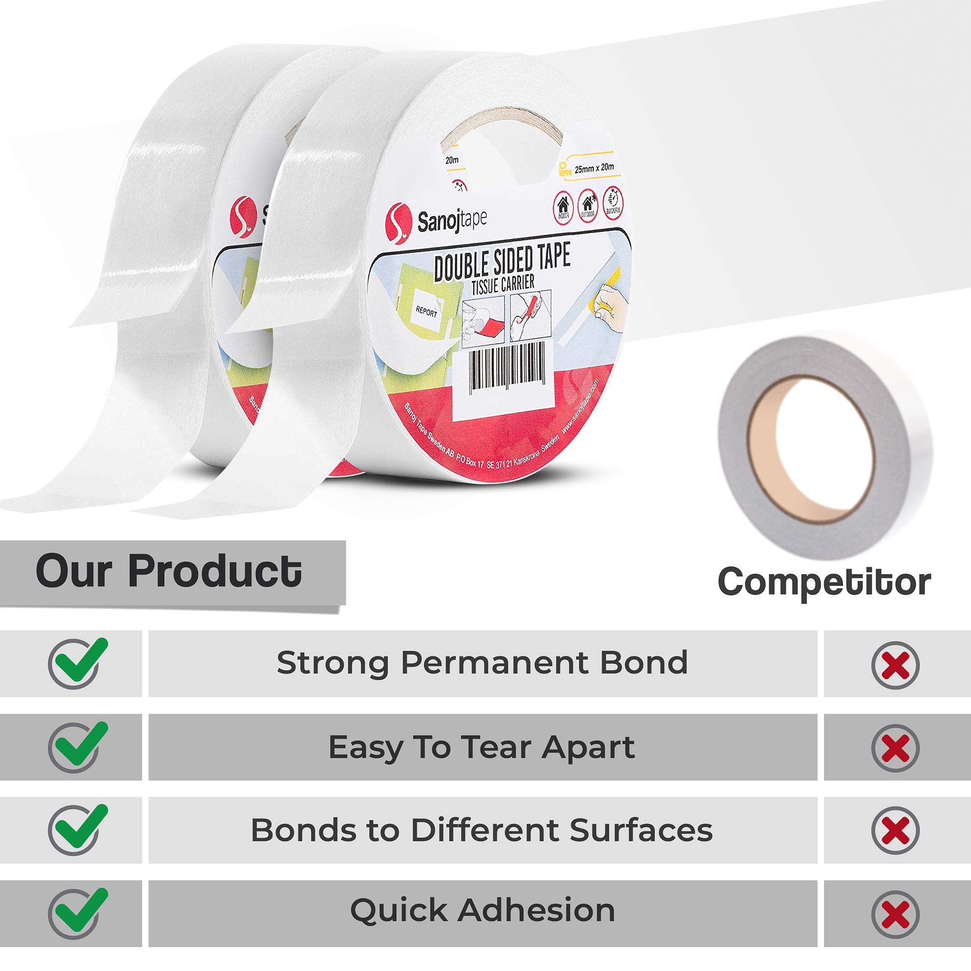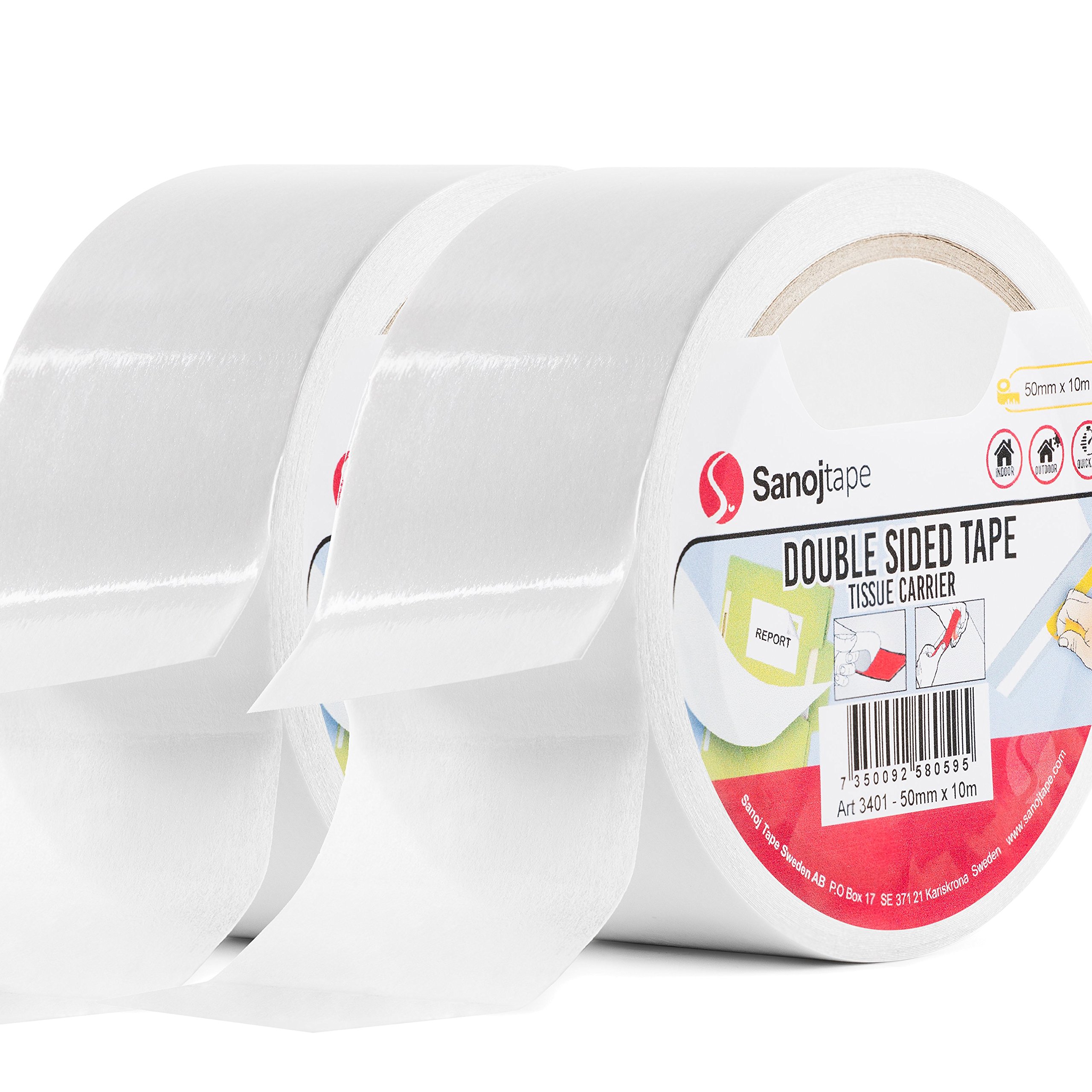 Sanojtape Doppelseitiges Klebeband (2-Pack) für Büro Foto Dekoration 50mm x 10m UNIVERSELLES DOPPELSEITIGES KLEBEBAND: Ein Klebeband für den universellen Einsatz wie Büro, Fotos, Handwerksprojekte, Scrapbooking und Etiketten. Ein doppelseitiges Klebeband für den ganzen Tag FARBE: Halbtransparent mit einer Dicke von 0,09mm. Dies ist ein dünner und klebriger Kleber und verklebt sich gut an den meisten Oberflächen EINFACH ZU BENUTZEN: Dieses doppelseitige Klebeband ist sehr einfach zu bedienen und kann leicht von Hand reissen. Siehe Fotos 2-PACK: Enthält 2 Rollen in der Grösse 50mm x 10m
