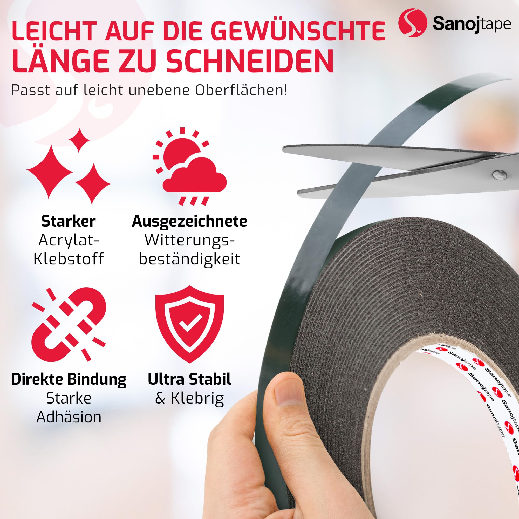 Sanojtape doppelseitiges, schwarzes Schaumklebeband mit einem HDF-Kern (high density foam). Das permanente Acrylat-Haftmittel macht das Klebeband ideal für die permanente Anwendung im Aussenbereich. Ideal für den automotiven Einsatz, wie die Montage der Seitenschutzleisten und die Nummernschilder. Es ist wasserdicht aufgrund der durch Schaum geschlossenen Zellstruktur. Nicht unter +10°C anwenden und stellen Sie sicher, dass die Oberfläche sauber und trocken ist. Immer zuerst prüfen, ob das Band festsitzt, bevor man es Belastungen aussetzt. SUPERSTARK: Ein doppelseitiges Schaumstoffklebeband für Industrie- und Autoindustrie zur idealen Haftung von Zierleisten und Nummernschildern. FARBE: Schwarz und mit einem dauerhaften Acrylkleber für eine starke Haftung. Dieses doppelseitige Klebeband ist besonders klebestark und sorgt für eine gute Soforthaftung. DICKE: Dieses Klebeband weist eine Dicke von 1 mm auf. MULTIFUNKTIONAL EINSATZFÄHIG: Der Klebstoff haftet auf den meisten Oberflächen besonders gut und wird daher besonders gern als Universalmontageband eingesetzt. ABMESSUNGEN: 1 Rolle 9mm x 10m. Die Lieferung erfolgt in einem wiederverschliessbaren beutel. Für eine einfache Anwendung in einem wiederverschliessbaren Beutel für den nächsten Gebrauch. Dieses doppelseitige Klebeband für den täglichen Gebrauch sorgt für eine gute Haftung bei Ihren Projekten!