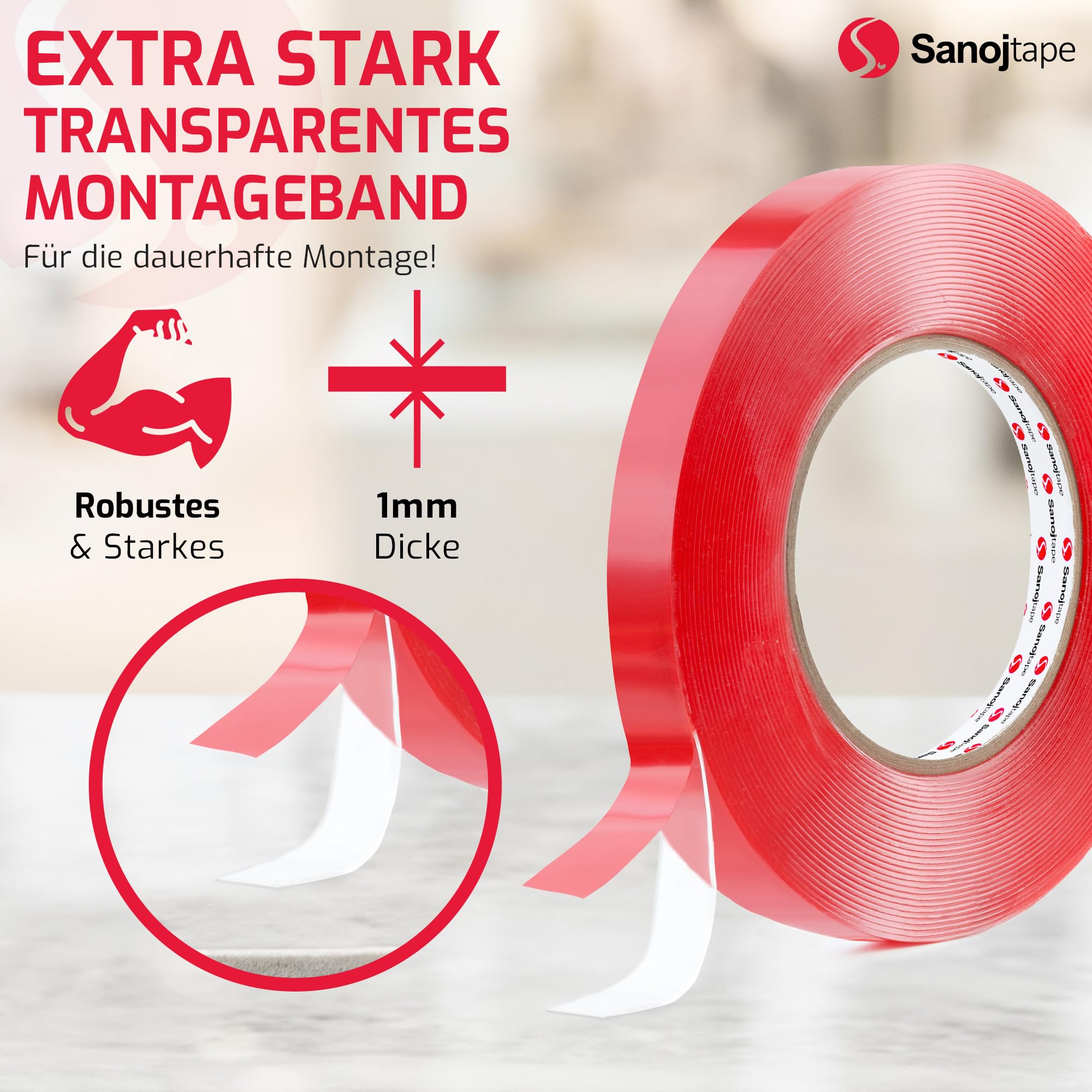 Strapazierfähiges transparentes Sanojtape-Montageband wird für das permanente Haften auf den meisten hochenergetischen Oberflächen wie Glas, Metall, Kunststoff z.B. Hart-PVC, Acryl, Polycarbonat, ABS sowie auf den meisten versiegelten Holzanstrichen und Pulverlackierungen verwendet. Dieses transparente Klebeband verfügt über eine Dicke von 1 mm, um auf glatten und rauen Oberflächen zu haften. Aufgrund seiner guten UV-Beständigkeit und seiner Wasser- und Feuchtigkeitsabdichtung eignet es sich hervorragend für Anwendungen im Aussenbereich. Dieses Band ist nicht ablösbar. Bei dem Versuch, es abzulösen, kann es zu Schäden oder Rückständen kommen. Nicht geeignet, wenn es durch das Herunterfallen des montierten Teils zu Personenschäden kommen könnte Nicht geeignet für Tapeten, empfindliche, gebogene oder antihaftbeschichtete Flächen und Trockenbauwände. Nano Klebeband