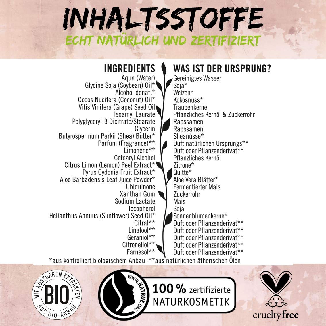 Bio-Zitrone ist bekannt fuer ihre belebenden und erfrischenden Eigenschaften, waehrend Q10 und Quitte die Haut sichtbar glatter und vitaler erscheinen lassen. Die Lotion eignet sich ideal fuer den taeglichen Einsatz, um Haut und Sinne gleichzeitig zu vitalisieren.