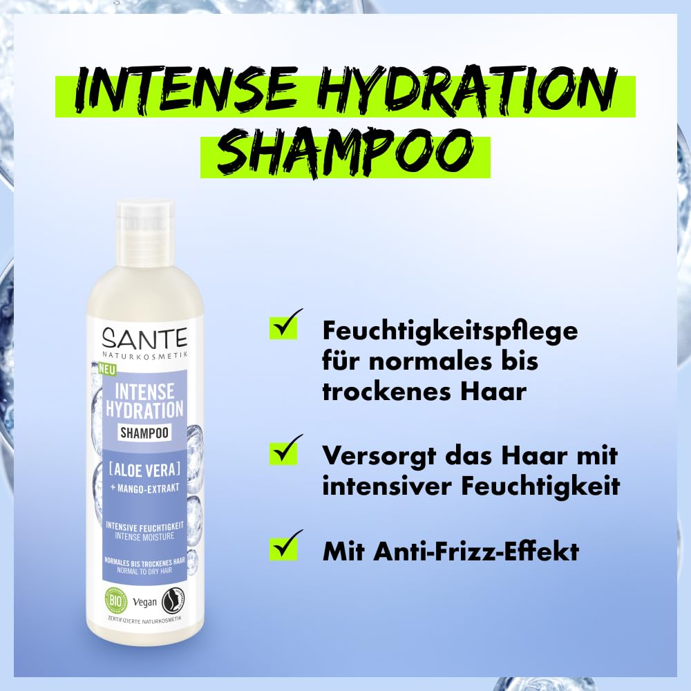 SANTE Naturkosmetik Intense Hydration Shampoo Aloe Vera + Mango-Extrakt, veganes Pflegeshampoo für intensive Feuchtigkeit, stärkt trockenes Haar, 250ml