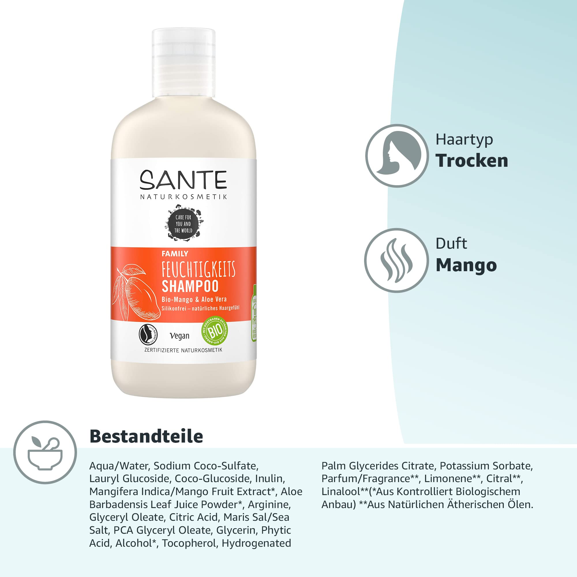 SANTE Naturkosmetik Feuchtigkeits Shampoo Bio-Mango & Aloe Vera, Spendet Feuchtigkeit, Glänzendes Haar, Natürliche Haarpflege für trockenes Haar, Vegan, 250ml