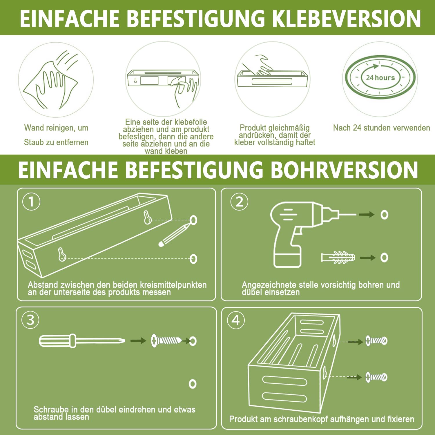 Tipps: Selbstklebende Montage, nur geeignet für glatte Oberflächen wie Theken, Fliesen, Glas, Holz, Marmor, Metall etc. Nicht geeignet für raue Oberflächen wie Tapeten, gestrichene Wände, Putzwände, Betonwände