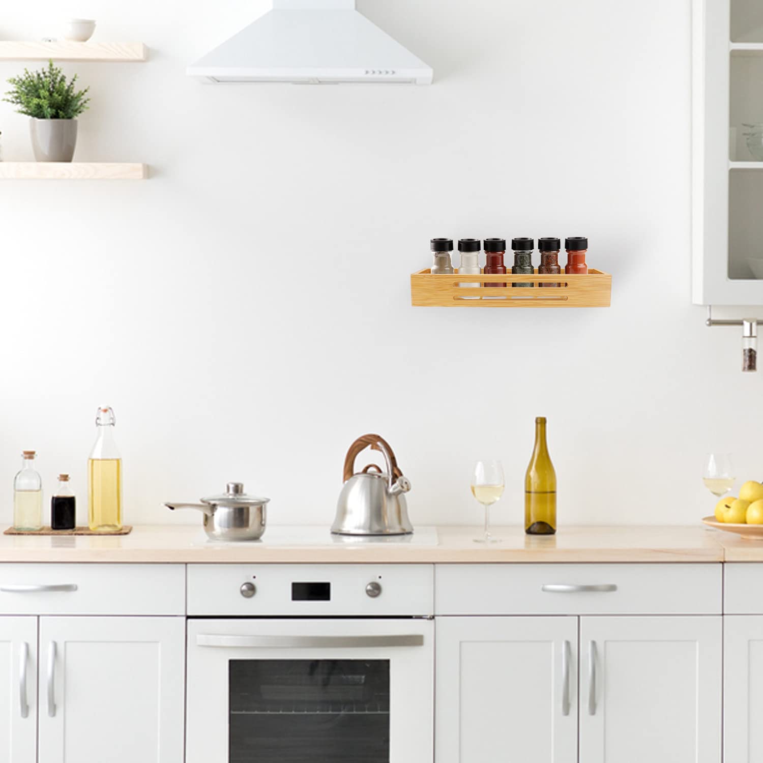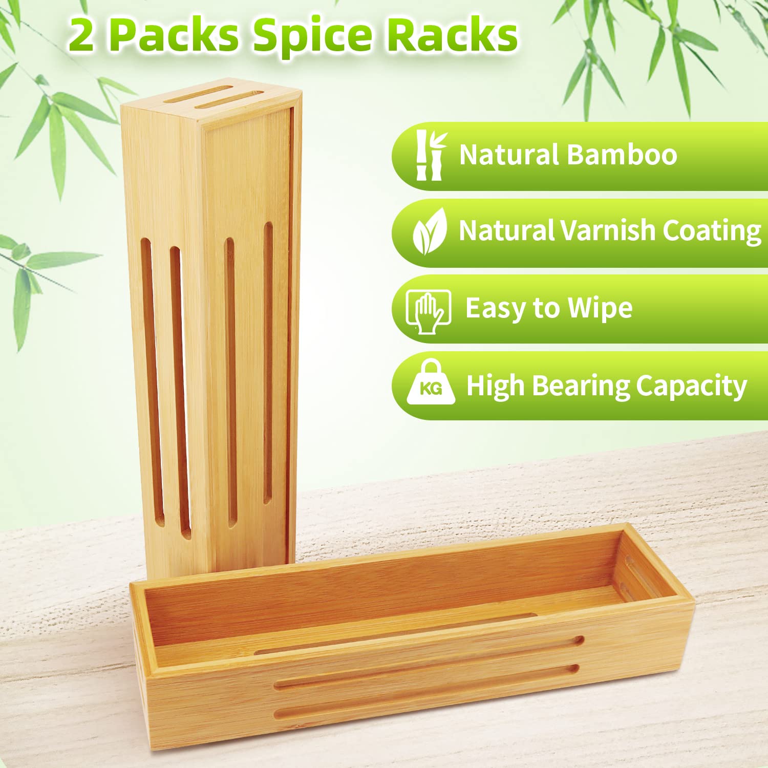 SAUNNIHEN Bambus Gewürzregal Ohne Bohren, 2 Stück Gewürzständer Wand, Gewürzhalter kann Schranktüren Kühlschrank, Stehend oder Hängend verwendbar, Selbstklebende oder Gebohrte Montage