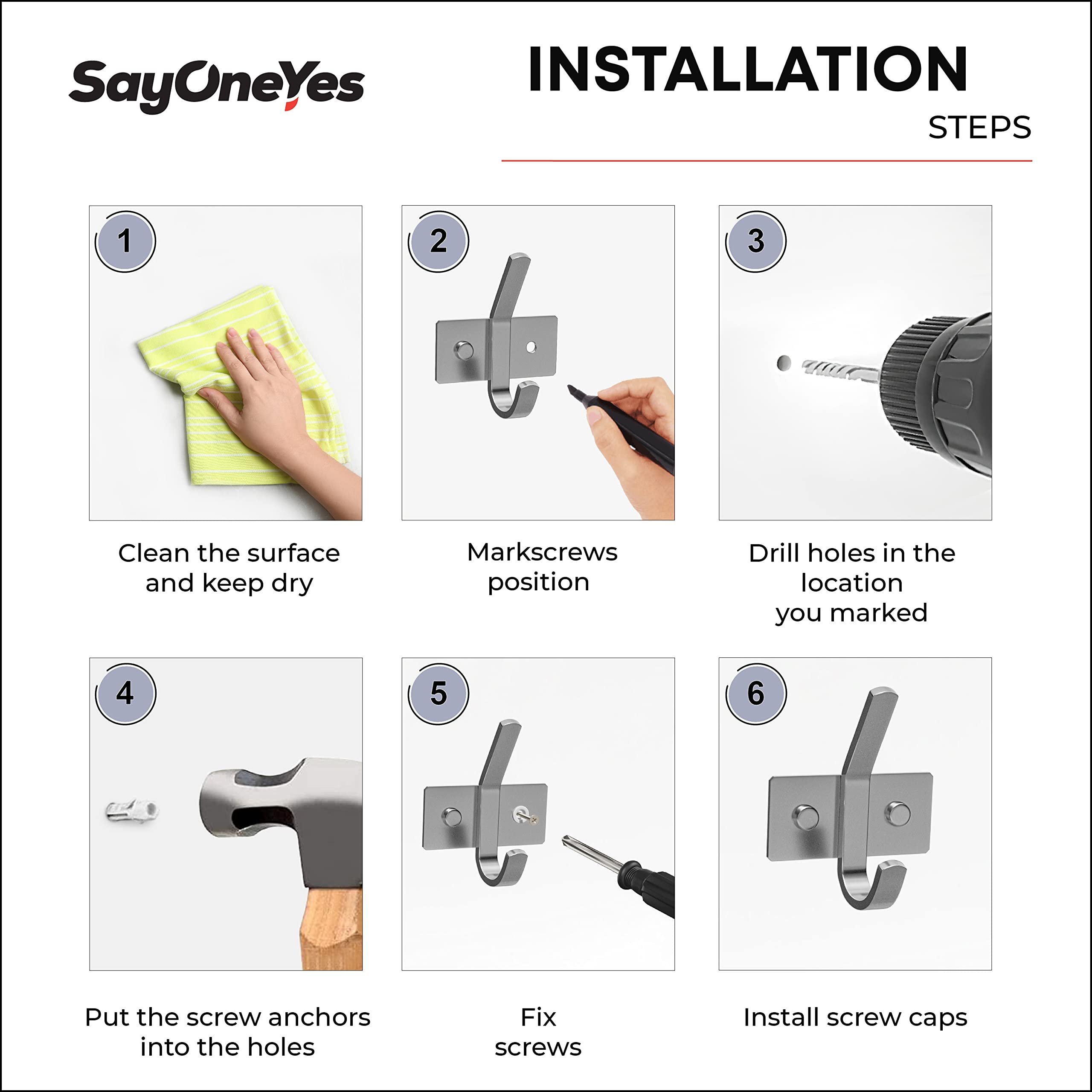 -Montageanleitung:Richte die Garderobenhaken an der Wand aus und markiere dann die Punkte der Löcher an der Wand mit einem Bleistift.Bohre mit einer Bohrmaschine senkrecht Löcher an den beiden Markierungen.Schiebe den Kunststoffdübel in die Wand. Falls nötig, klopfe den Dübel mit einem Hammer hinein.Richte die Basis aus und stecke die Unterlegscheiben durch die Schraube. Führe die Haken-Schraube in den Kunststoffdübel ein und beginne, sie im Uhrzeigersinn zu drehen.Schraubkappen abdecken. -Spezifikationen:Markenname: SAYONEYES.Typ: Kleider-Wandhaken, Schlüsselhaken zum Aufhängen von Schlüsseln, Wandhaken für Mäntel, Haken zum Aufhängen von Handtüchern.Stil: Moderner, stilvoller Look.Anzahl der Wandhaken: 5.Farbe: Silber.Material: SUS 304-Edelstahl.Oberfläche: Gebürstet. Installationsmethode: Wandmontage. -Lieferumfang:5 x Kleiderhaken.10 x Dübel.10 x Schrauben.10 x Schraubkappen.