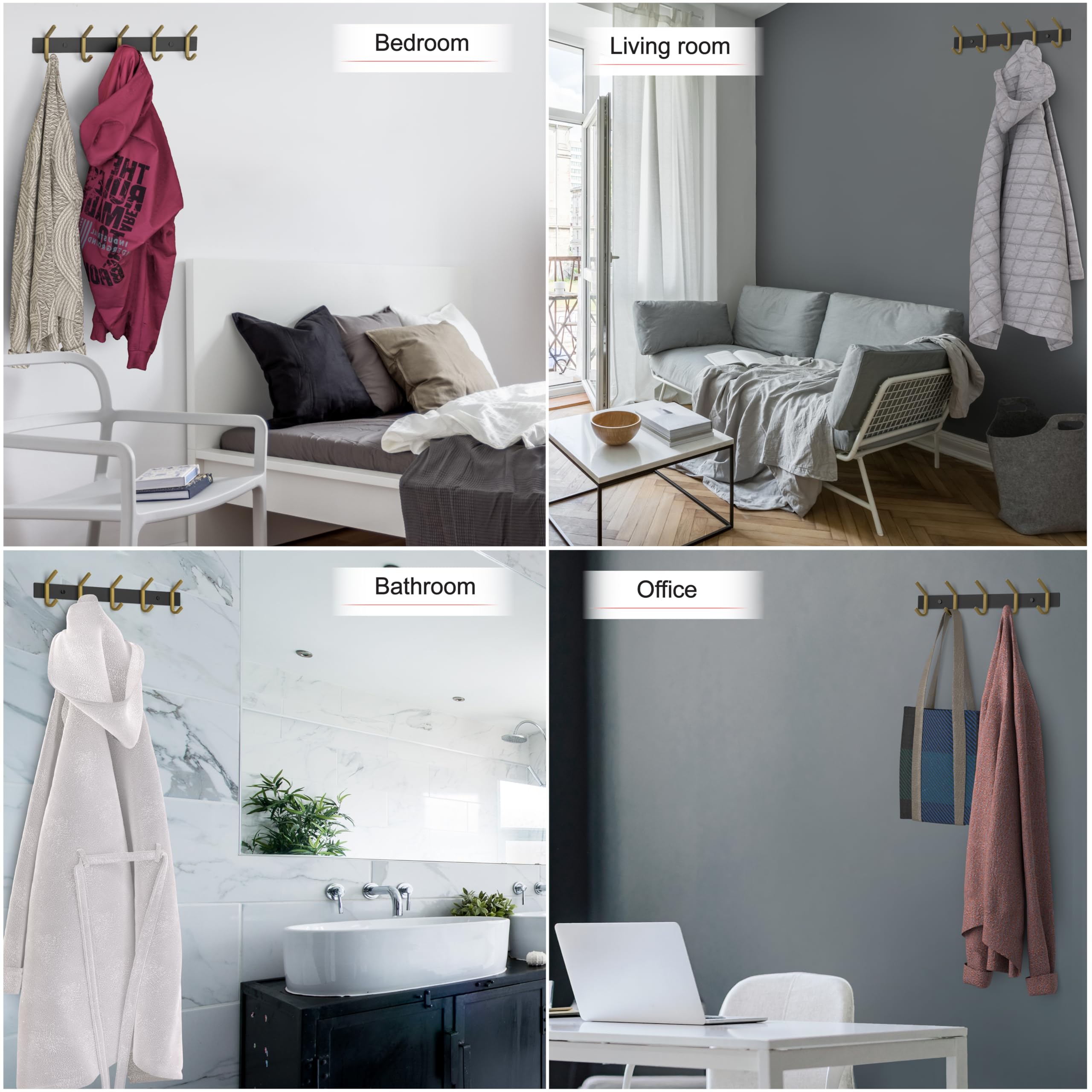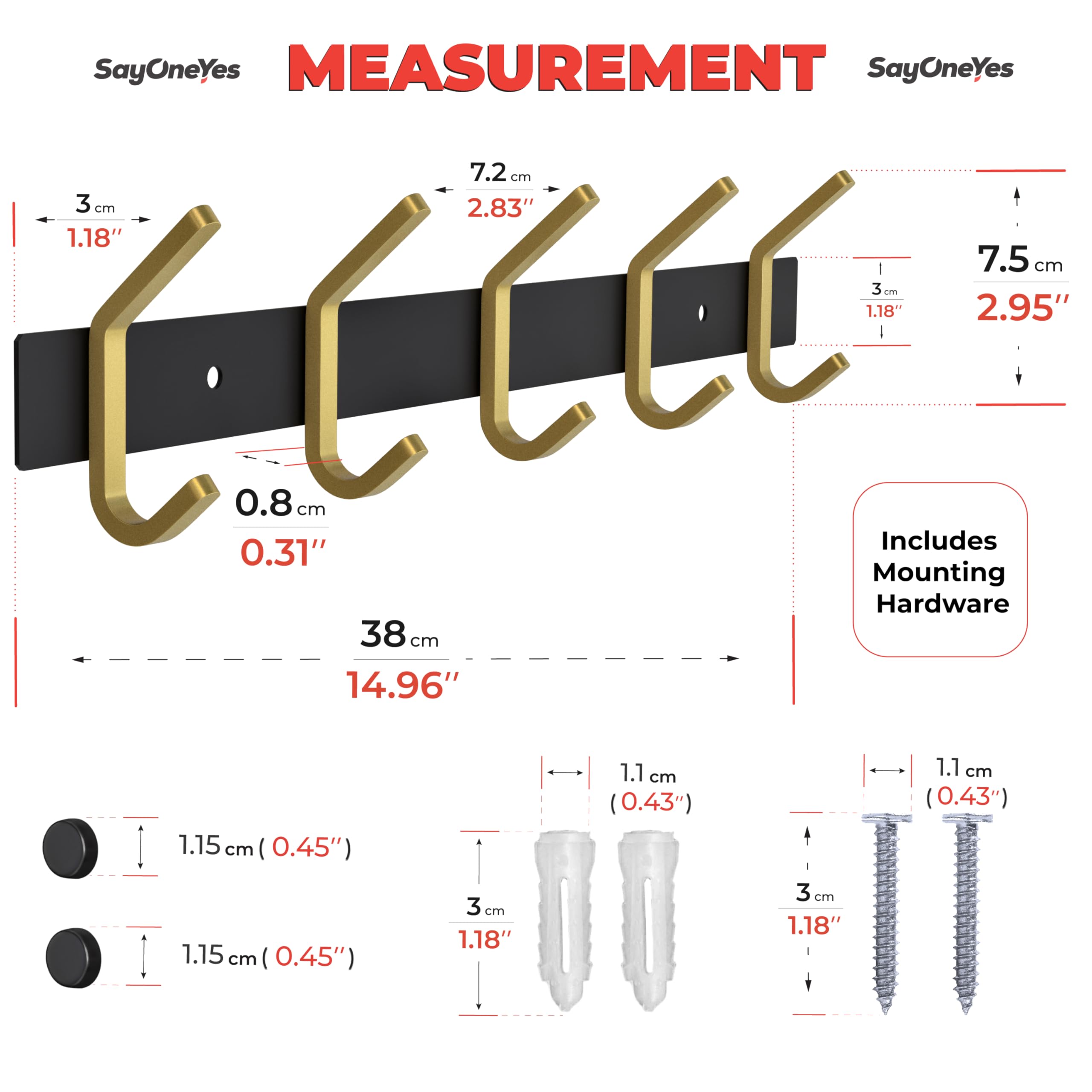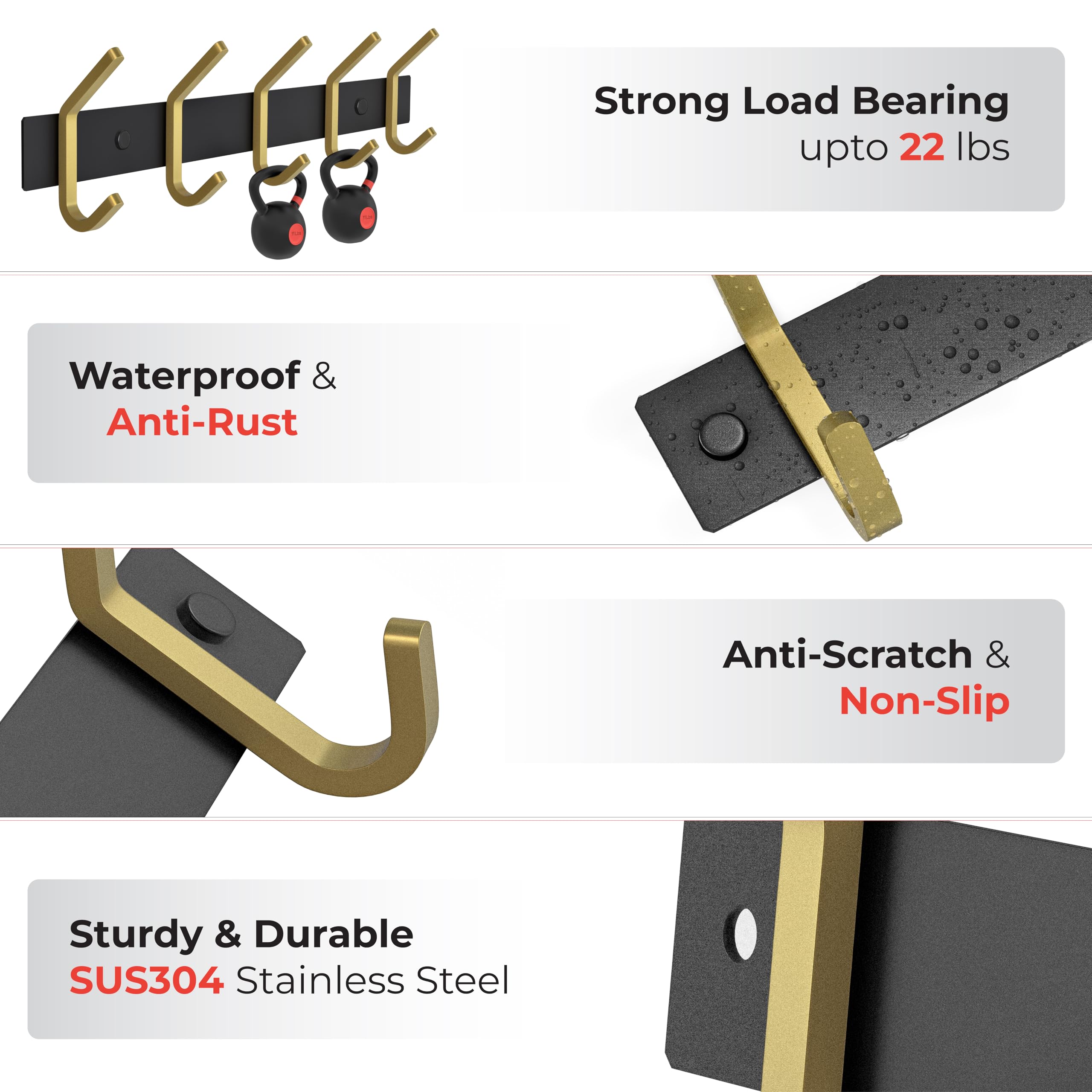 SAYONEYES Wandgarderobe - Schwarz und Gold Hakenleiste mit 5 Doppelgarderobenhaken, 38,1 cm Edelstahl-Wandhaken für Eingangsbereich, Badezimmer, Schlafzimmer, Schrank, Handtuch, Hut, Tasche, robuster