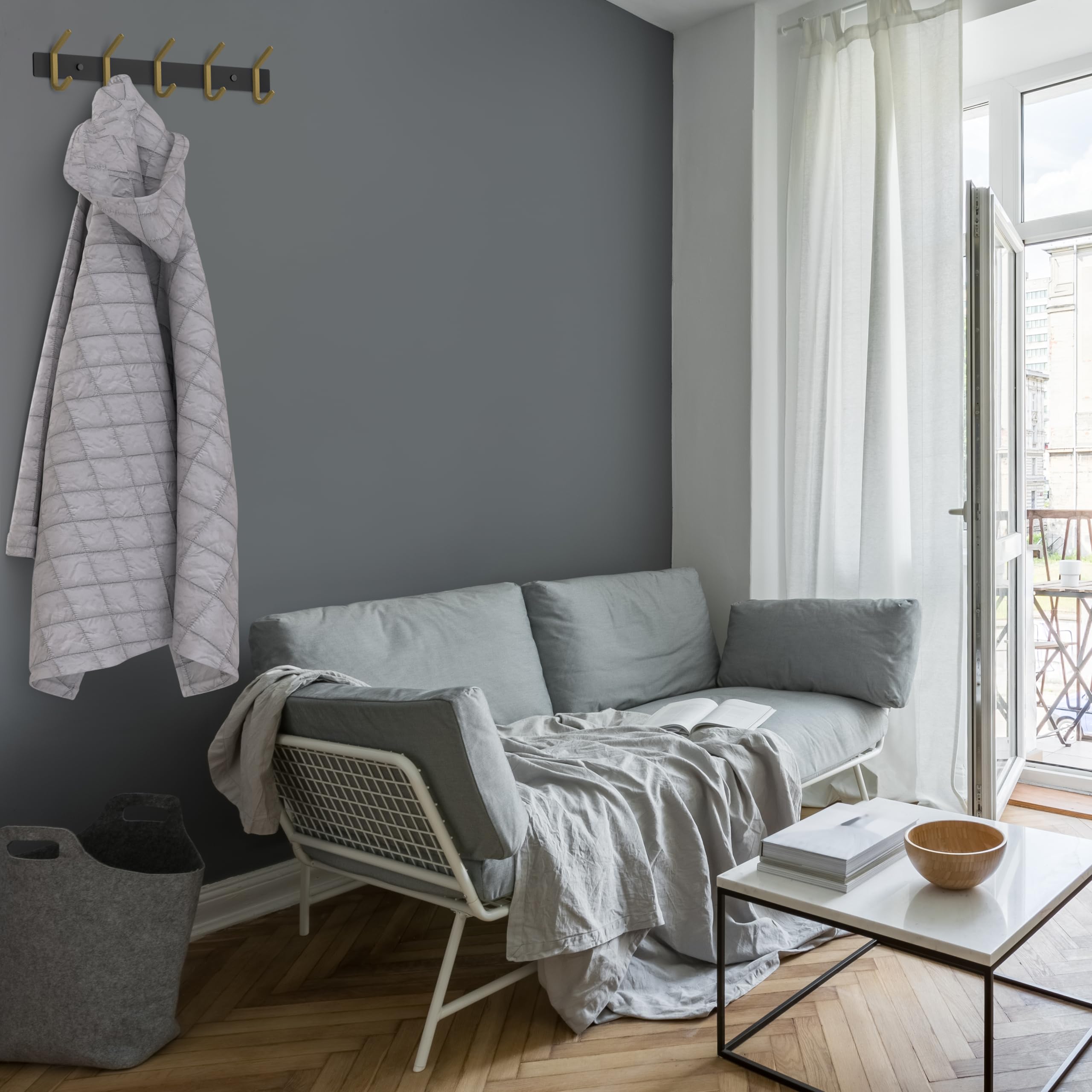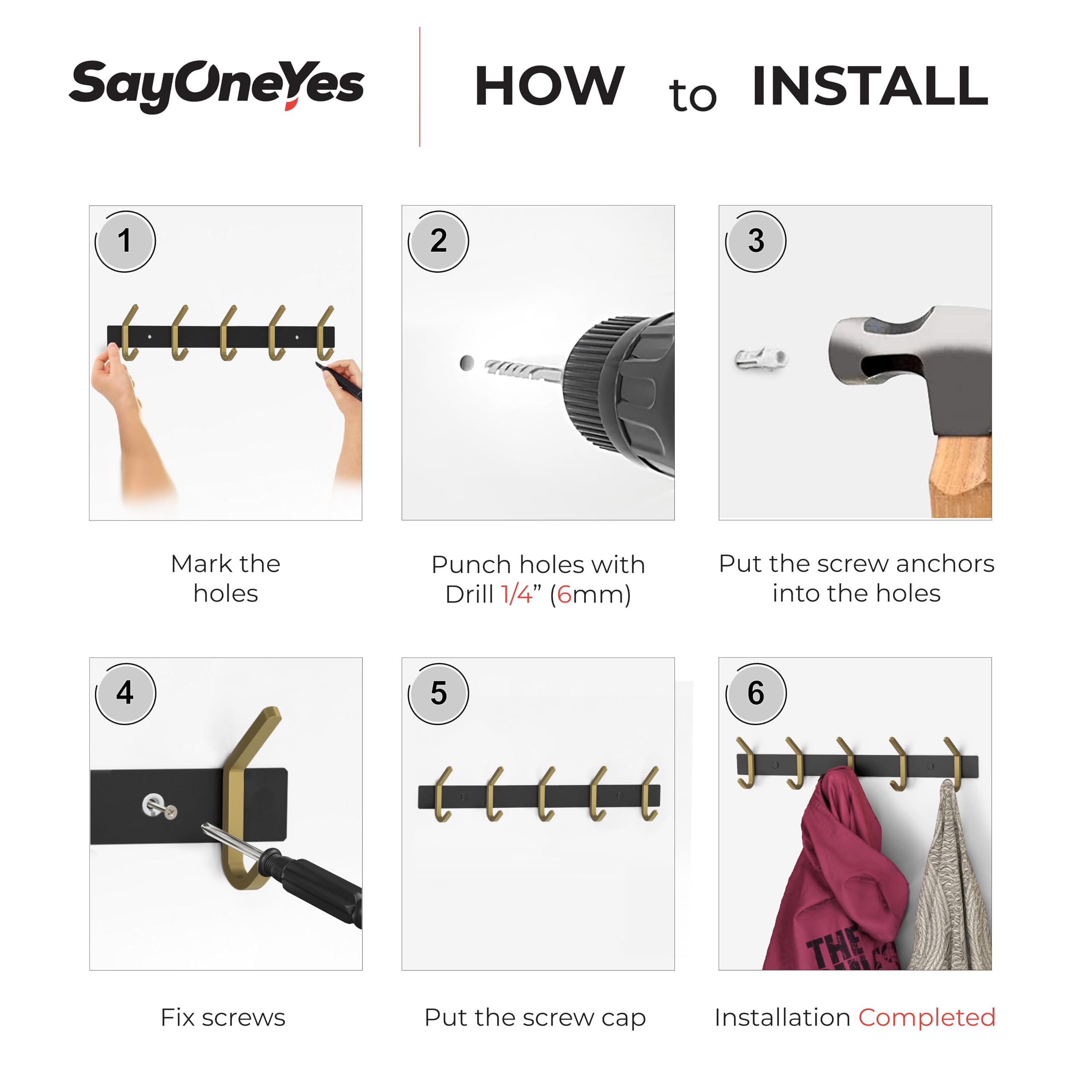 Montageanleitung: Richten Sie die Garderobe an der Wand aus und markieren Sie dann die Spitze der Löcher an der Wand mit einem Bleistift. Mit einer elektrischen Bohrmaschine vertikal an den beiden Markierungen bohren. Schieben Sie den Kunststoff-Spreizanker in die Wand, bei Bedarf klopfen Sie den Anker mit einem Hammer. Richten Sie die Basis aus und stecken Sie die Unterlegscheiben durch die Schraube. Stecken Sie die Hakenschraube in den Kunststoffanker und beginnen Sie, sich im Uhrzeigersinn zu drehen. Schraubverschlüsse abdecken. ♻ Spezifikationen: Markenname: SAYONEYES Typ: Wandhaken, Garderobenleiste, Huthaken, Wandregal, Kleiderbügelhaken. Stil: Modern und stilvoll. Anzahl der Wandhaken: 05. Farbe: Schwarz und Gold. Material: SUS304 Edelstahl. Oberfläche: matt. Installationsmethode: Wandmontage. Lieferumfang: 1 x Sayoneyes Wandgarderobe. 2 x Anker. 2 x Schrauben. 2 x Schraubenabdeckungen.