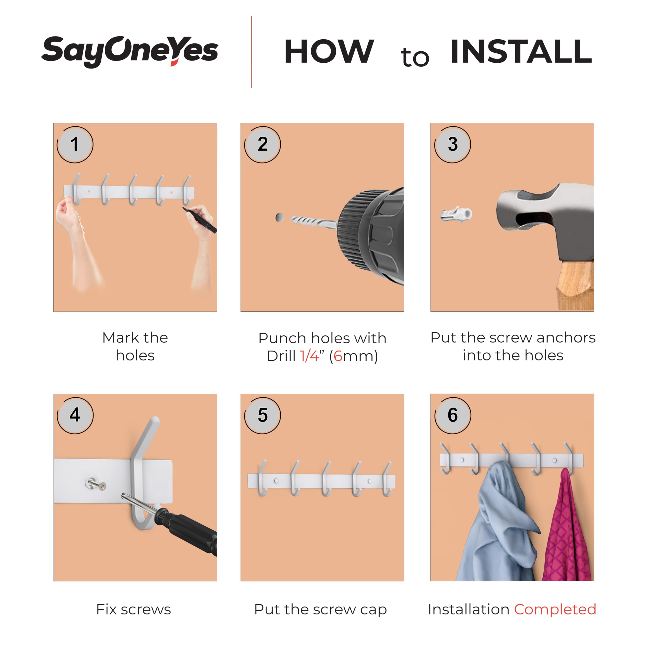 Montageanleitung:Richte die Garderobenleisten an der Wand aus und markiere dann die Punkte der Löcher an der Wand mit einem Bleistift.Bohre mit einer Bohrmaschine senkrecht Löcher an den beiden Markierungen.Schiebe den Kunststoffdübel in die Wand. Falls nötig, klopfe den Dübel mit einem Hammer hinein.Richte die Basis aus und stecke die Unterlegscheiben durch die Schraube. Führe die Haken-Schraube in den Kunststoffdübel ein und beginne, sie im Uhrzeigersinn zu drehen.Schraubkappen abdecken. -Spezifikationen:Markenname: SAYONEYES.Typ: Wandhaken-Garderobenleiste, Hut-Haken-Wandleiste, Wandhaken für Kleidung.Stil: Moderner, stilvoller Look.Anzahl der Wandhaken: 05Farbe: Weiss.Material: SUS 304-Edelstahl.Oberfläche: Matt. Installationsmethode: Wandmontage. -Lieferumfang:2 x Weisse Wandgarderobenleisten.4 x Dübel.4 x Schrauben.4 x Schraubkappen.1 x Bedienungsanleitung (evtl. nicht in deutscher Sprache).