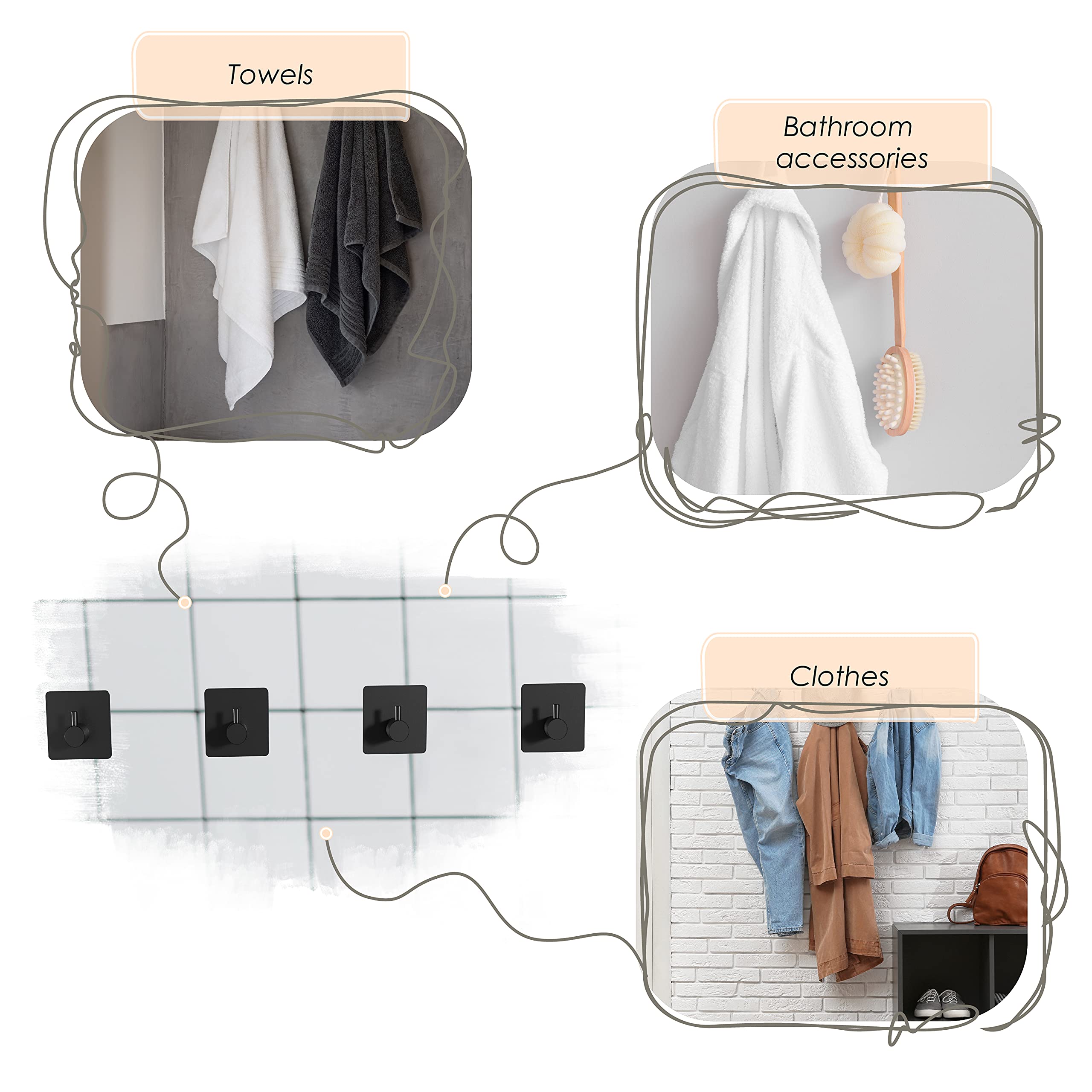 SAYONEYES Selbstklebende Handtuchhaken für Badezimmer, Wandtür, mattschwarz, SUS304 Edelstahl, starke Streifen, zum Aufkleben auf 3M-Wandhaken zum Aufhängen von Mantel, Hut, Tasche, Schlüssel, Jacke