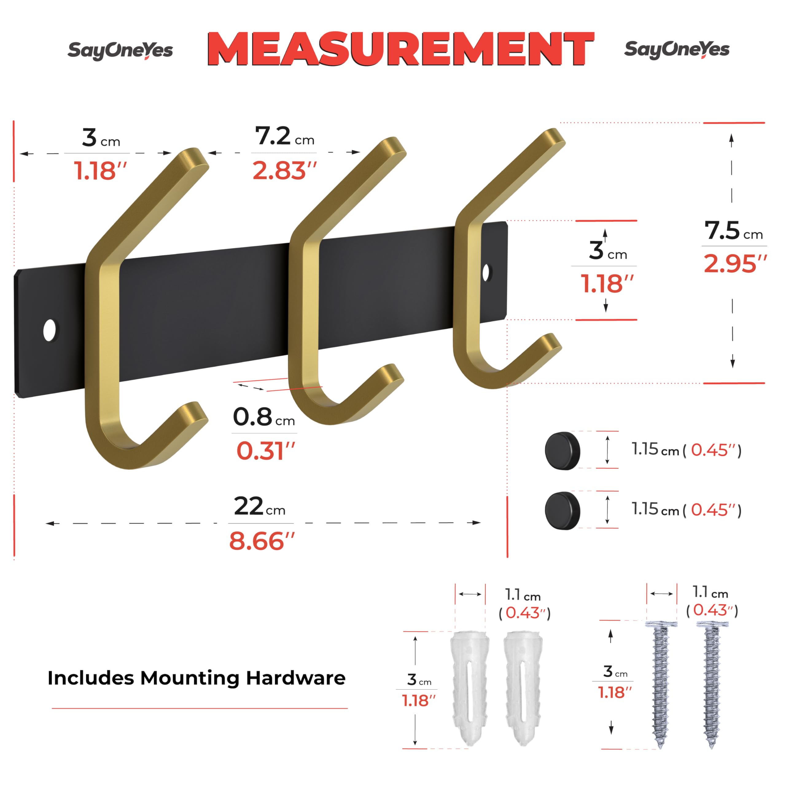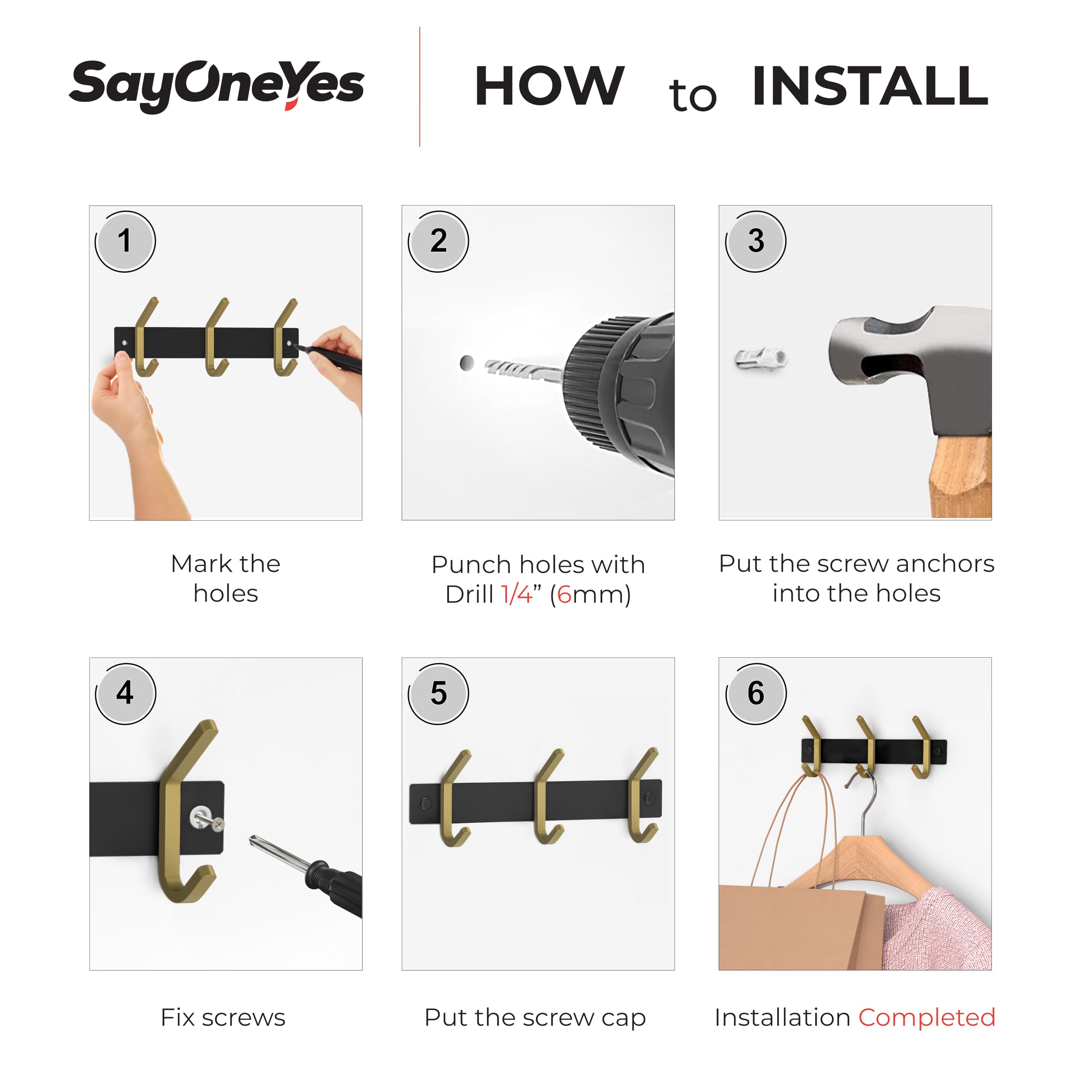 Montageanleitung: Richten Sie die Garderobe an der Wand aus und markieren Sie dann die Spitze der Löcher an der Wand mit einem Bleistift. Mit einer elektrischen Bohrmaschine vertikal an den beiden Markierungen bohren. Schieben Sie den Kunststoff-Spreizanker in die Wand, bei Bedarf klopfen Sie den Anker mit einem Hammer. Richten Sie die Basis aus und stecken Sie die Unterlegscheiben durch die Schraube. Stecken Sie die Hakenschraube in den Kunststoffanker und beginnen Sie, sich im Uhrzeigersinn zu drehen. Schraubverschlüsse abdecken. ♻ Spezifikationen: Markenname: SAYONEYES Produktname: Wandgarderobe Stil: Modern und stilvoll. Anzahl der Wandhaken: 03. Farbe: Schwarz und Gold. Material: SUS304 Edelstahl. Oberfläche: matt. Tragkraft: 10 kg. Installationsmethode: Wandmontage. Lieferumfang: 1 x Wandgarderobe. 2 x Anker. 2 x Schrauben. 2 x Schraubenabdeckungen. Bedienungsanleitung (evtl. nicht in deutscher Sprache).